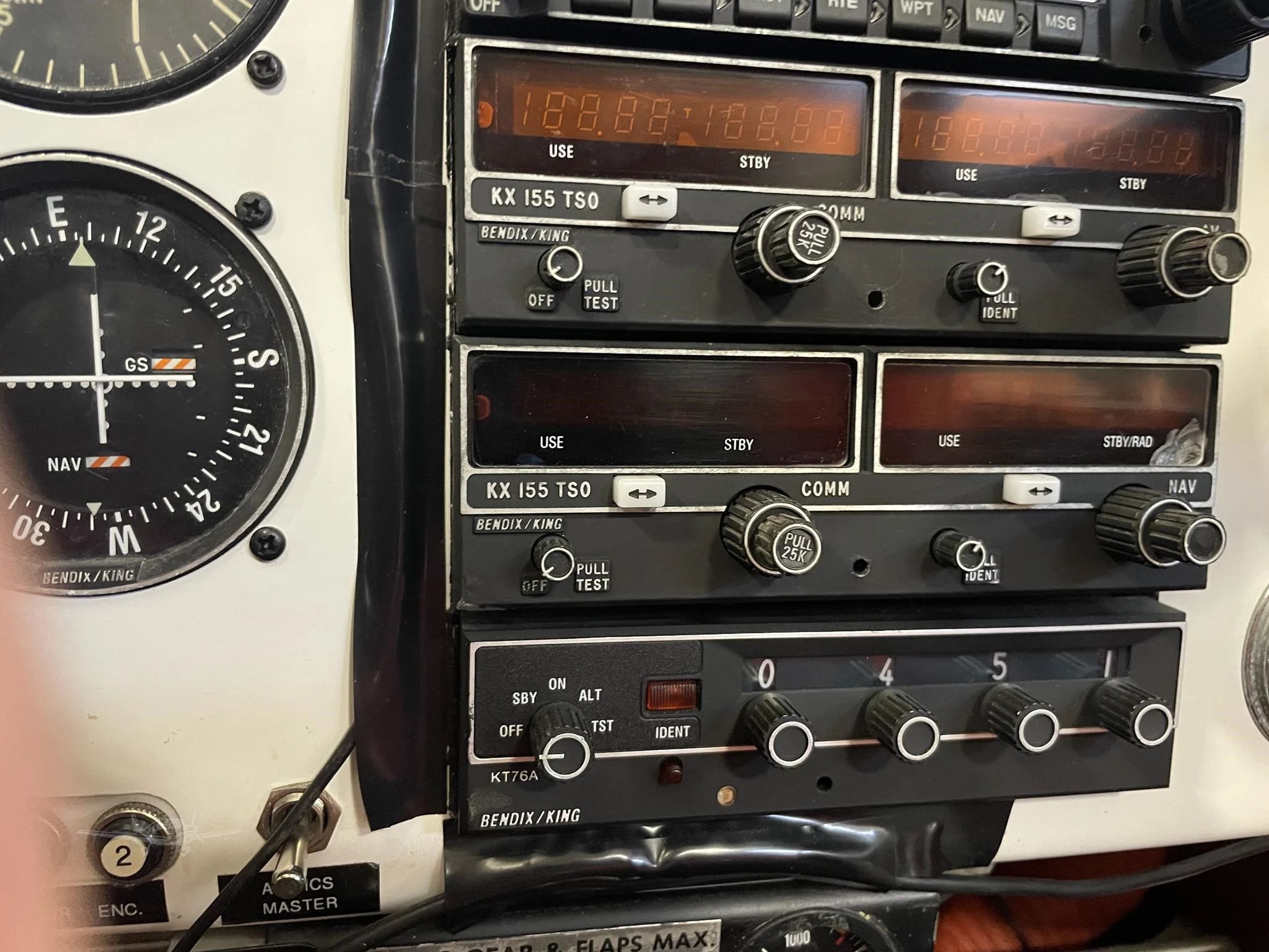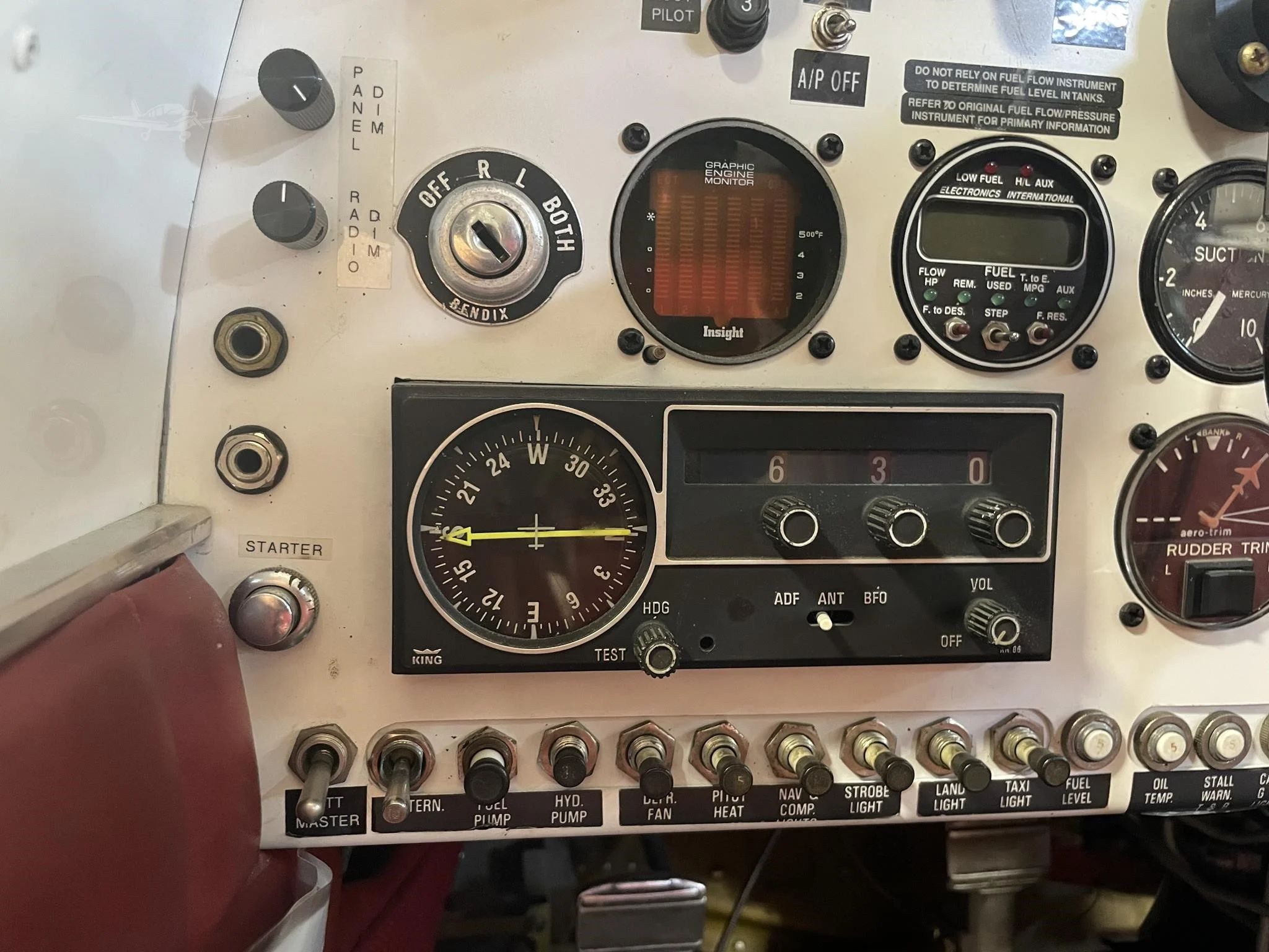 2 Axis Auto pilot Engine Monitor (Insight) King 155 Dual Nav Comms Garmin 150XL Panel Mount GPS Garmin 196 Yoke Mount GPS Storm Scope WX-8 EI Fuel Flow / Pressure EI Digital RPM EI Digital Manifold Pressure CD Player Transponder |