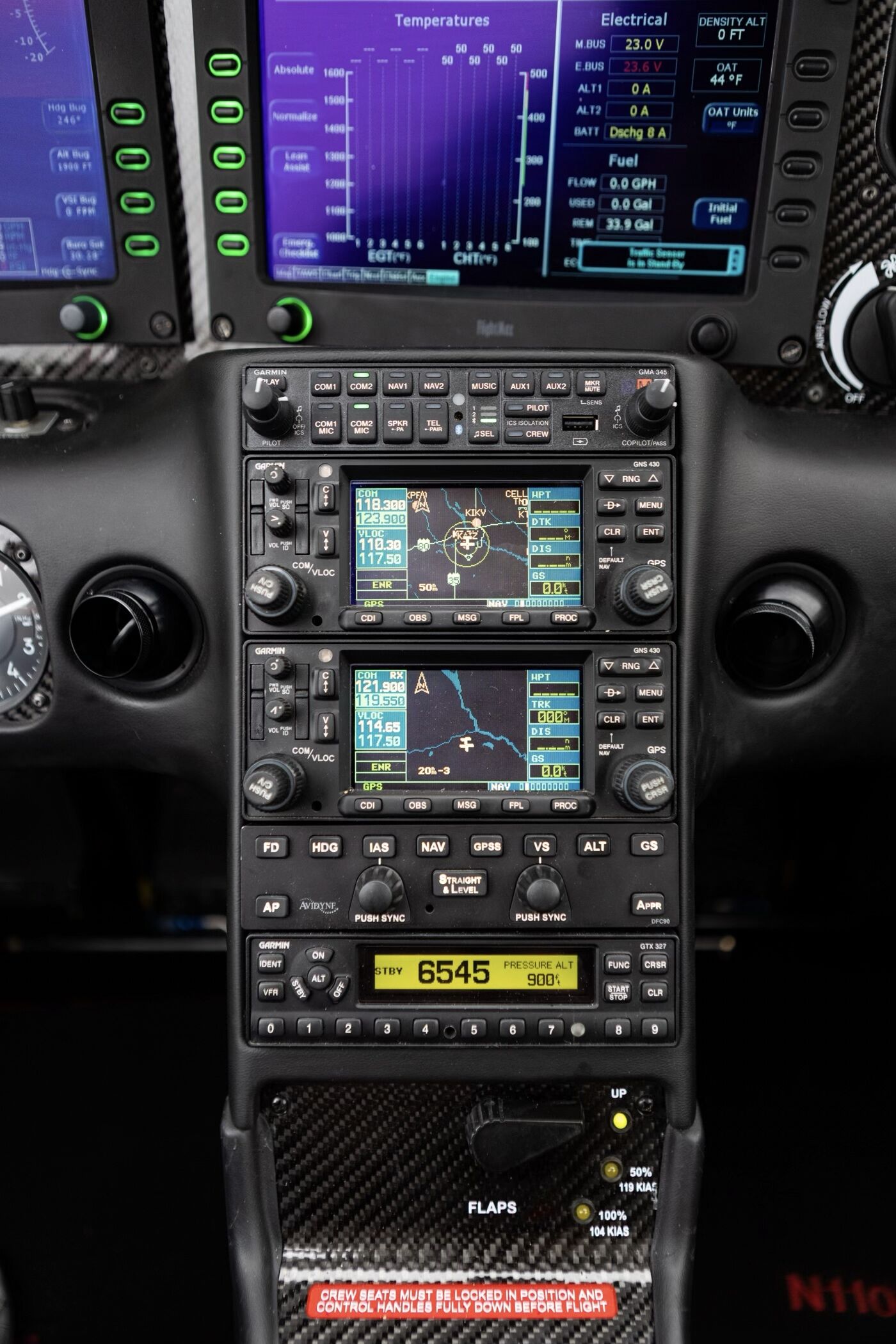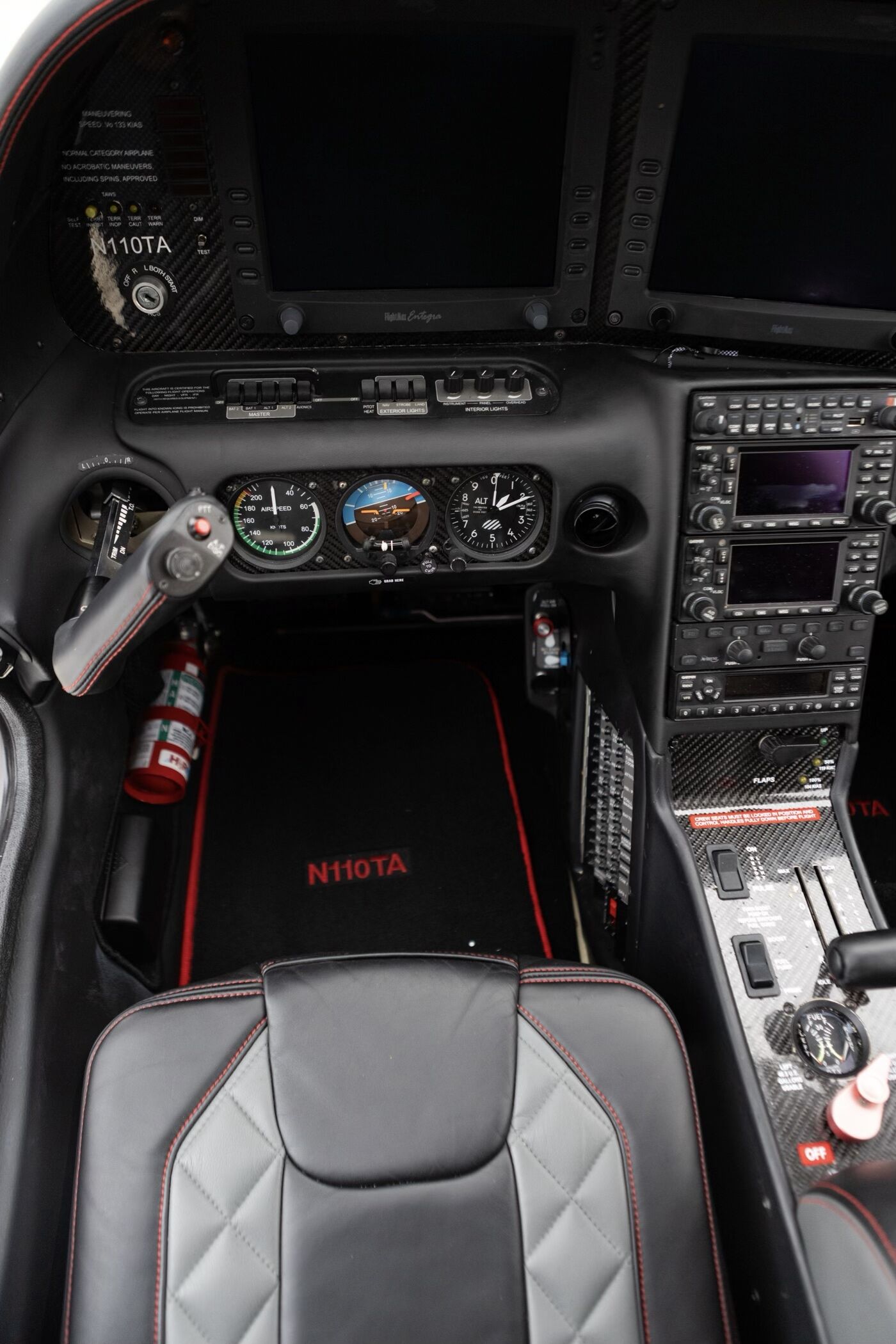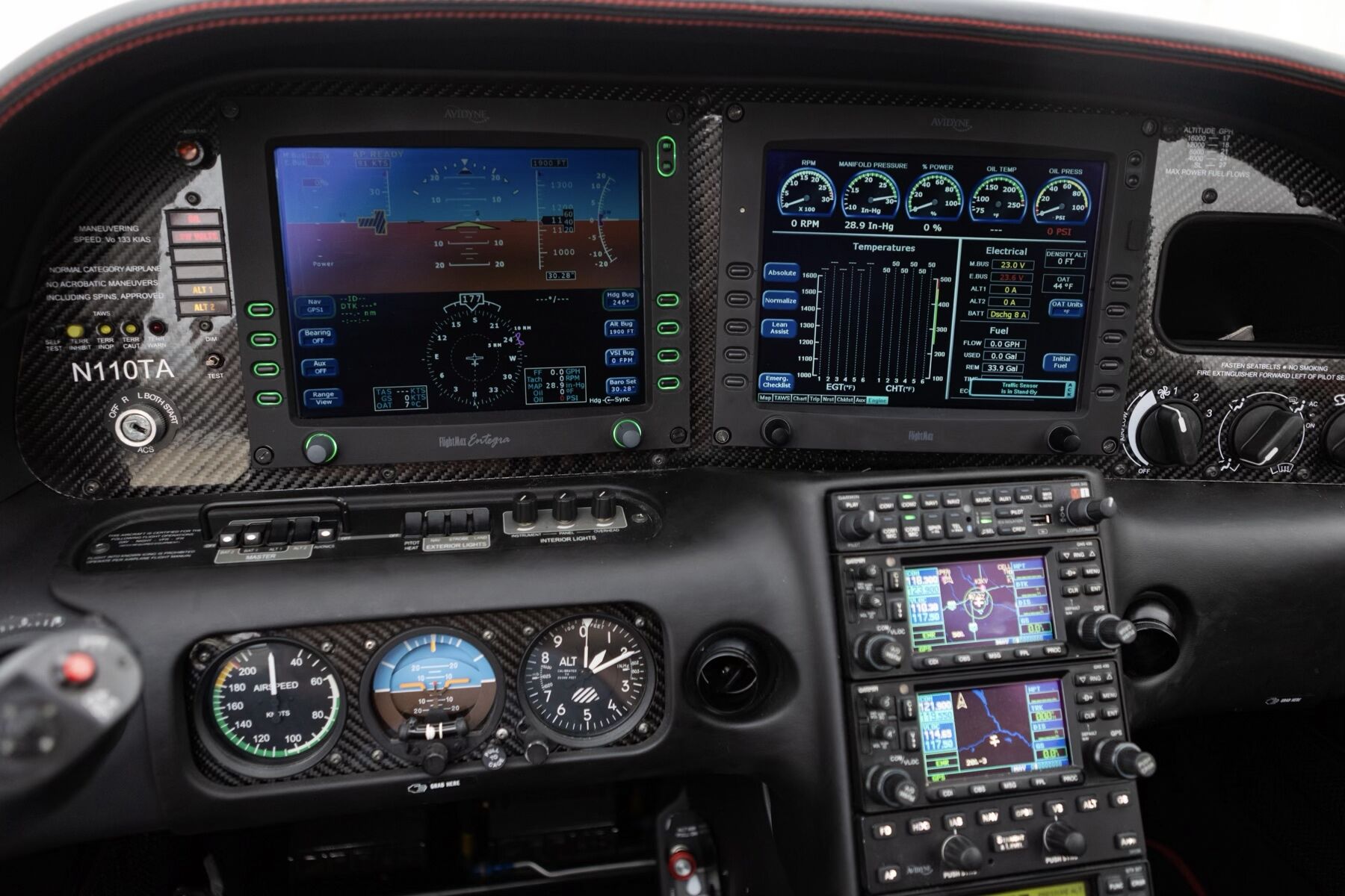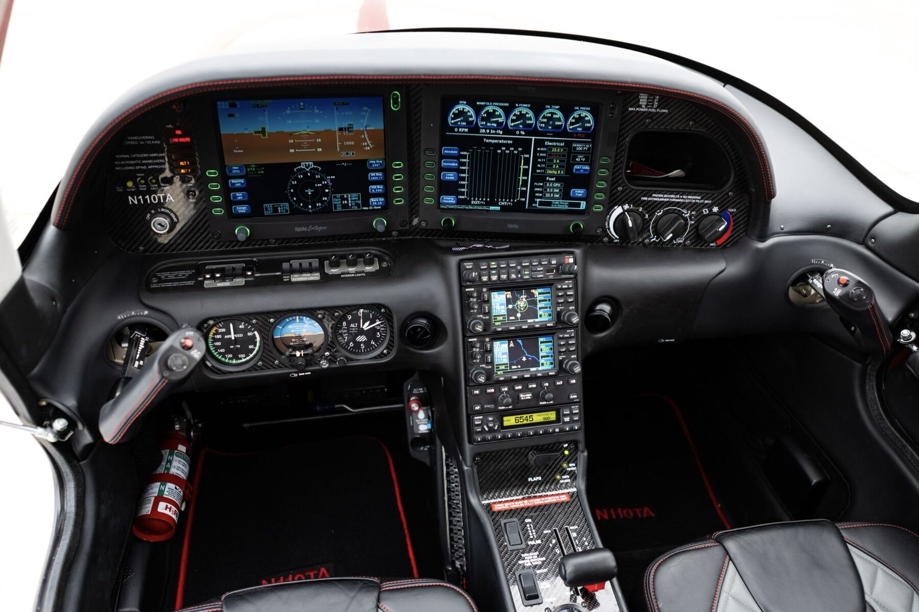 Avidyne Entegra EX5000 PFD/MFD L3 Skywatch Traffic Information L3 Stormscope Lightning Detection XM Datalink Weather XM Audio Entertainment Honeywell KGP-560 Terrain Awareness Warning System (E-TAWS) Engine & Fuel Monitoring (EMax) Electronic Approach Charts (CMax) Garmin GMA 345 Audio Panel Garmin GNS 430W GPS/NAV/COM WAAS Garmin GNS 430 GPS/NAV/COM Avidyne Digital DFC90 Autopilot Flight Director Garmin GTX 327 Transponder Garmin GDL 82 ADS-B Out Transceiver |