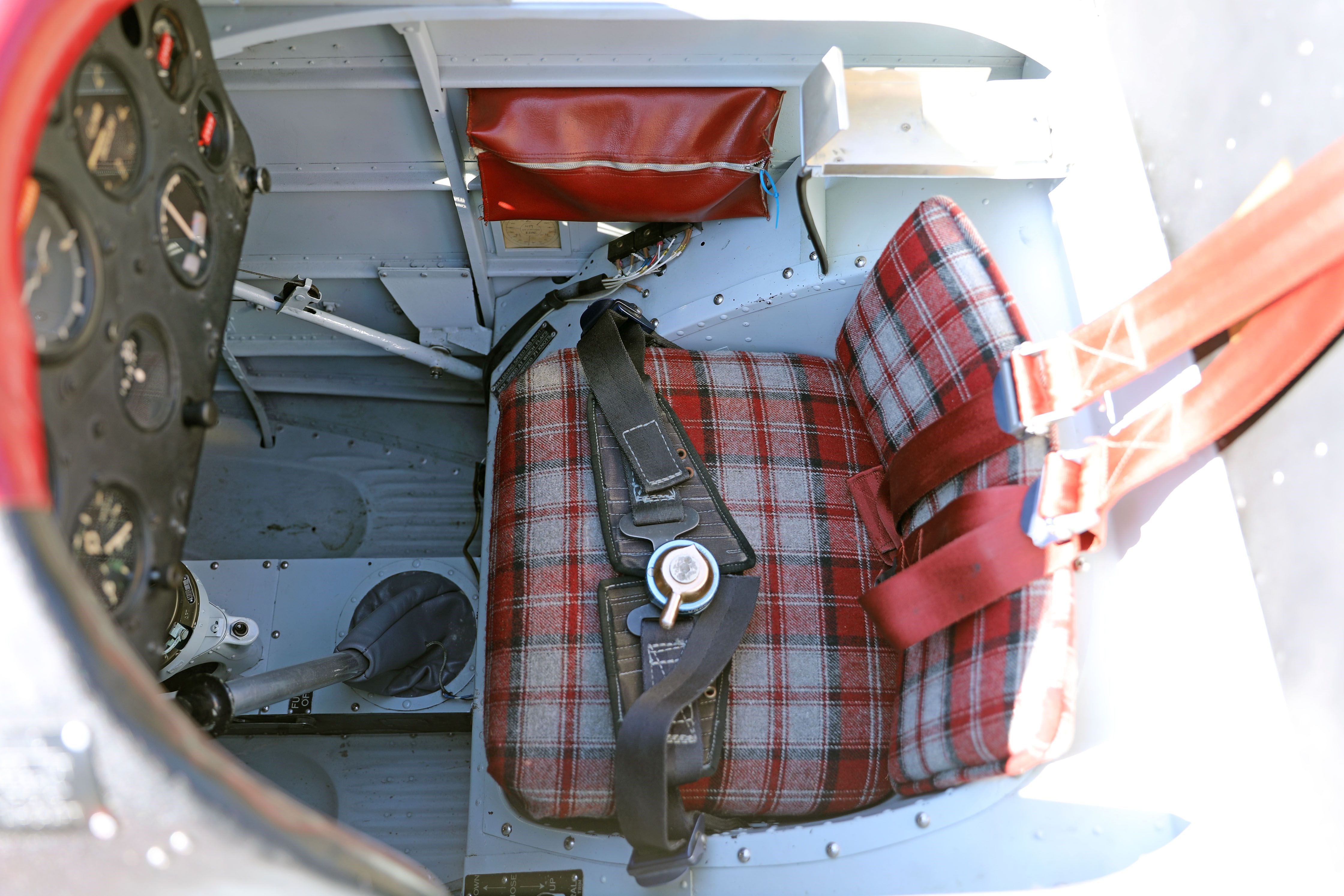 2001 refurbishment Light gray interior metal side panels and flooring Pilot and copilot plaid fabric seats with multi-point harnesses Pilot and copilot right side red vinyl zippered storage pouches Aft copilot storage hutch (40 lb. capacity) Condition 7 (Professional Aircraft Appraisal Organization Interior Grading Guide) |
