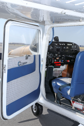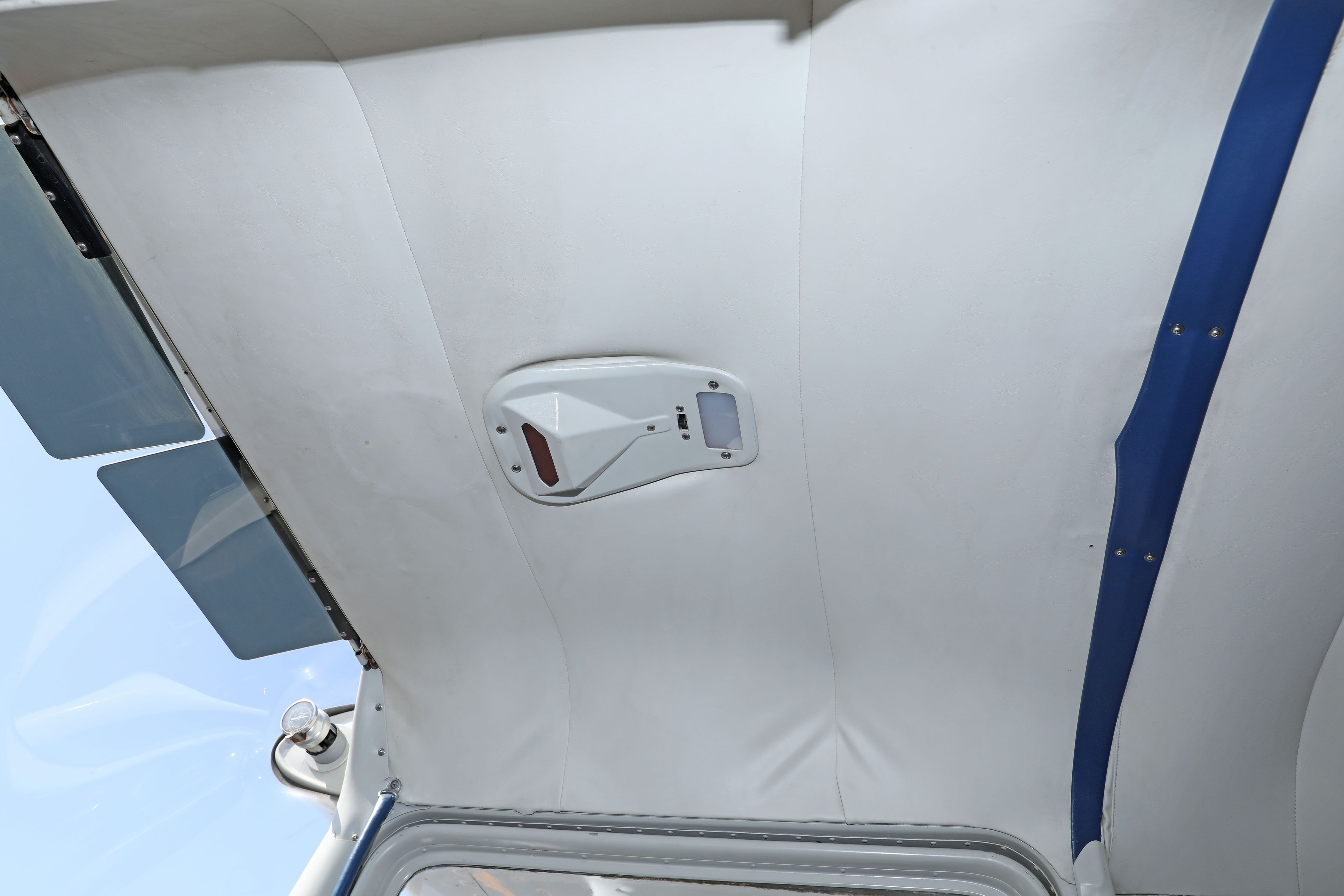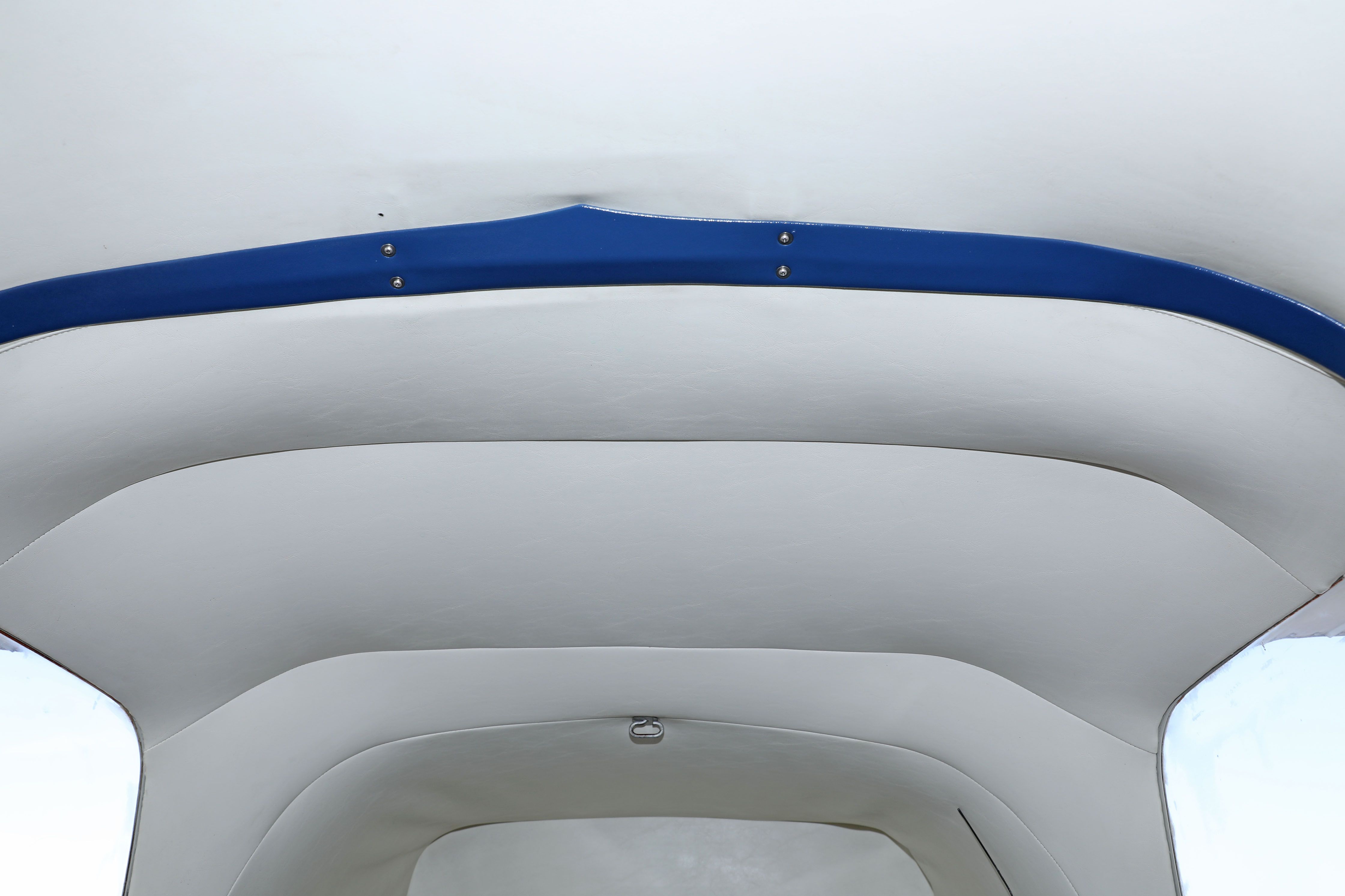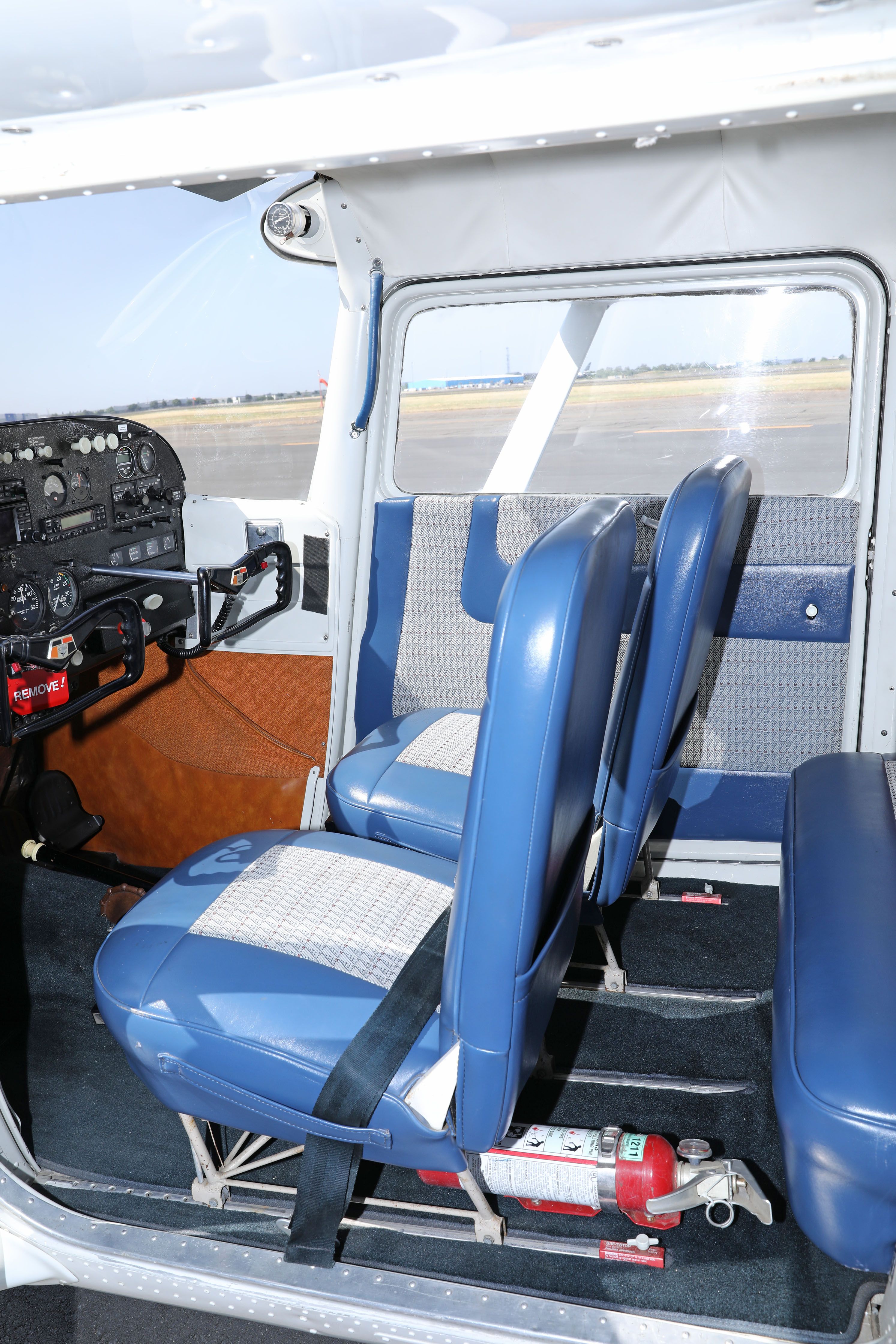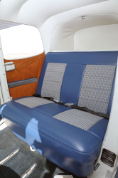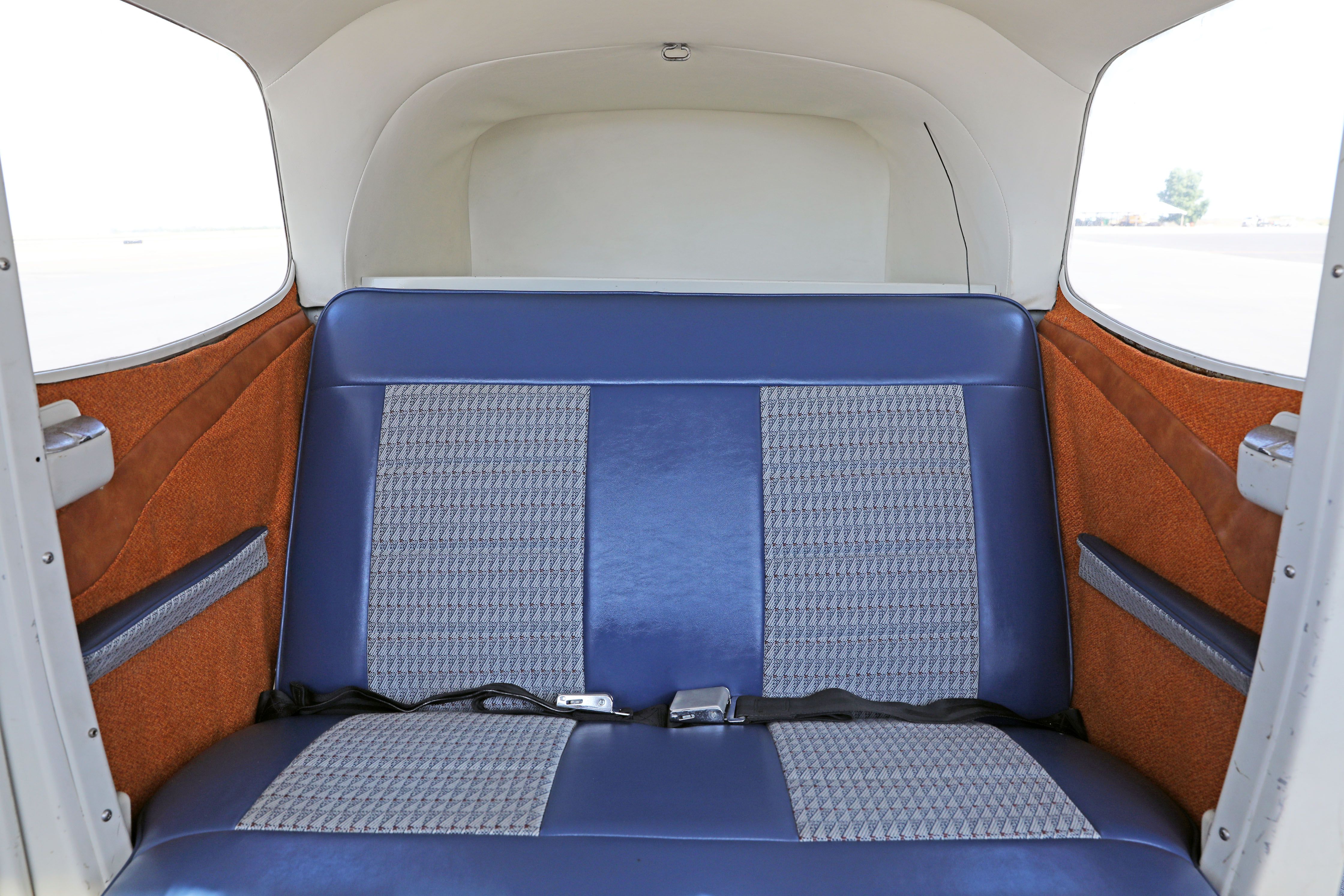 Interior refurbished 05/10/2011 with burn derts White textured vinyl headliner White metal window trim Textured blue vinyl and fabric door panels Forward and aft brown tweed fabric and vinyl side panels Pilot and copilot articulating blue textured vinyl and fabric seats with lap belts Aft cabin blue textured vinyl and fabric bench seat with folding seat back and lap belts Overhead forward dimming map/instrument light Overhead switchable cabin light Overhead cabin speaker Forward cabin upper air vents at wing roots Airtex black floor carpeting installed Spacious aft cabin cargo/baggage area with hat shelf and hanger eyelet Condition 7 (Professional Aircraft Appraisal Organization Interior Grading Guide) |