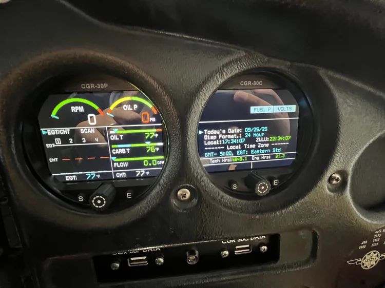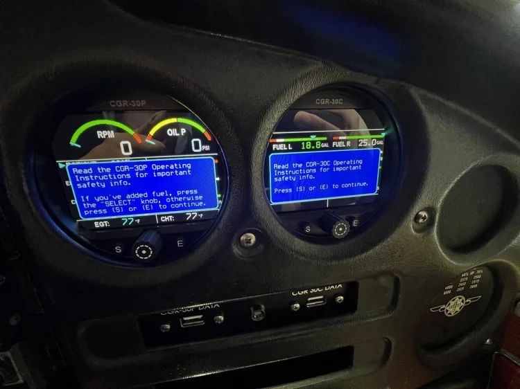 Dual EI CGR30C/P engine monitors (includes USB data ports) S-Tec 30 auto pilot (connected to turn coordinator & GPS, with altitude and heading) Dual Narco VOR units with one having the localizer/glideslope Stratus ESG Transponder ADS-B in and out Dual KY97A digital com radios Garmin 155XL GPS Terra audio panel KN64 DME |
