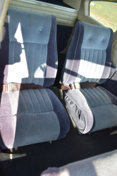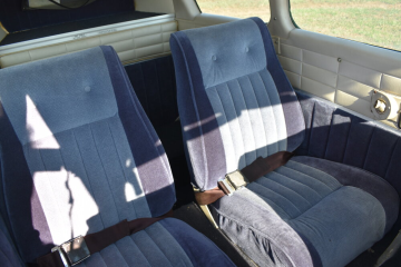 | 8/10 - Two Tone light and dark blue seats, dark blue carpet, two tone blue and white sidewalls. Plastic trim is in good condition. Overall interior is in good shape just dated. | |