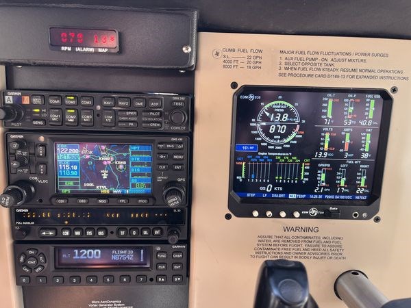 Garmin GMA 340 Audio Panel with 3LMB and Intercom Garmin G500 Color PFD Garmin GNS 430W Color IFR Moving map GPS/Com with WAAS Garmin GI 209 Glide slope/VOR/Localizer indicator Garmin GTX 345 Transponder with ADSB in and out Garmin SL 30 digital Nav/Com EDM graphic primary engine management system Electric trim Dual push-to-talk buttons Remote digital RPM and Manifold pressure gauge Electric Trim Outside air temp gauge Avionics master switch Dual 12 volt USB power outlets Two Lightspeed Headsets |