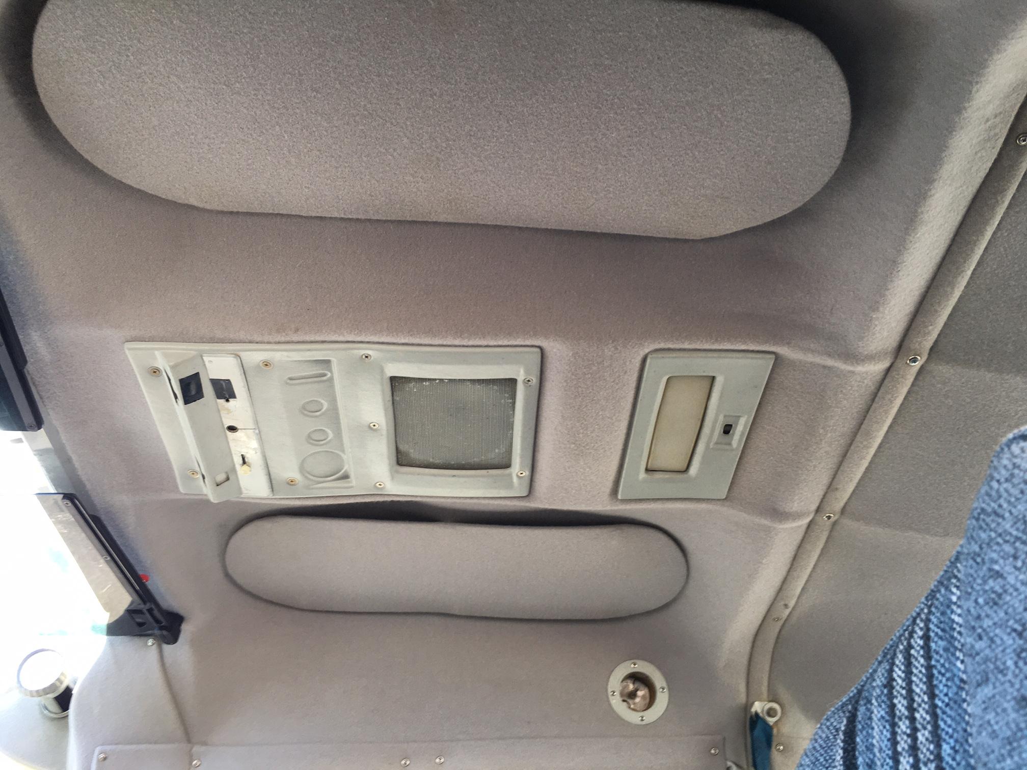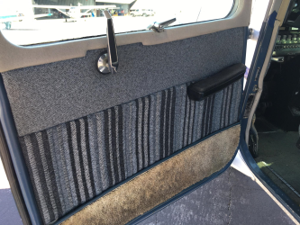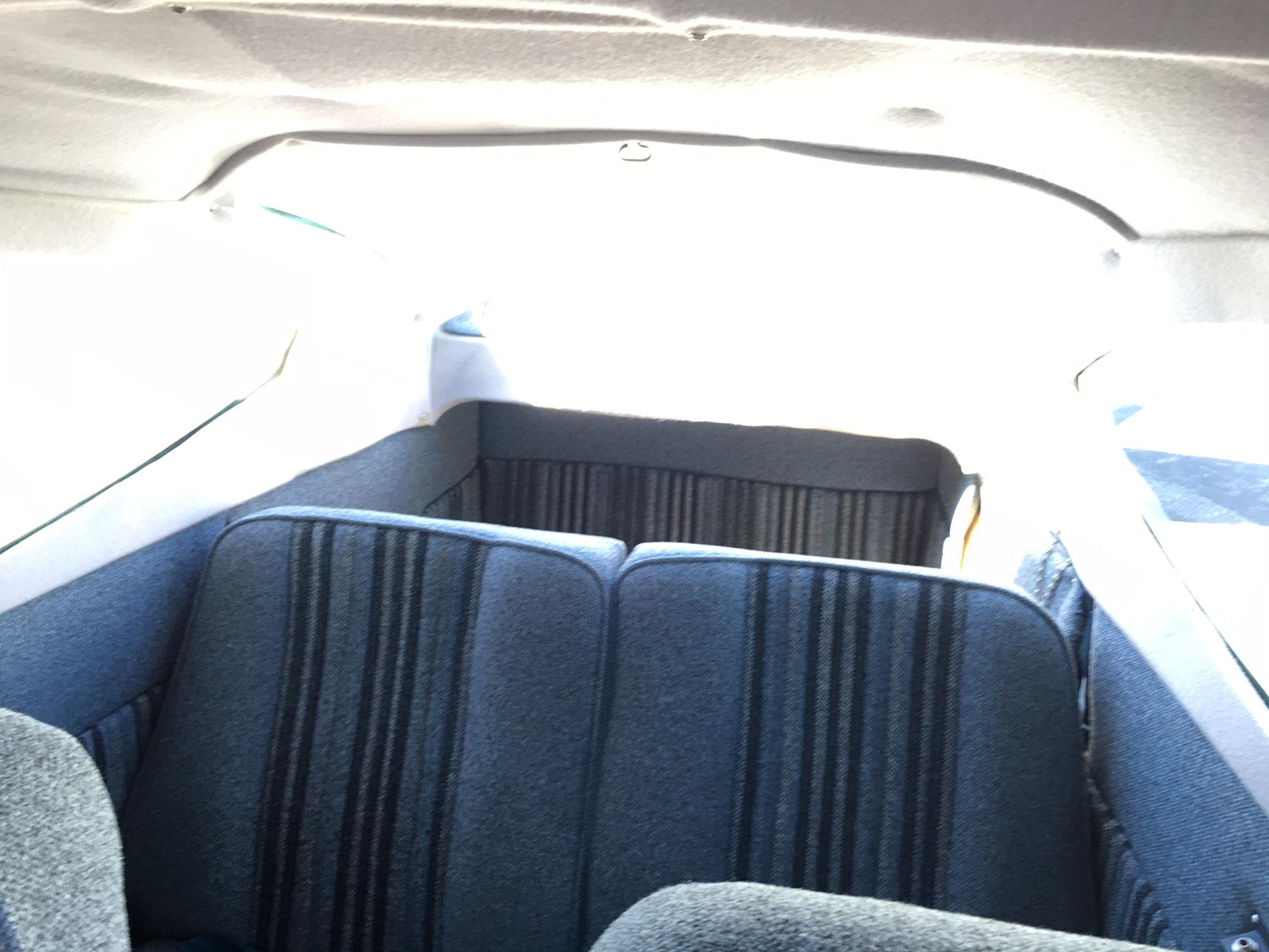 | Blue fabric seats with accented center strip, matching door and side panels. Gray wool headliner. Blue carpet. Overall good but some minor rear. Rated 8 out of 10. | |
