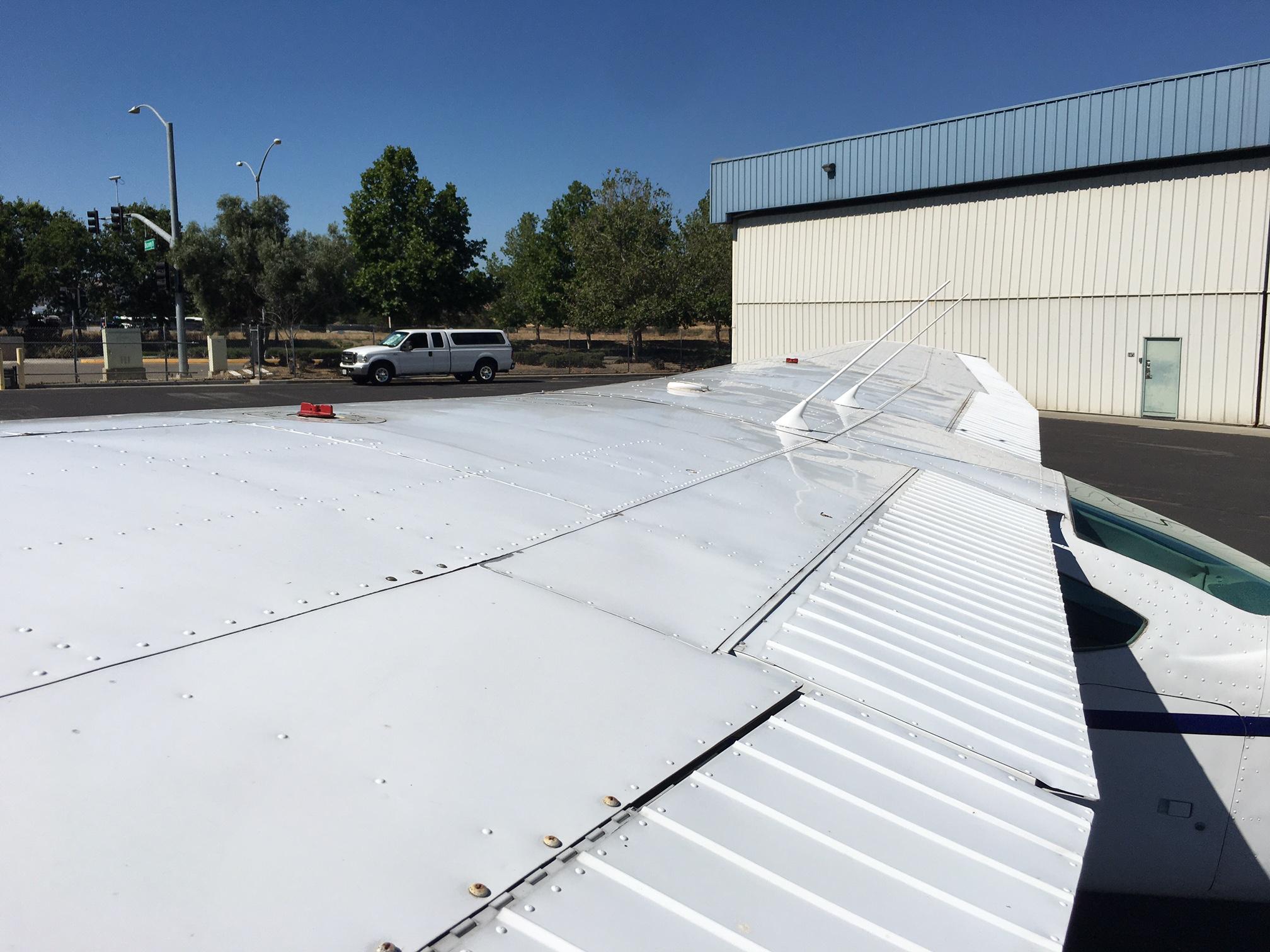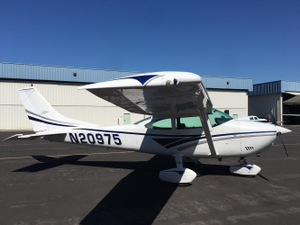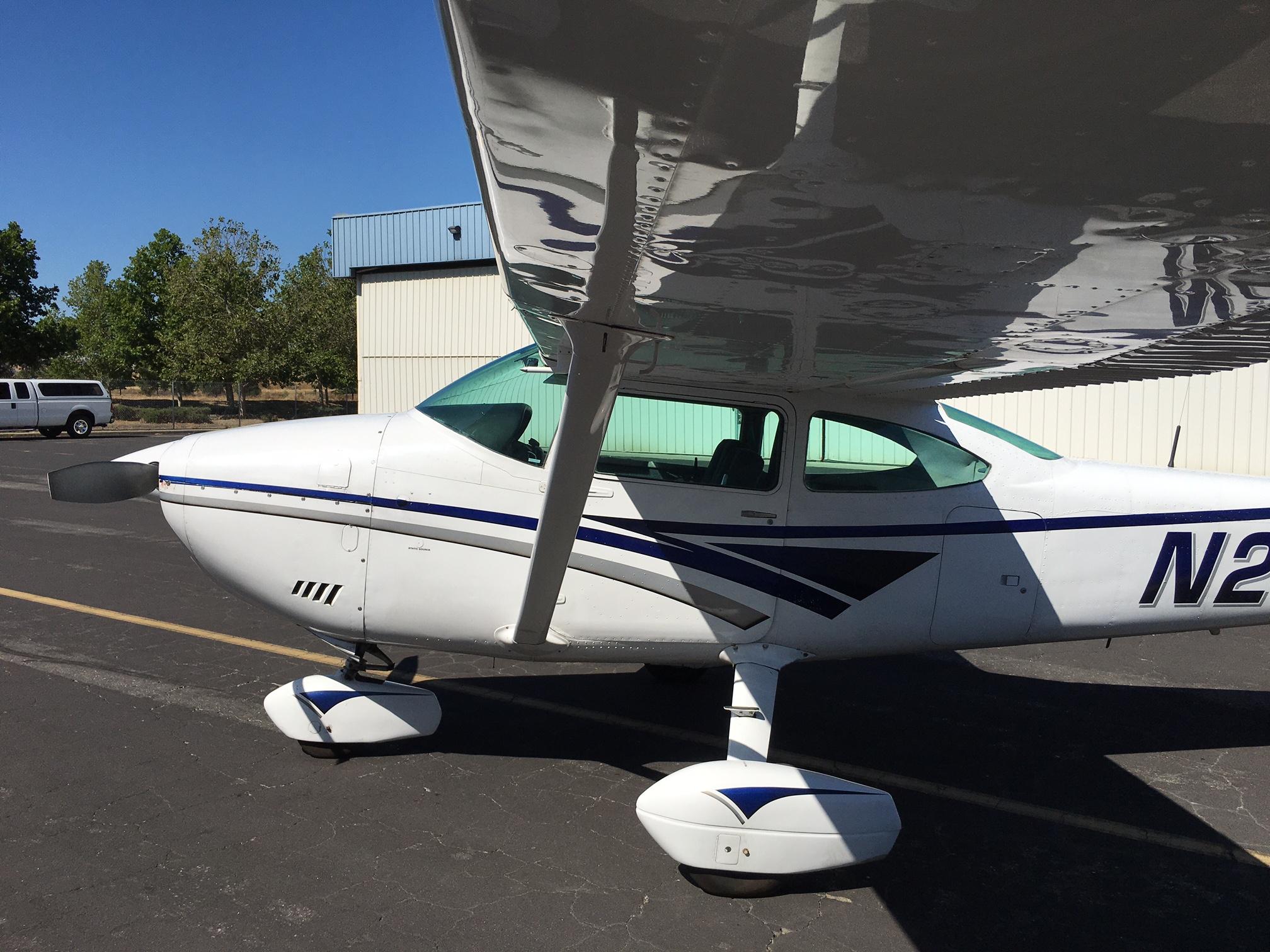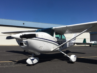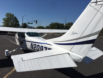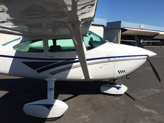 | Overall bright white with factory 1997 Cessna 182 Scheme with blue and gray accents. Simple and attractive and makes the plane look newer. Paint rated 8 out of 10. | |