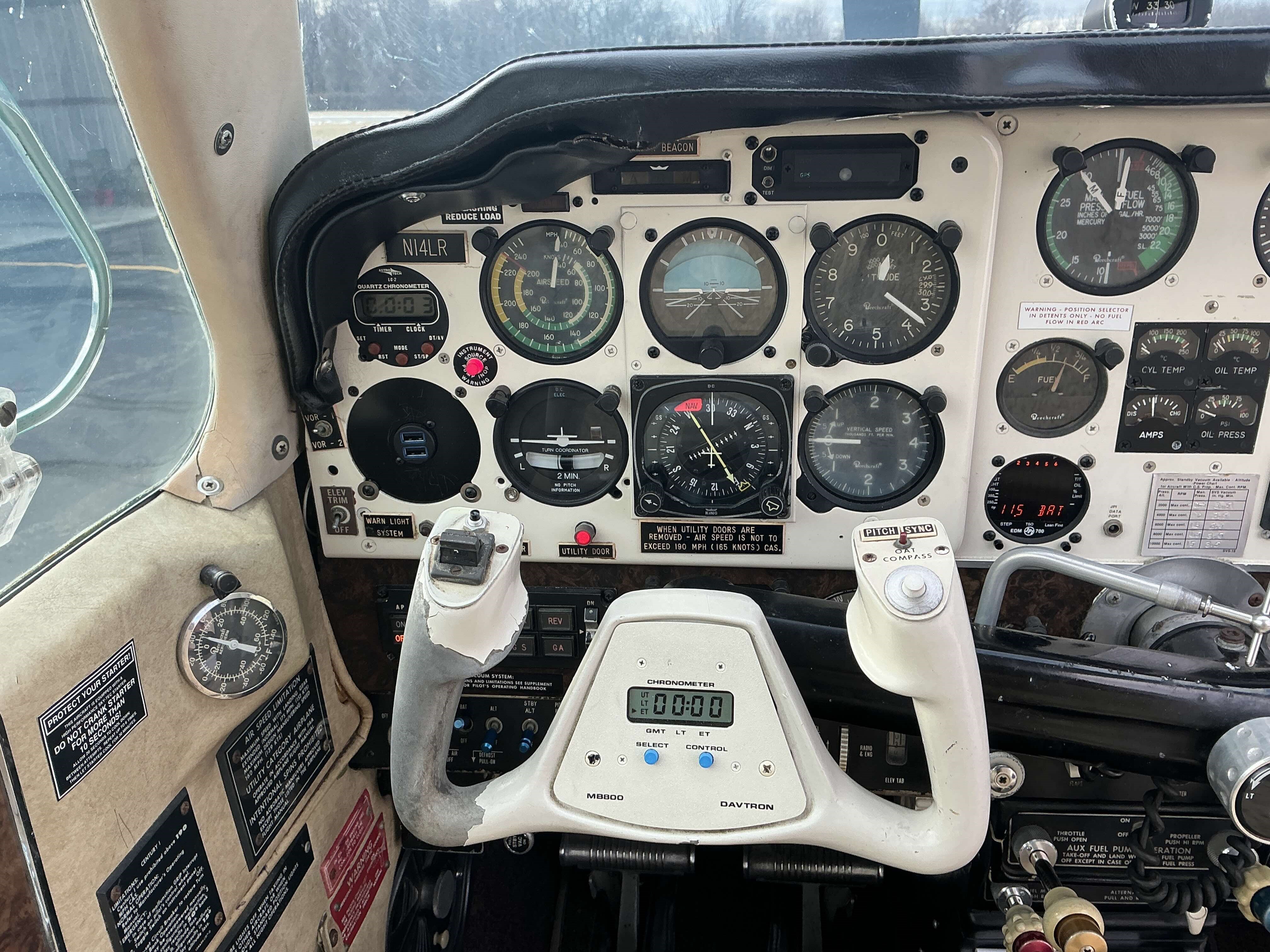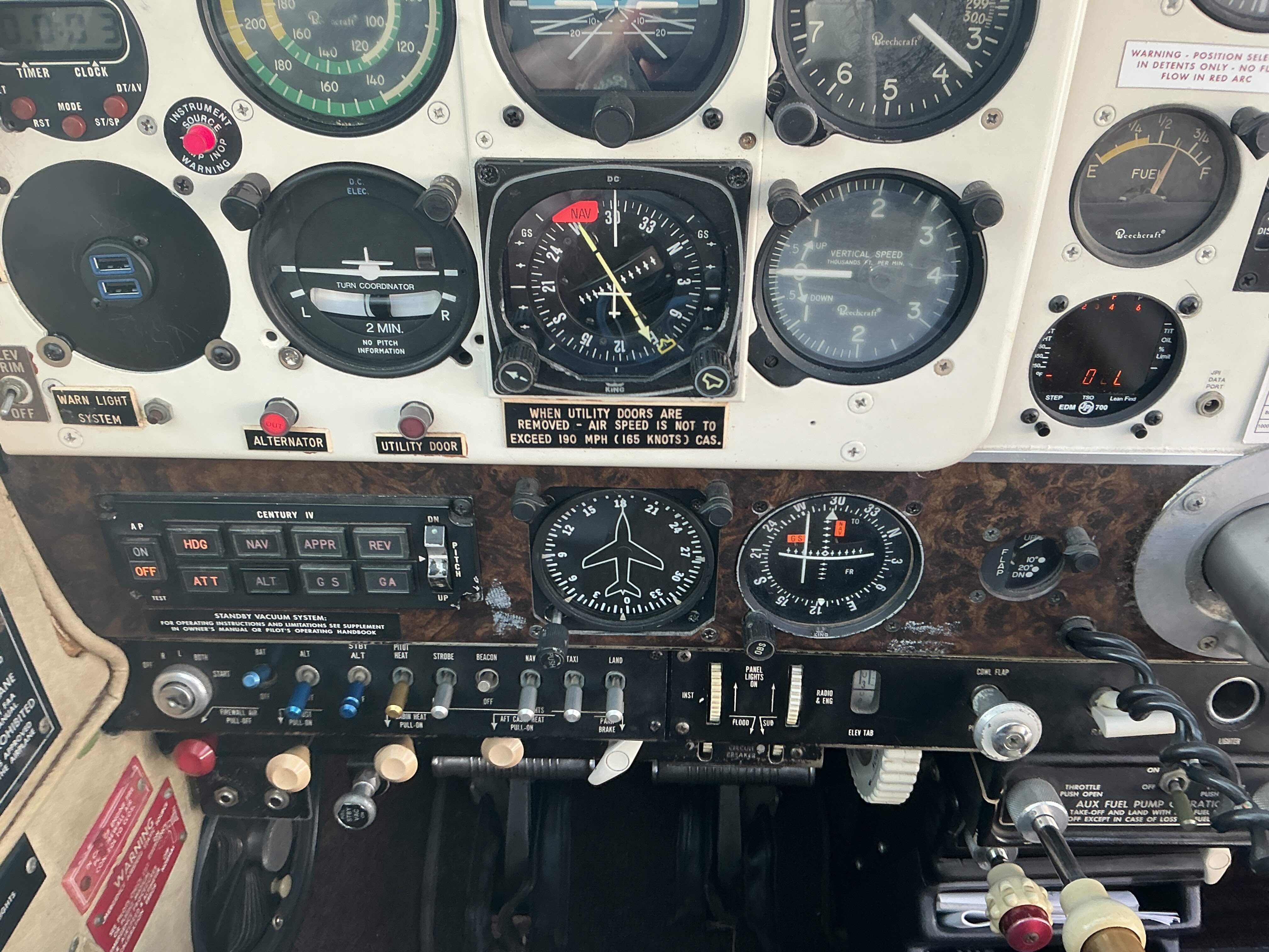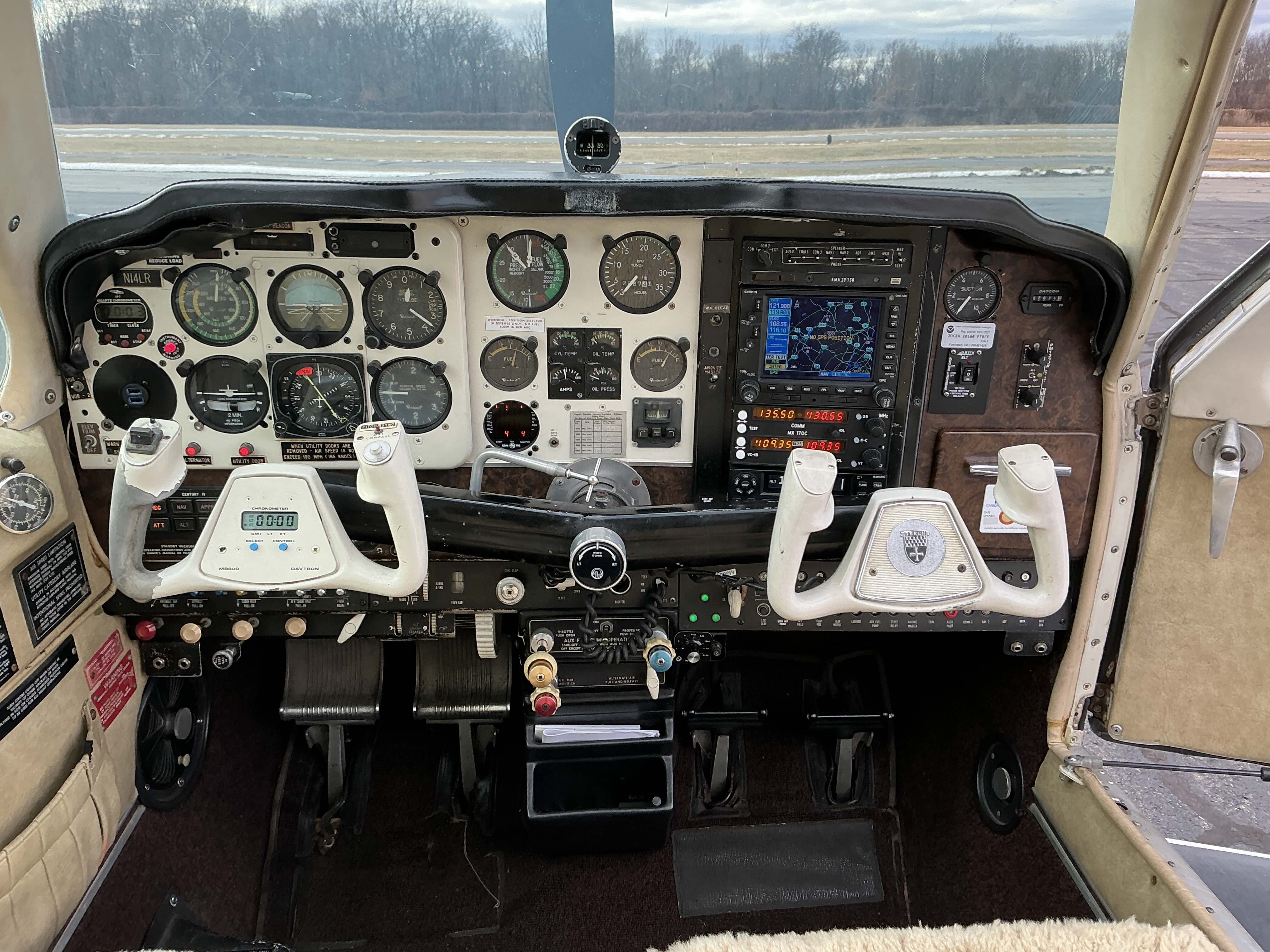 Century IV Autopilot King KMA-20 Audio Panel / Avionics Master Switch Garmin GNS-530 WAAS MX-170C Nav / Comm Garmin GTX-345 ES Transponder ADS-B In / Out / WiFi for eight devices Garmin 496 (combination yoke holder for iPad) JPI EDM-700 Engine Monitor 406 Mhz ELT registered with NOAA 3M WX-500 Stormscope / Displays on Garmin 530 Sik Place Intercom |