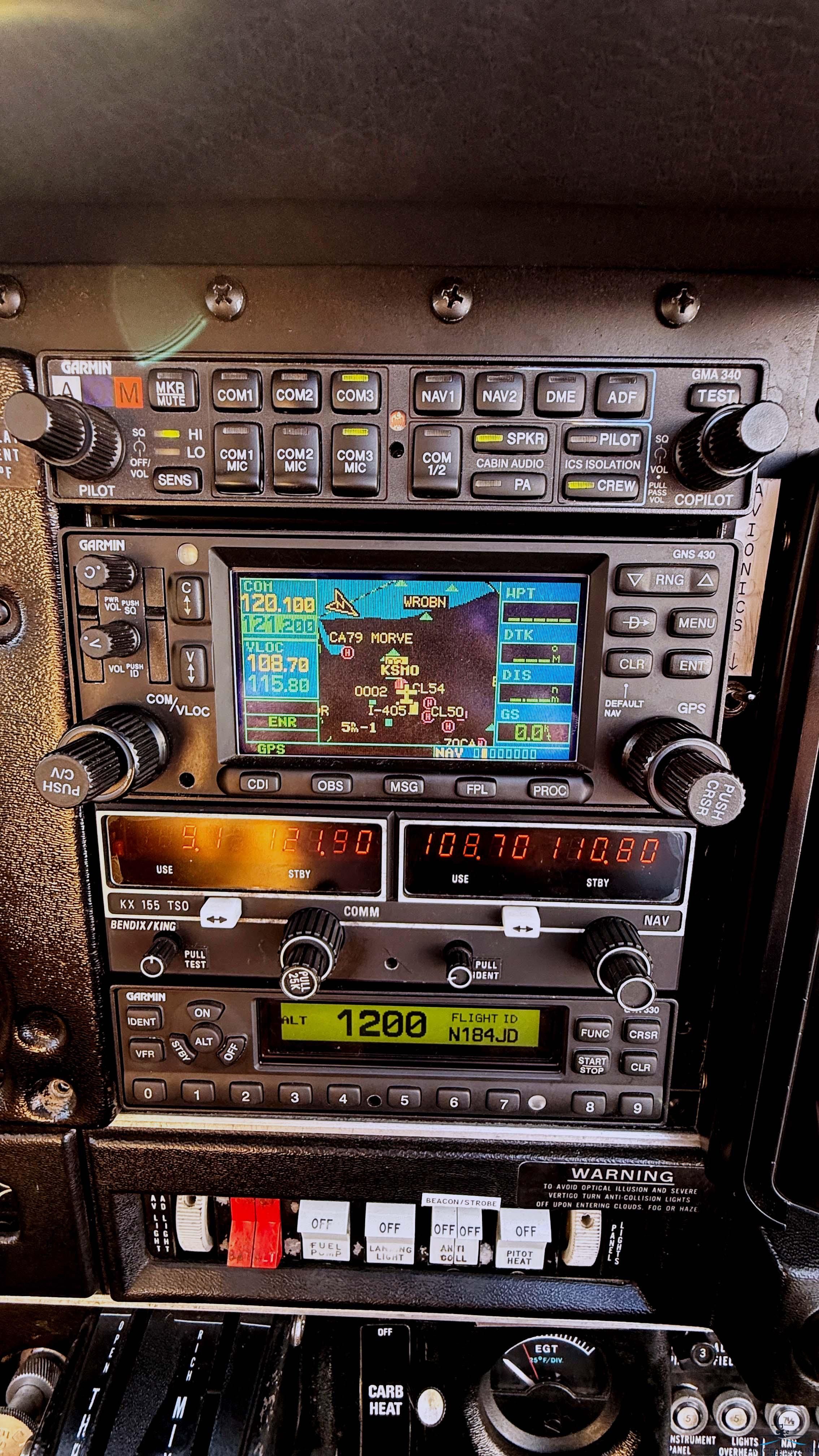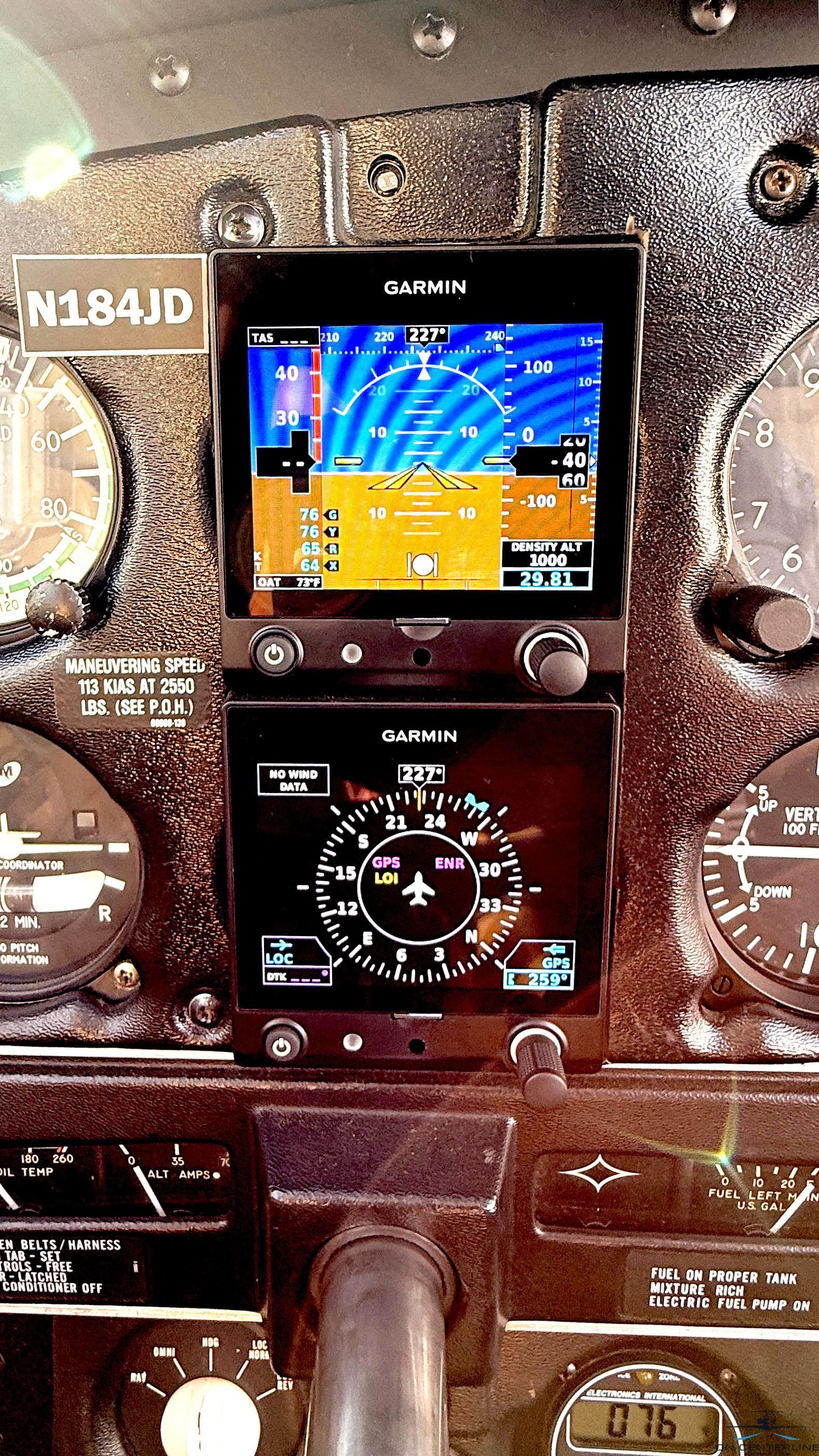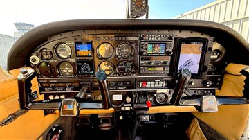 Dual Garmin G5s (no vacuum system) Garmin GMA 340 audio panel Garmin GNS 430W King KX 155 Nav/Comm 2 Garmin GTX 330ES ADS-B Out Century IIB autopilot (inop) no analog ADI EI CGR-30P engine monitor Garmin Area 796 (VFR Only) Garmin GDL 39 3D ADS-B in |