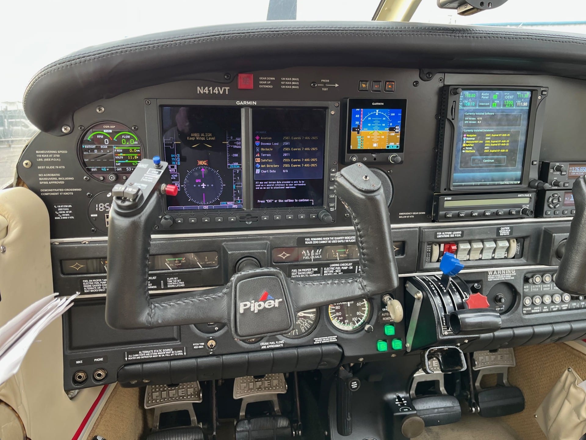 Garmin G500 PFD/MFD Garmin G5 Standby Electronic Flight Instrument Garmin GTN750 Touchscreen IFR GPS/NAV/COM Garmin GNC255 NAV/COM Garmin GTX345 ADS-B In & Out Transponder S-TEC 55X Autopilot Electronics International CGR30P Engine Monitor Vertical Card Compass |