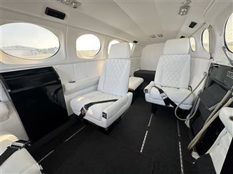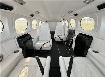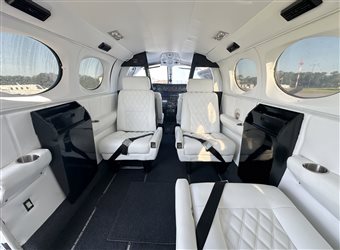 | Seven Total Seats, Executive Four Place with Dual Black Writing Tables Fifth Rear Cabin Chair and Belted Lav Seat. White Leather with Diamond Stitched Centers, Black Carpet and Black Accents. | |