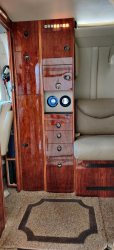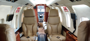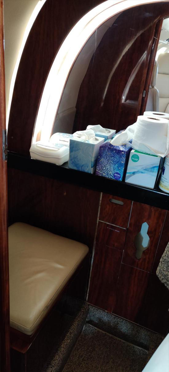 Interior: Configuration/PAX: Executive/8 passengers Air Conditioning: Freon General: Fireblocked Seating: Forward RS 3-place side-facing divan, forward LS single seat & aft 4-place club upholstered in light gray leather, sheepskin- covered crew seats Headliner: Off-white ultraleather headliner Sidewalls: Off-white ultraleather upper window panel Carpet: Medium gray carpeting Refreshment: Forward RS refreshment center w/storage Cabinetry/Wood: Dual pullout executive tables Entertainment: CD player, B&D cabin display, Airshow, dual DVD players, XM satellite radio, Sennheiser 3-channel wireless headsets, three video monitors Lavatory: Enclosed aft lav |