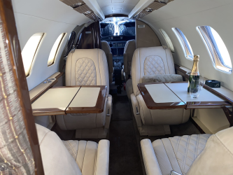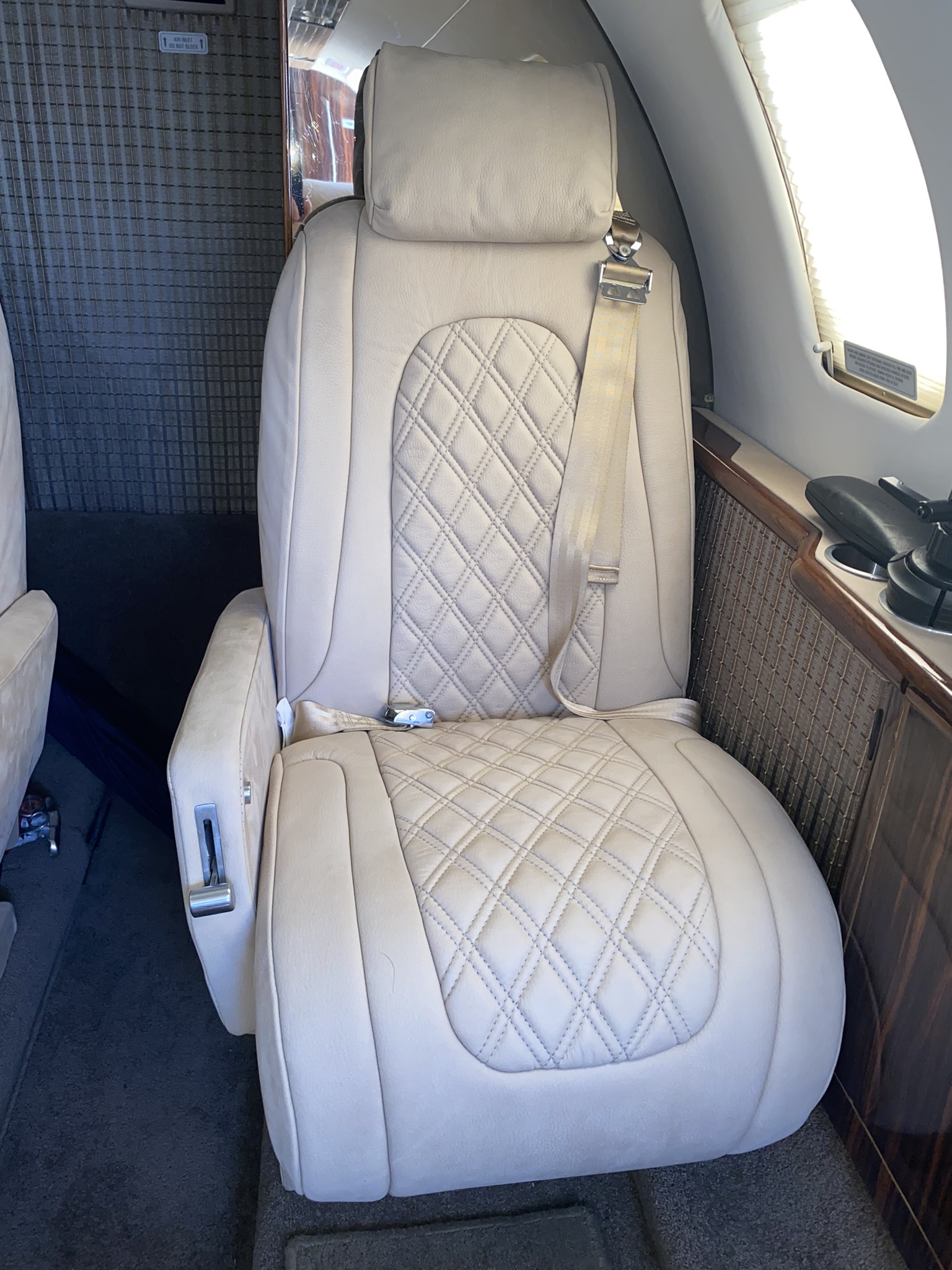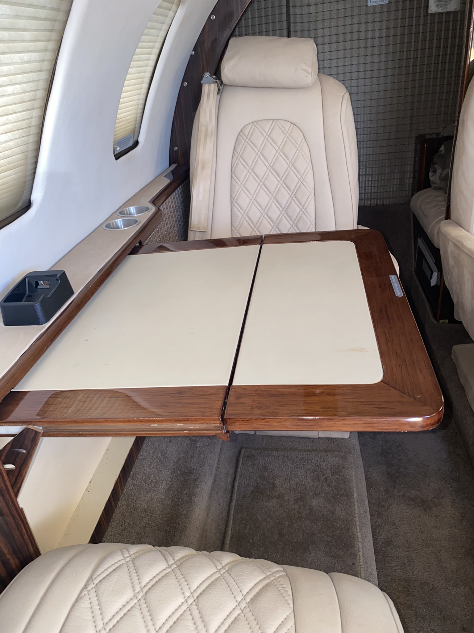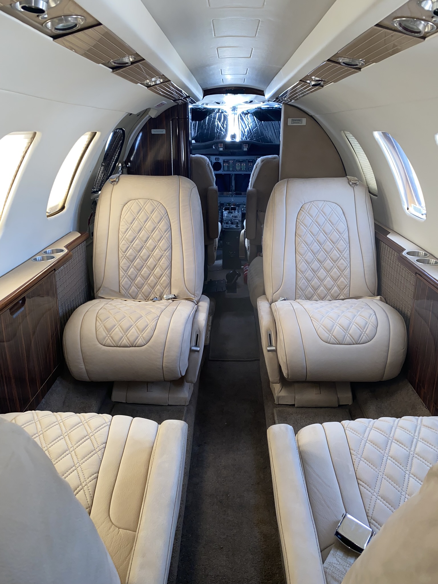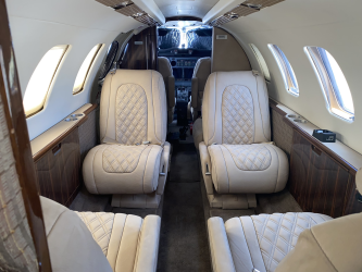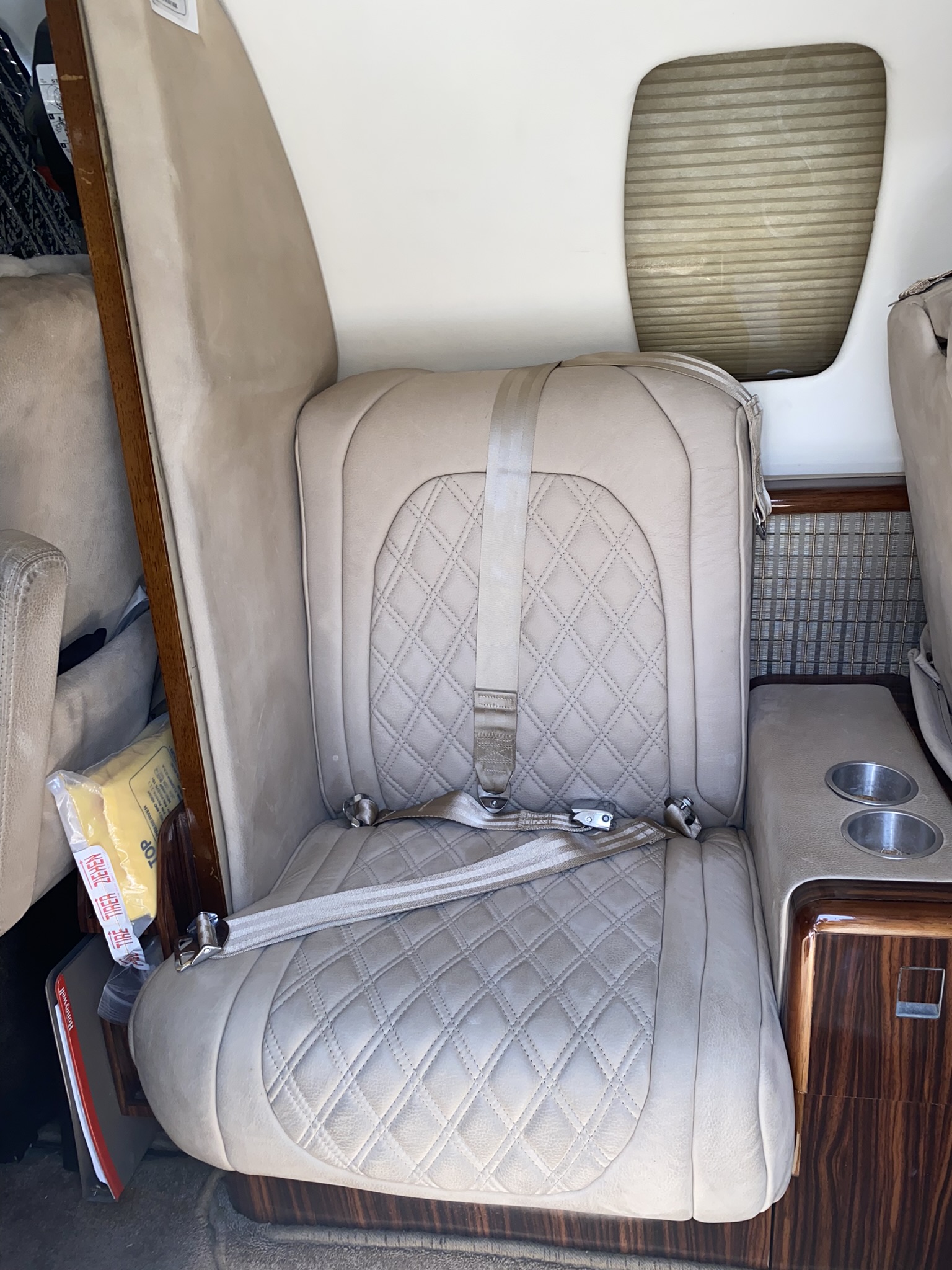 | MID-CABIN 4-PLACE CLUB, FORWARD RIGHT HAND SIDE-FACING BELTED SEAT, AFT LEFT HAND SIDE-FACING FLUSHING BELTED LAV, FORWARD LEFT HAND DELUXE REFRESHMENT CENTER, LEFT AND RIGHT EXECUTIVE TABLE TOP W/ LEATHER LEAF. NEW TOWNSEND LEATHER DELUXE NUBUCK COWHIDE FIREWOOD PASSENGER SEATS W/DIAGONAL PATTERN INSERTS (INCLUDING ALL FOAM), PILOT & COPILOT SEATS ARE SHEEPSKIN LIGHT CAMEL WITH NEW MATCHING TAN SEAT BELTS. | |