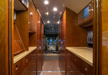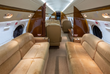 (Interior last refurbished in 2007 by Gulfstream Appleton, Upper Sidewalls Re-Upholstered 2013, and Main Cabin Carpet Replaced 2019) This sixteen (16) passenger floor plan features three distinct passenger cabin areas with a forward crew lavatory, a spacious forward galley, and aft lavatory. Forward Galley: Features a crew lavatory, Hi Temp Oven, and Aerolux Espresso Maker, Forward Cabin: 4-place club seats with fold out tables. Mid Cabin: 4-place conference group opposite credenza. Aft Cabin: Dual 4-place divans. |