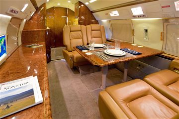 (2016 – GAC) The beautiful thirteen (13) passenger interior was refurbished in 2008 by Stevens Aero. The forward cabin includes a four (4) place club with fold out tables. The mid cabin of the aircraft has a three (3) place belted divan opposite two (2) club seats. The aft cabin includes a four (4) place conference grouping across a credenza. The AFT galley is equipped with a Microwave Oven and Food Chiller. The aircraft is equipped with both a forward crew lavatory and an aft lavatory, each externally serviced. |