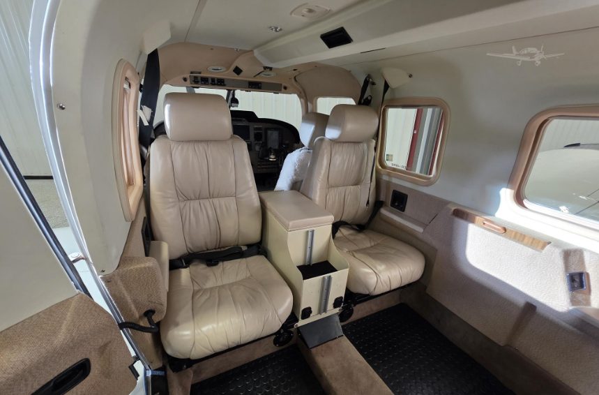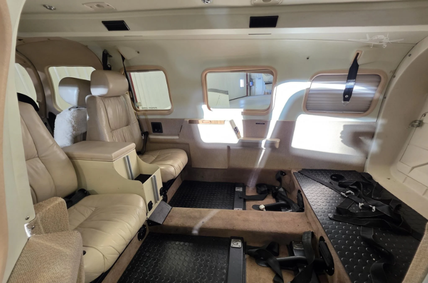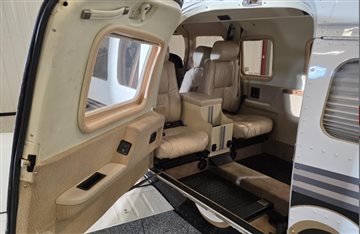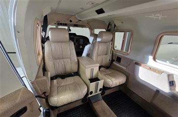Number of Seats 6 Configuration Passenger Interior Notes Six place executive with rear club seating. Tan leather showing minimal wear. Retractable cloth window shades Executive foldout writing table Refreshment center with deep storage and two 12V outlets Aft Luggage Compartment with Security Straps Overhead Map Lights, Cockpit Entry Lights, Cabin Reading Lights, Cabin Entry Light Interior overall in very good condition. Rear seats incorporate quick release feature for easy removal when extra cargo space is needed. Nose baggage compartment can hold up to 100 lbs Rear baggage compartment can hold up to 100 lbs |