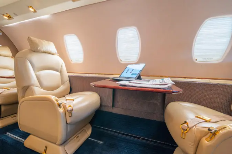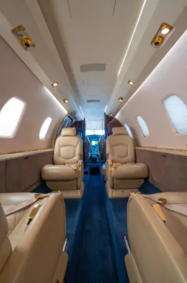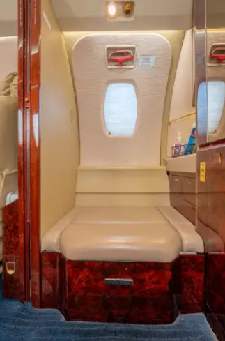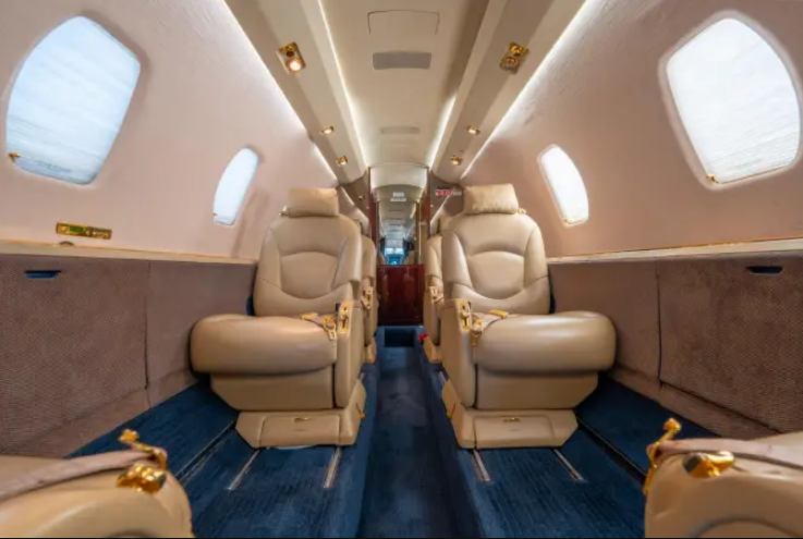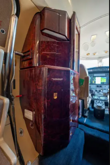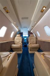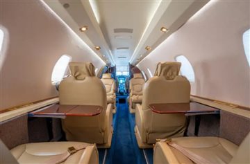 Complete refurbishment by Duncan Aviation, BTL in 2011. PAX: 2 Crew & 7 Passengers The forward cabin features a side-facing seat adjacent to a four-place club arrangement, followed by two individual seats in the aft cabin next to the aft lavatory with a sliding pocket door. The interior includes Cobalt lower sidewalls, Tan upper sidewalls, and Garrett leather seating in Sand. The carpet is Redrock Shale, complemented by 24K gold plating throughout the cabin. The galley cabinetry is finished in Walnut Burl veneer with a high-gloss finish. |