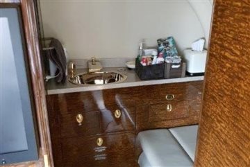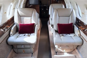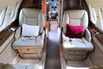 Configuration/PAX: Executive/8 passengers Seating: Forward 4-place club, aft 3-place divan opposite single forward-facing seat, removeable jumpseat Refreshment: Forward galley w/oven Entertainment: Airshow Business: Wi-Fi internet Storage: Forward & aft baggage Lavatory: Aft lav |