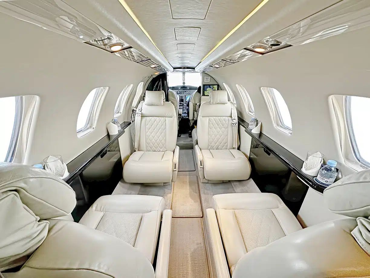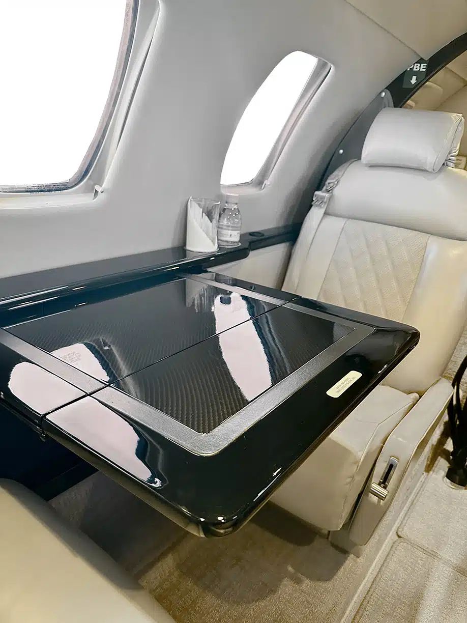 Six passenger seating includes a four-place club seating arrangement, a forward single-place side-facing seat and an aft belted lav. Forward storage area with ‘stay hot’ coffee holder, 4 USB ports and 2 USB-C ports. Refurbishments in 2021 include new carpet, new cabin seat leather and cockpit seats, refurbished sidewalls, new carbon fibre drink ledges, refreshed galley woodwork and pull-out tables with carbon fibre inserts. |