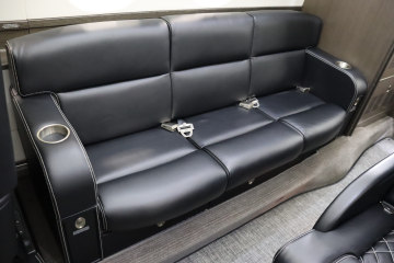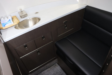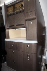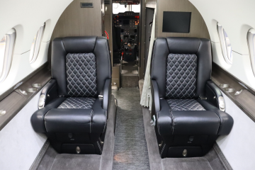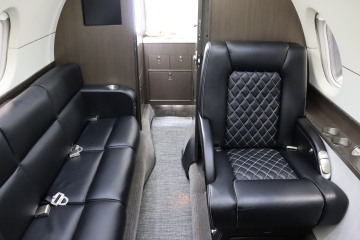 Refurbished in 2021 Eight passenger interior Forward double club captain’s chairs with aft three place club across from single captain’s chair Forward refreshment center opposite large internal baggage storage Aft baggage compartment Seats finished in black leather with white stitching |