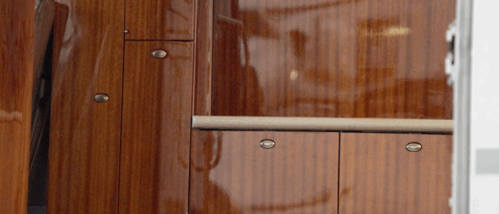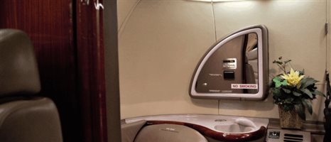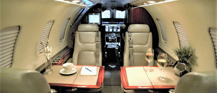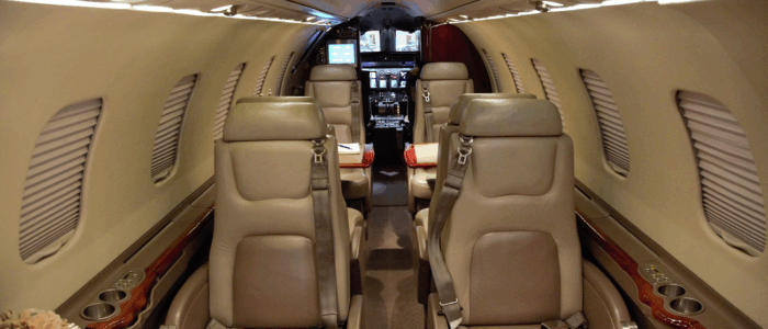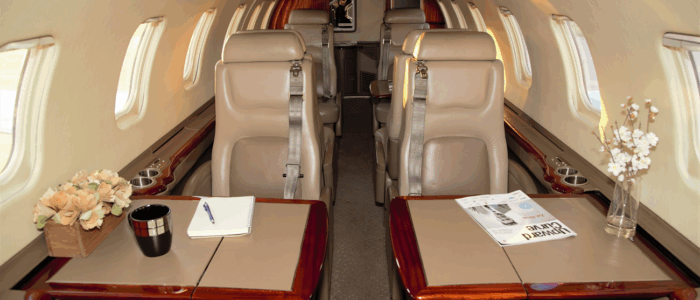 Executive Tan leather Double Club seating Executive Fold-Out Tables High Gloss Veneer Woodwork Wool accent carpeting Tan Sheepskin covered Crew seats Dropped aisle accent lighting Pleated Fabric window shades Tapis off-white Ultraleather headliner |