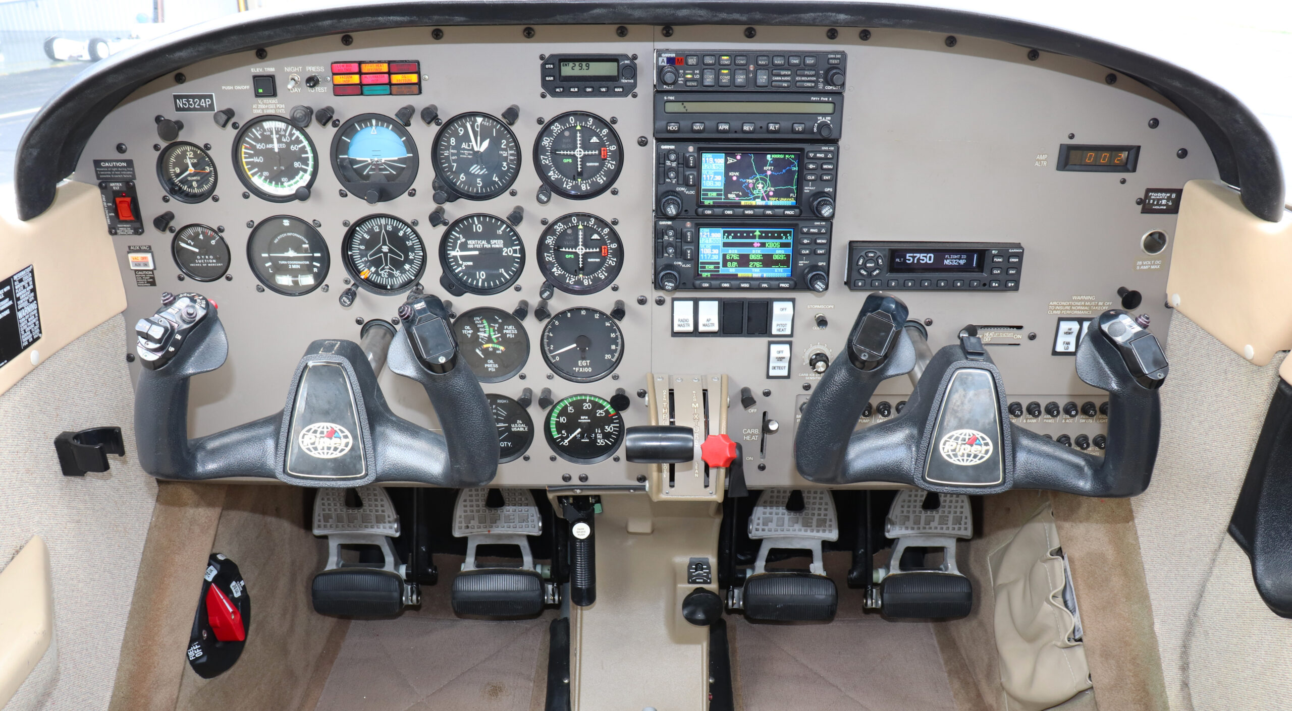 Dual Garmin GNS430WAAS GPS/NAV/COMs Garmin GTX345 ADS-B in/out Transponder Garmin GMA340 Audio Panel w/ 4 place intercom Dual Garmin GI106A GPS/VOR/LOC/GS Indicators S-TEC System 55X Autopilot w/ Altitude Pre-select BFG WX500 Stormscope |