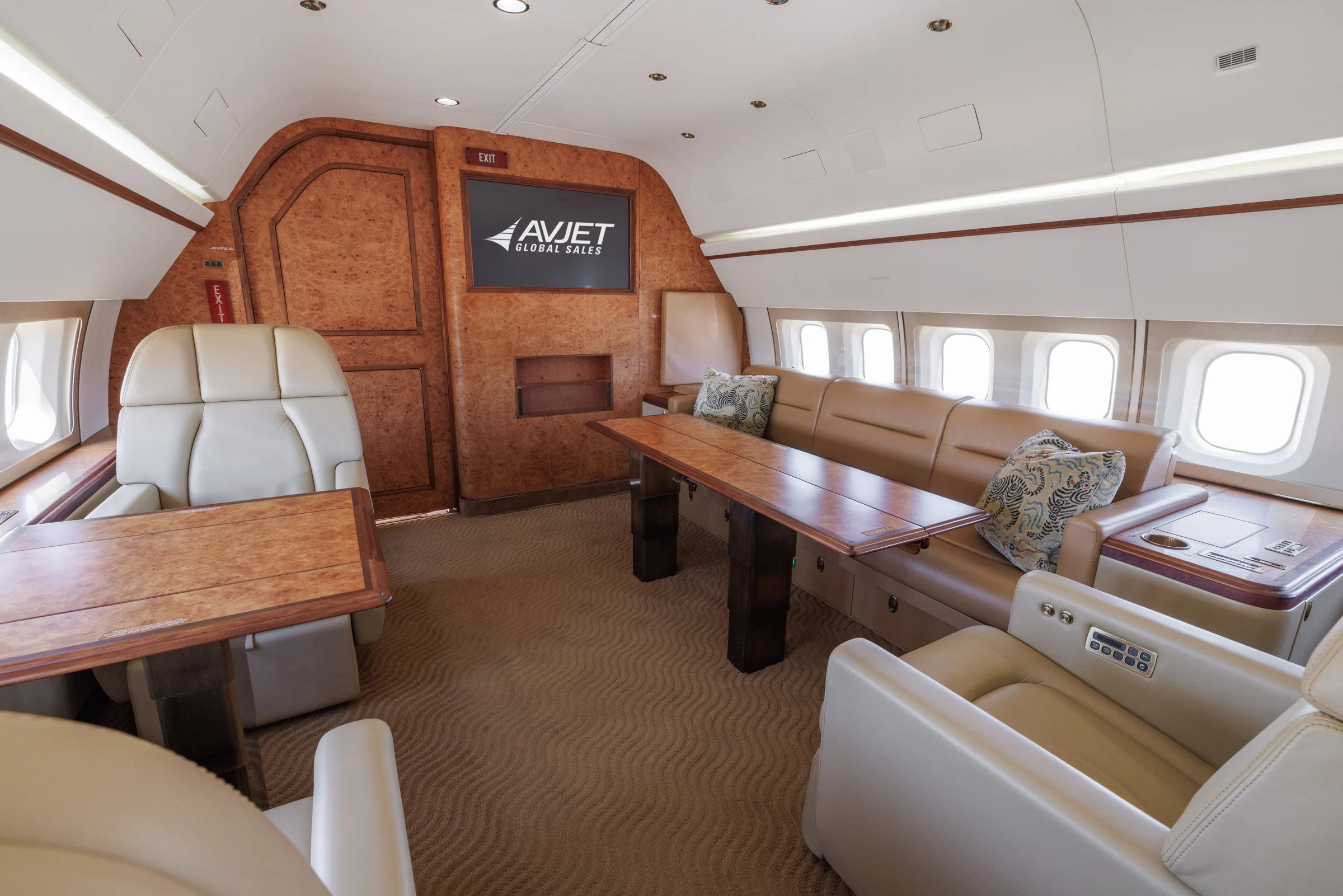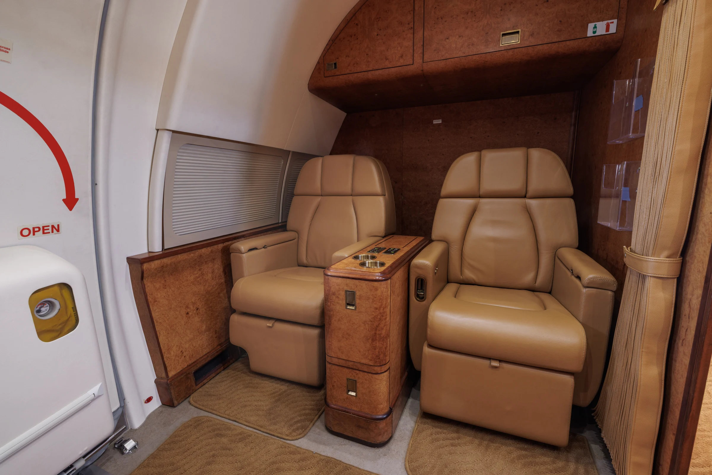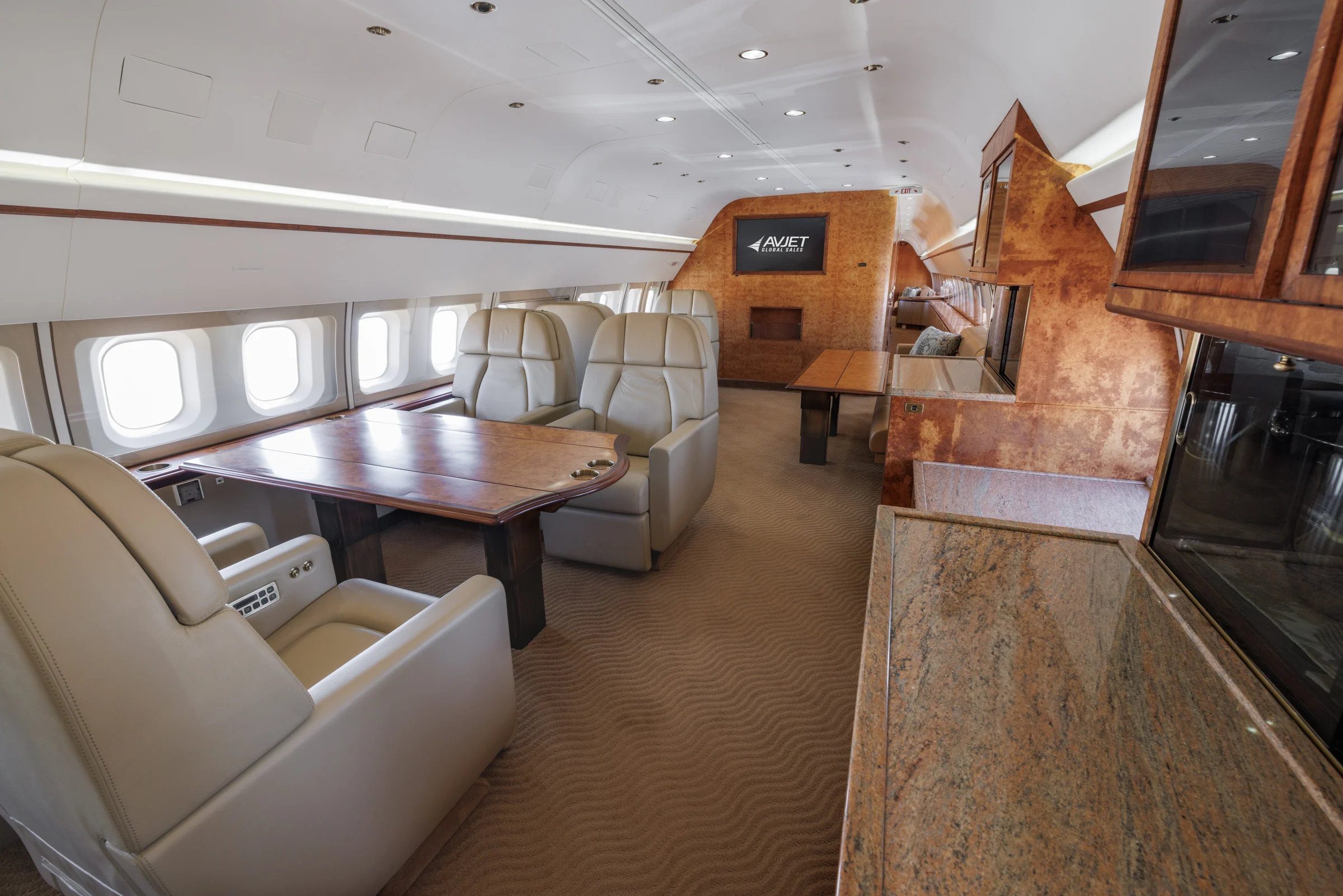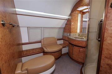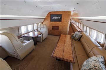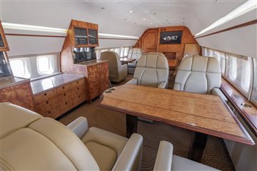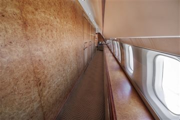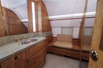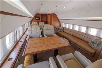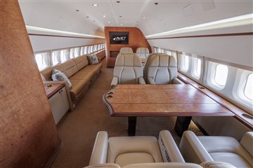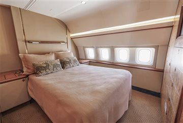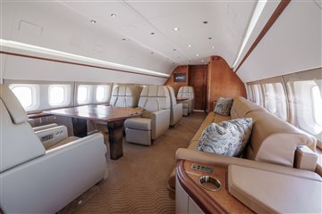 Configuration: Executive 29 Passenger Interior Zone 1: Crew Area Features a crew rest area with two single seats and overhead storage Includes a dedicated crew galley Equipped with a crew lavatory Zone 2: Forward Lounge Includes a three-place divan and a single seat with a Hi-Lo table and fold-out leaves Opposite is a two-place club seating arrangement with a Hi-Lo table and fold-out leaf LCD monitor mounted on the forward right-hand bulkhead Zone 3: Conference Area Four-place conference group Opposite a buffet with china storage and a refrigerator Zone 4: Mid-Cabin Lounge Two-place club seating with a Hi-Lo table and fold-out leaves Opposite a three-place divan with a Hi-Lo table and fold-out leaf LCD monitor mounted on the aft right-hand bulkhead Zone 5: Master Suite Hallway with side ledge and storage Private master bedroom with queen-size bed and wardrobe LCD monitor mounted on the aft bulkhead En suite master lavatory with bidet and stand-up shower Zone 6: Guest Lavatory Separate lavatory for guests Zone 7: VIP Lounge Dual four-place conference groups opposite a four-place divan LCD monitors mounted on both the forward and aft bulkheads Zone 8: Main Galley Fully equipped master galley for food preparation and storage |
