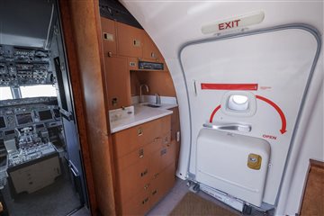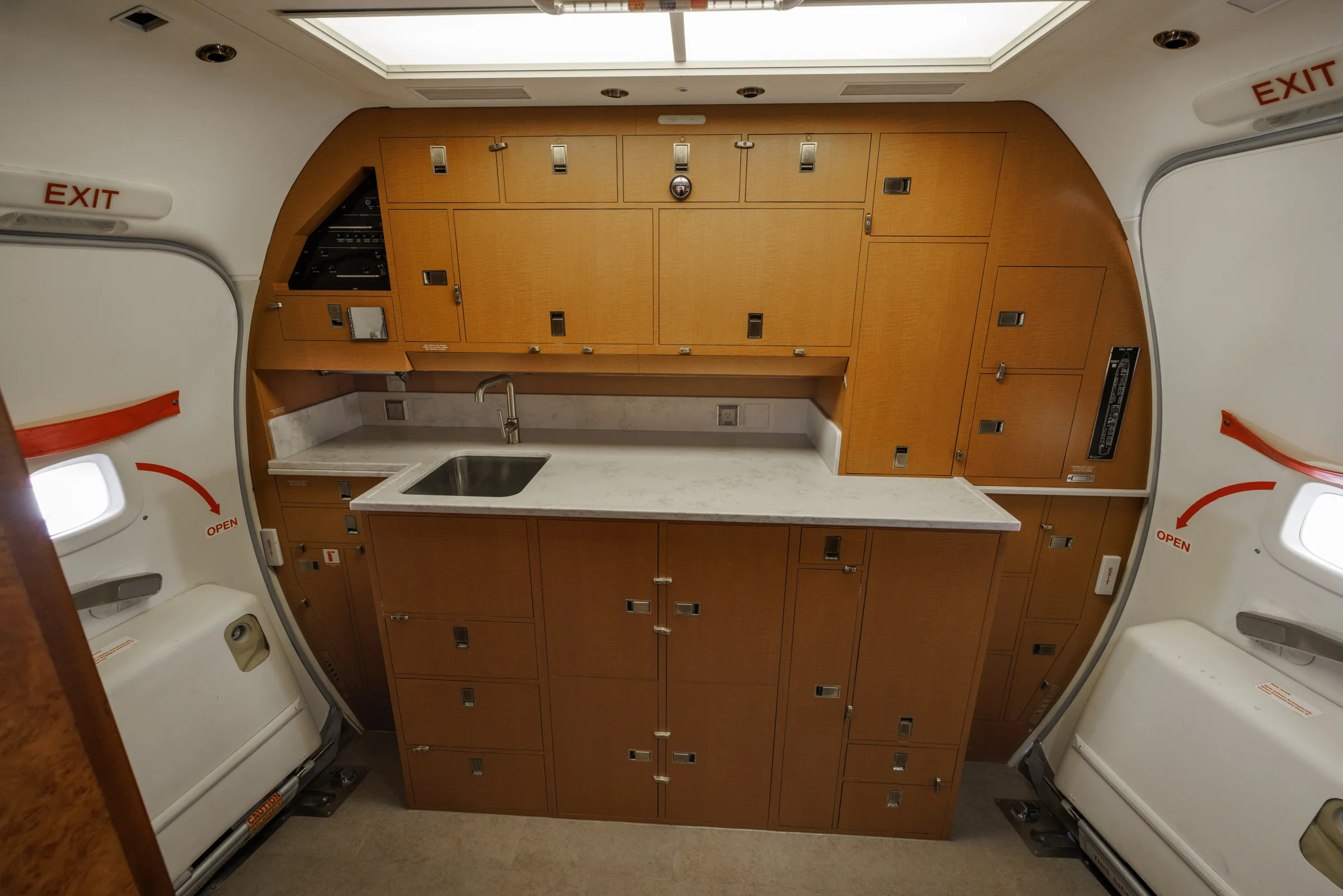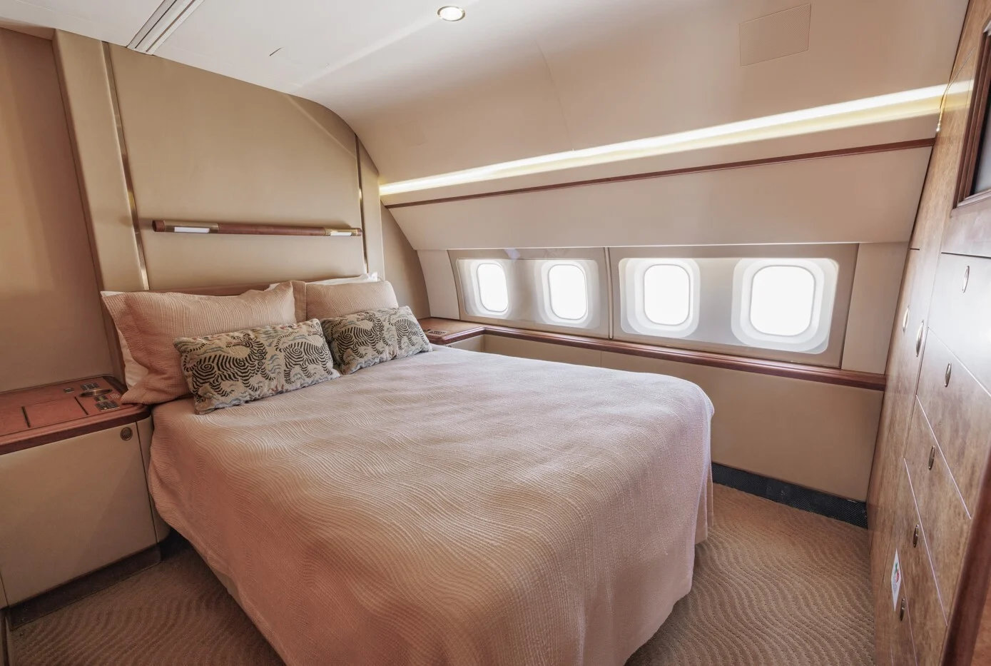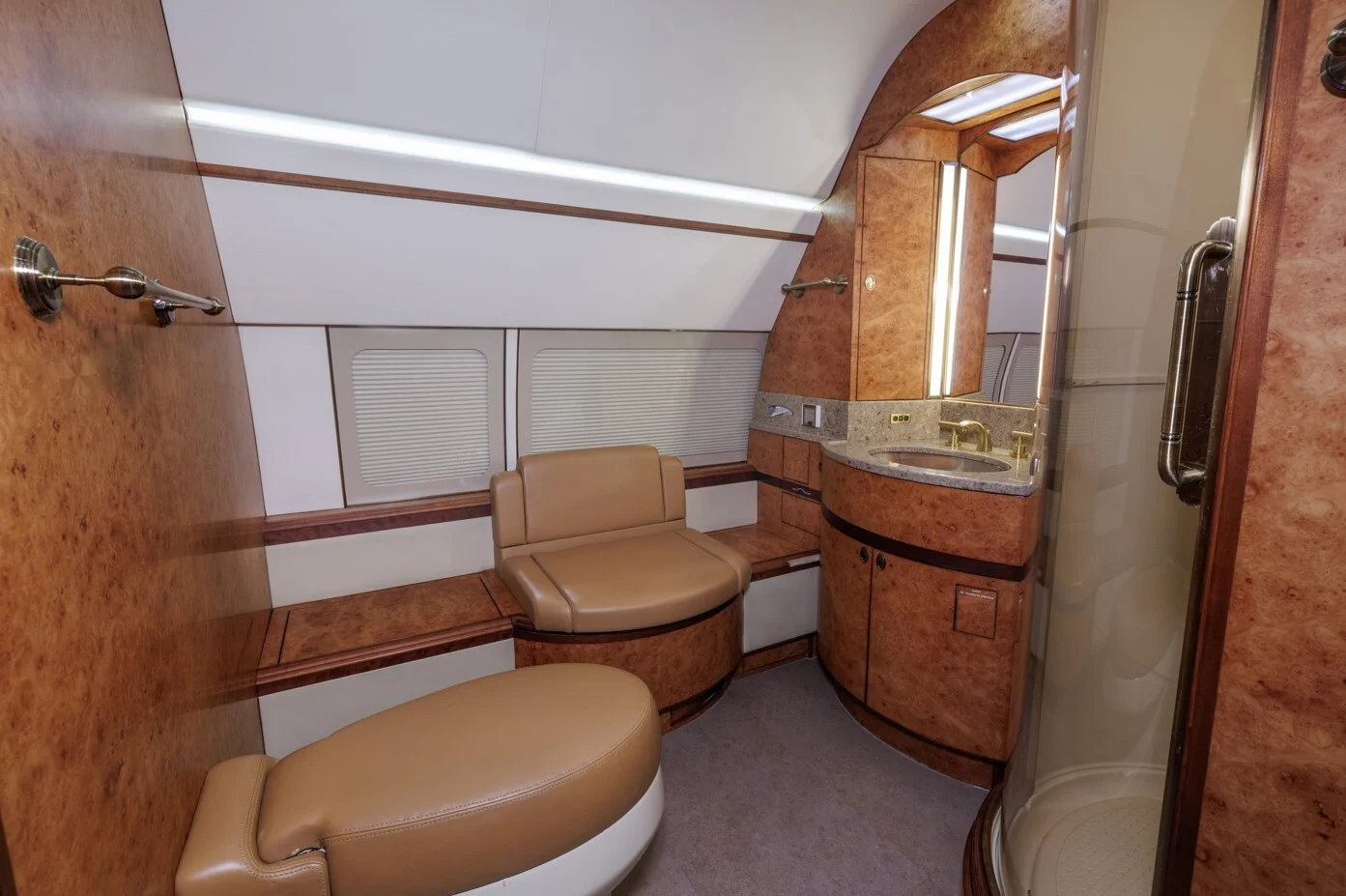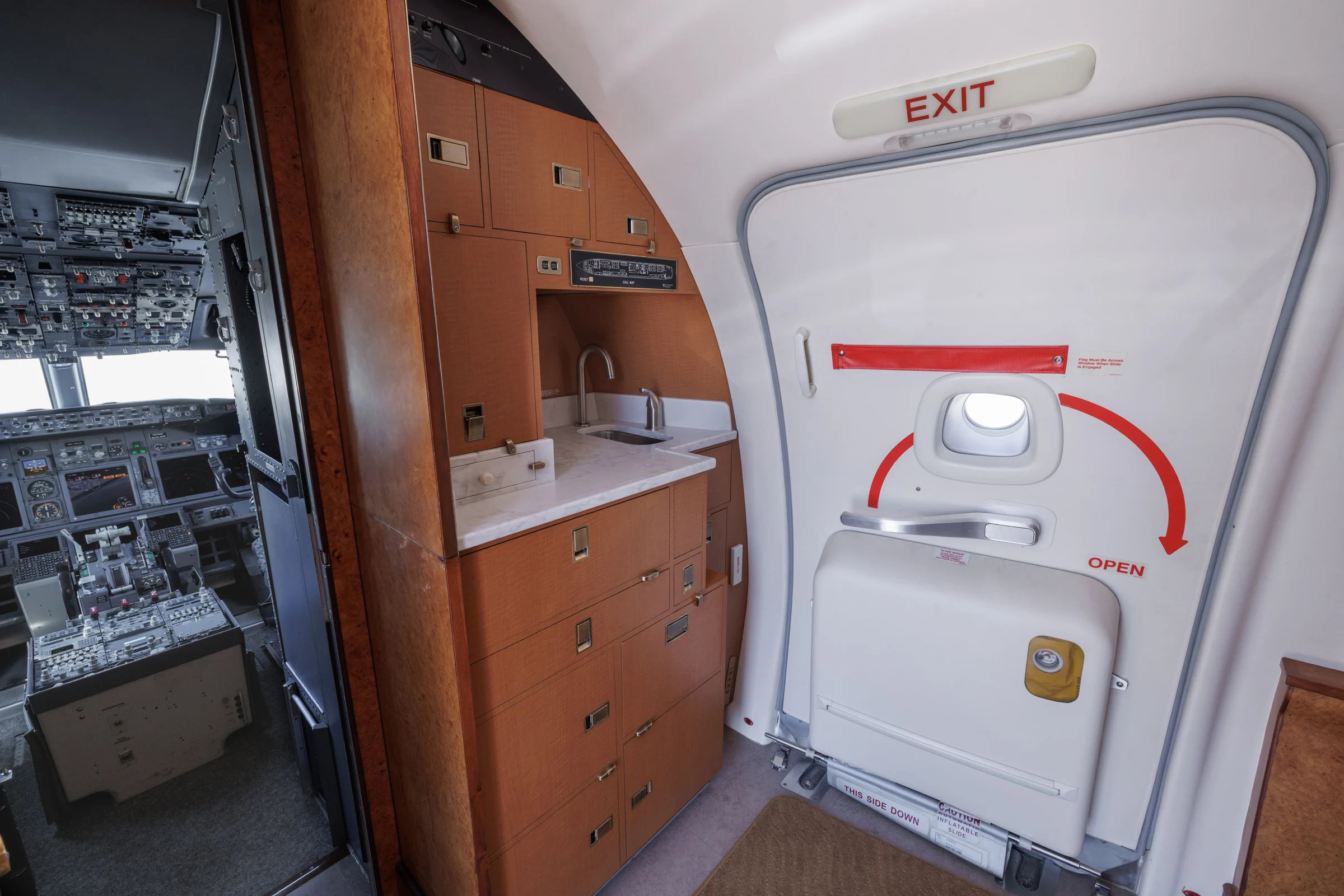 Configuration: Executive 29 Passenger Interior Zone 1: Crew Area Features a crew rest area with two single seats and overhead storage Includes a dedicated crew galley Equipped with a crew lavatory Zone 2: Forward Lounge Includes a three-place divan and a single seat with a Hi-Lo table and fold-out leaves Opposite is a two-place club seating arrangement with a Hi-Lo table and fold-out leaf LCD monitor mounted on the forward right-hand bulkhead Zone 3: Conference Area Four-place conference group Opposite a buffet with china storage and a refrigerator Zone 4: Mid-Cabin Lounge Two-place club seating with a Hi-Lo table and fold-out leaves Opposite a three-place divan with a Hi-Lo table and fold-out leaf LCD monitor mounted on the aft right-hand bulkhead Zone 5: Master Suite Hallway with side ledge and storage Private master bedroom with queen-size bed and wardrobe LCD monitor mounted on the aft bulkhead En suite master lavatory with bidet and stand-up shower Zone 6: Guest Lavatory Separate lavatory for guests Zone 7: VIP Lounge Dual four-place conference groups opposite a four-place divan LCD monitors mounted on both the forward and aft bulkheads Zone 8: Main Galley Fully equipped master galley for food preparation and storage |