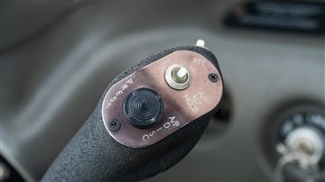 Seating is grey leather with beige cloth insets. Grey and beige trim and paneling have been well cared for and present nicely for the vintage.