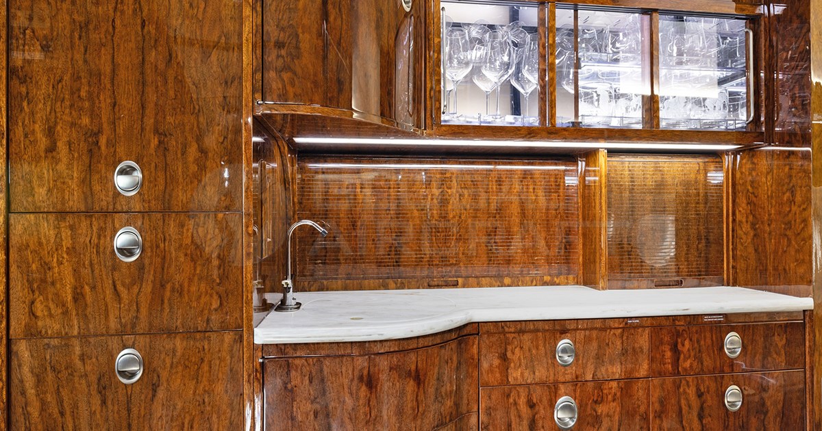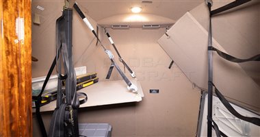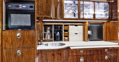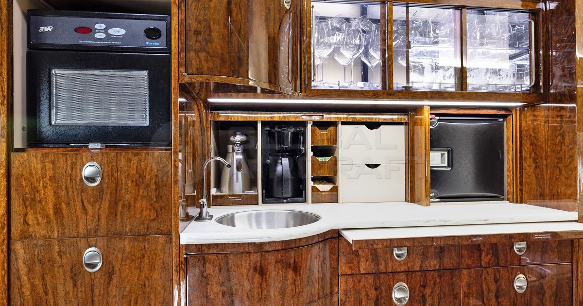 Full Galley: equipped with hi-temp oven, microwave oven, coffee maker with two decanters, four catering bins, two ice drawers, plenty of useful storage drawers, and a large closet for coats or additional storage.