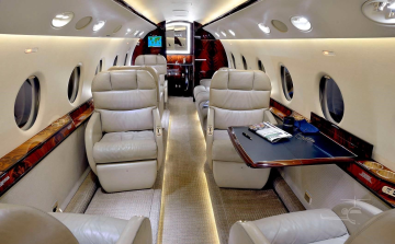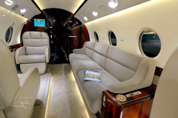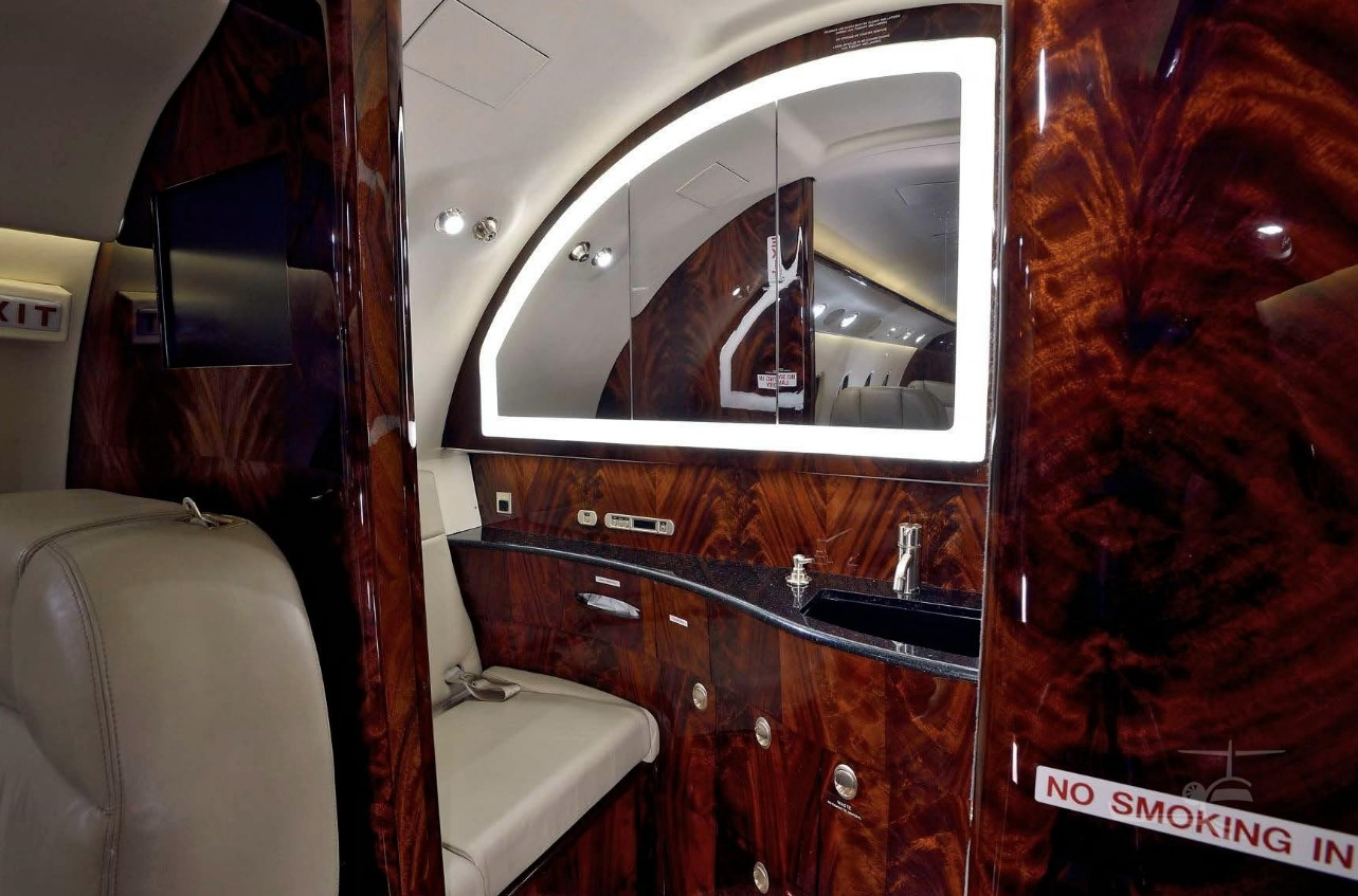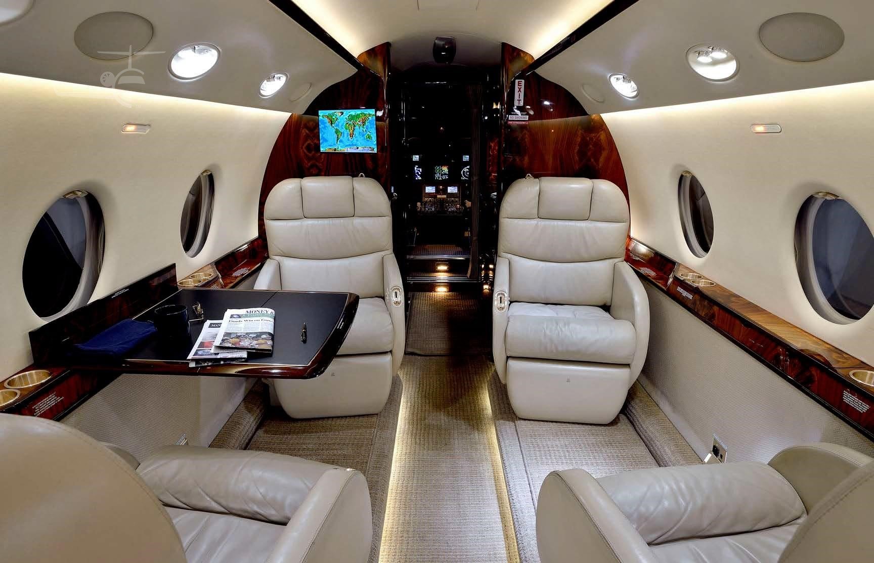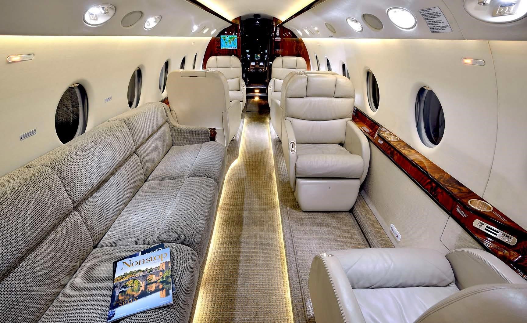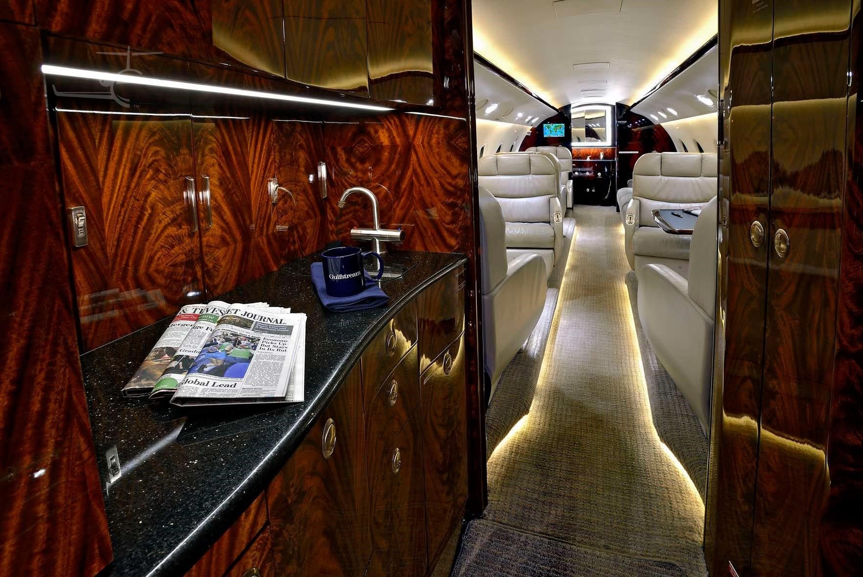 9 passenger interior with belted lavatory and jumpseat. Forward double club, aft cabin 3 place birthable divan opposite club. Right hand forward galley. |