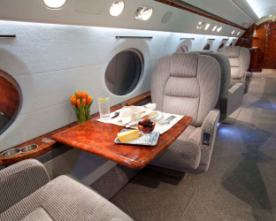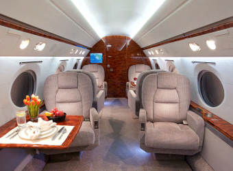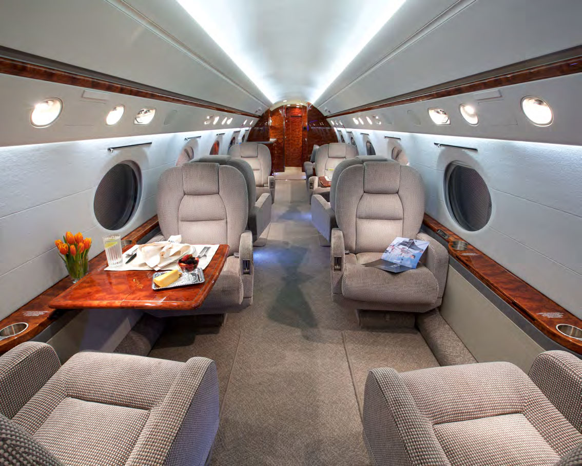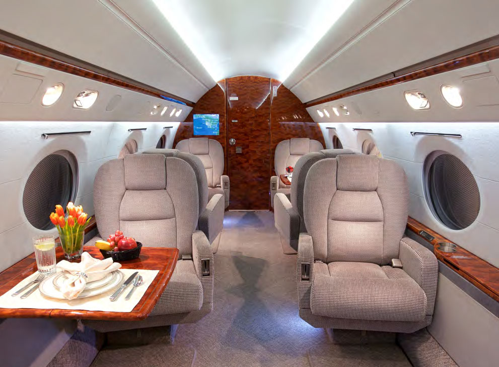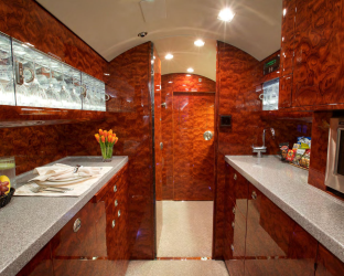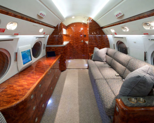 | Twelve (12) passenger configuration featuring a forward four (4) place club followed by a mid cabin four (4) place club. The aft cabin offers a four (4) place berthable divan opposite a credenza which houses the entertainment system, fax machine and ample storage. Aft fully equipped galley and aft lavatory featuring external service capability. Finishes include a fabric covered divan (with removable arm rests); wood veneer is Philippine Bubinga Rosewood Burl, plating is brushed Nickel colored. | |