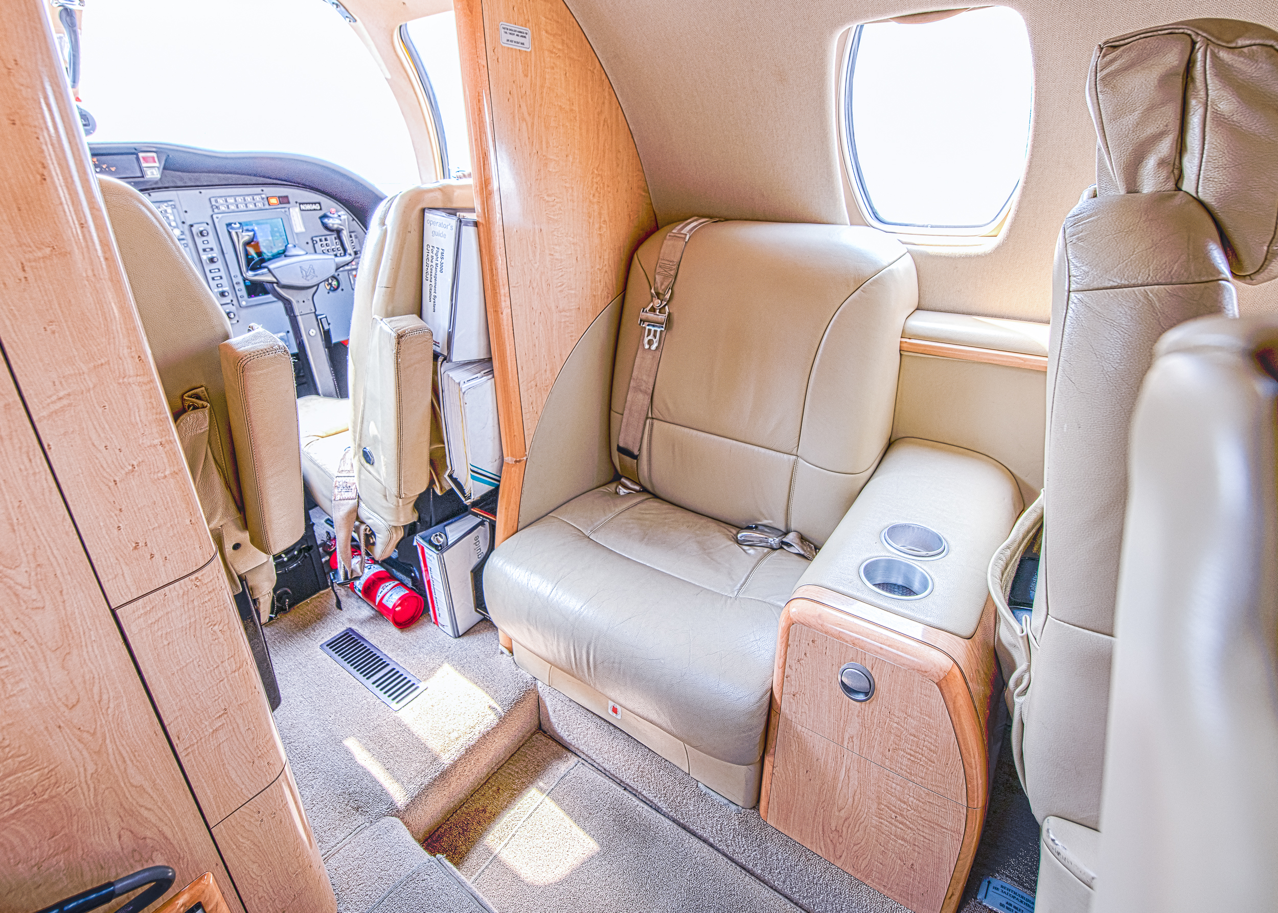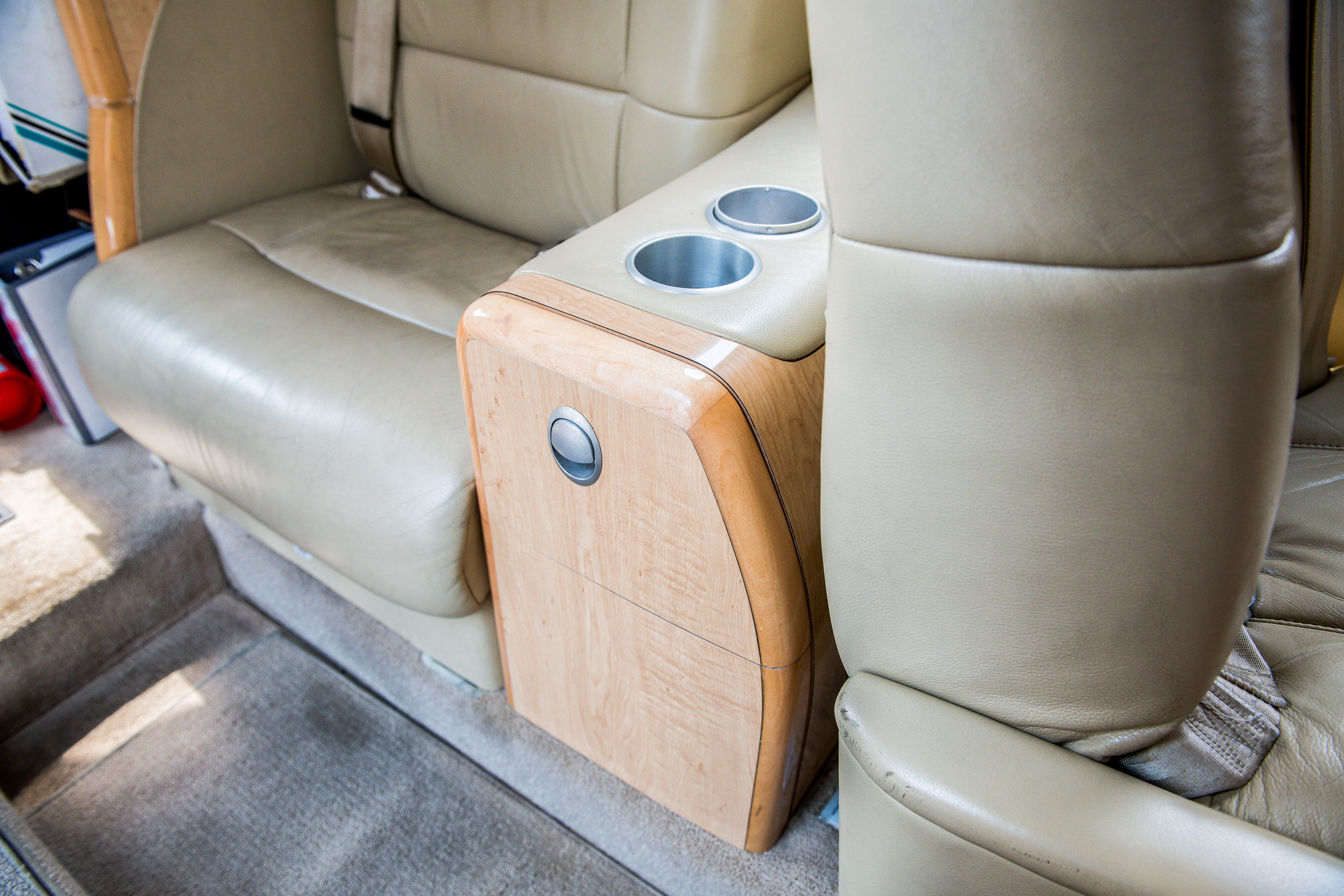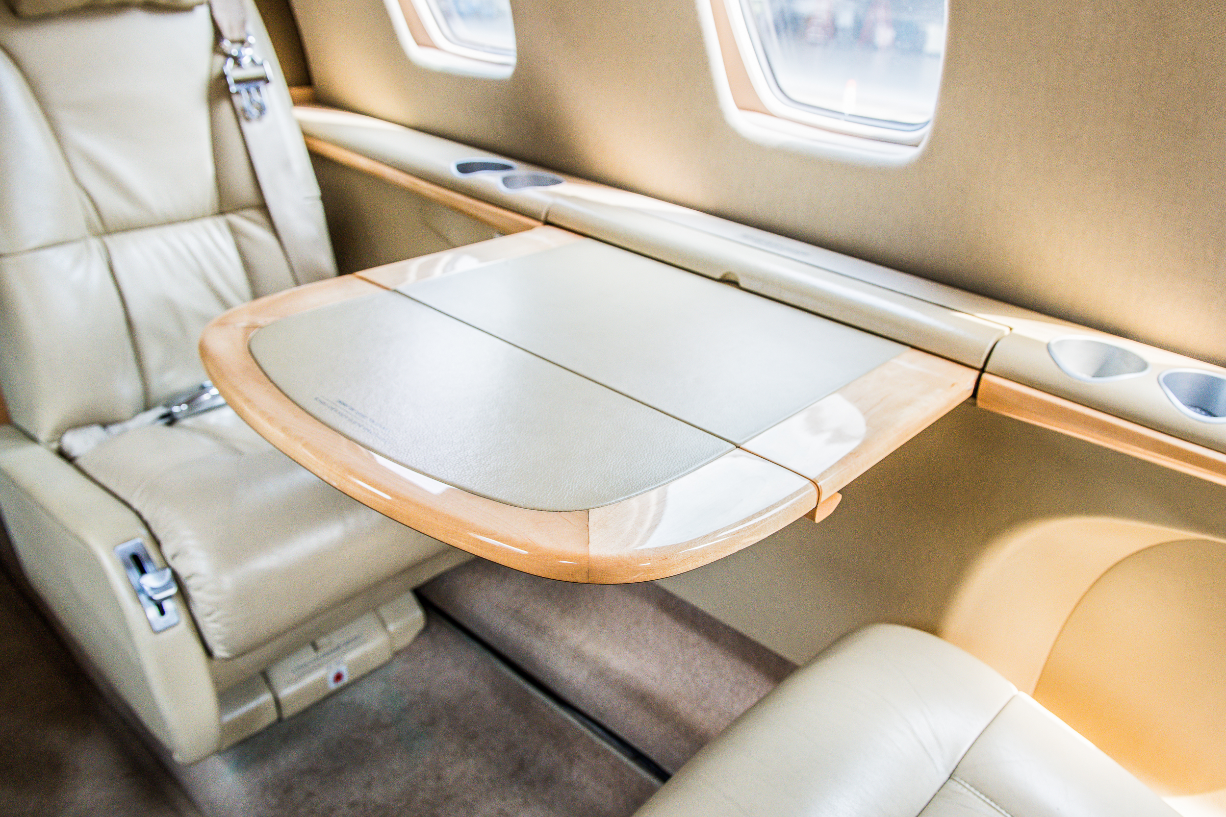 INTERIOR & CABIN: 2007 Factory Original Six passenger cabin seating featuring a RH side facing seat, belted lavatory seat, and center executive club. Light beige leather with champagne colored wood veneer and brushed aluminum hardware. |