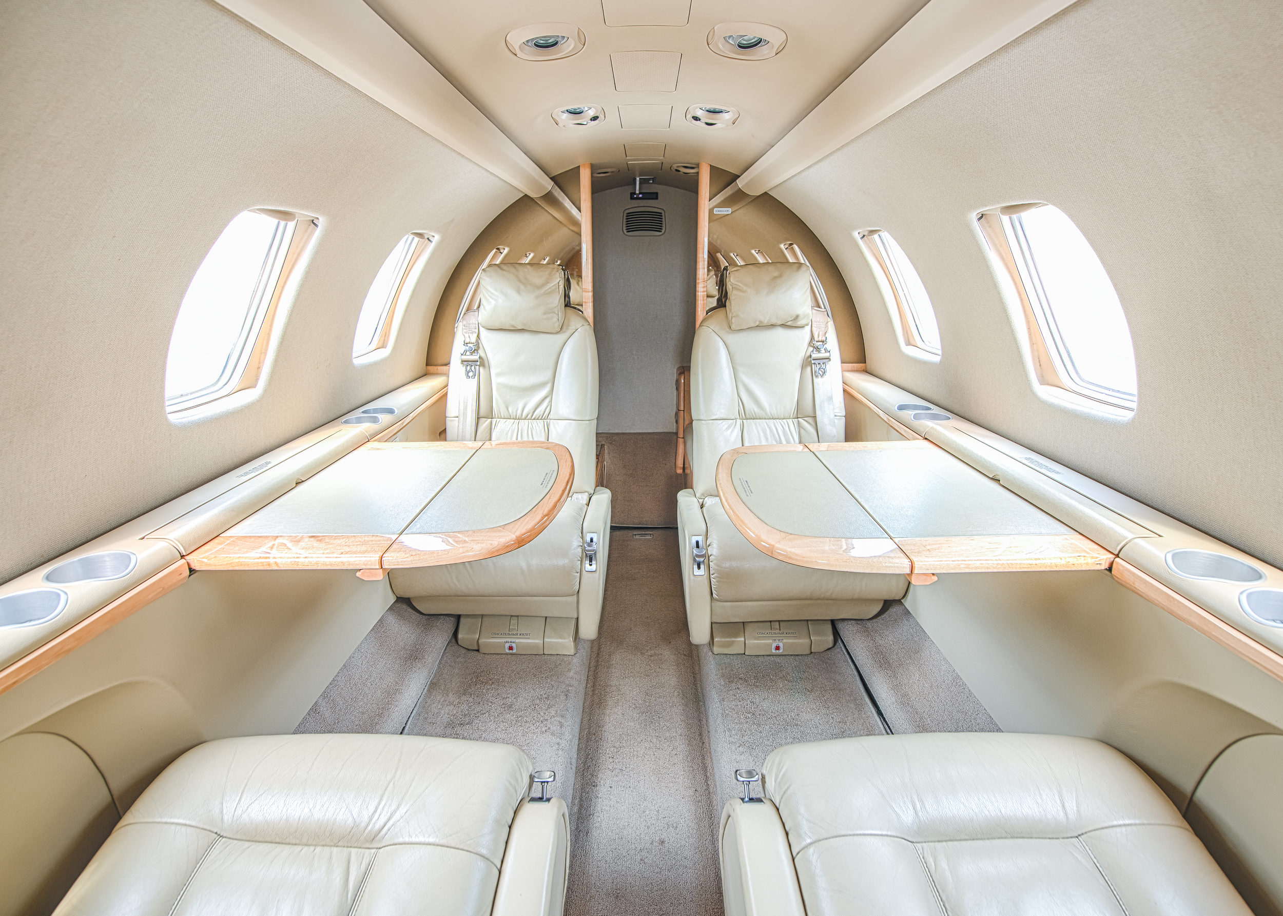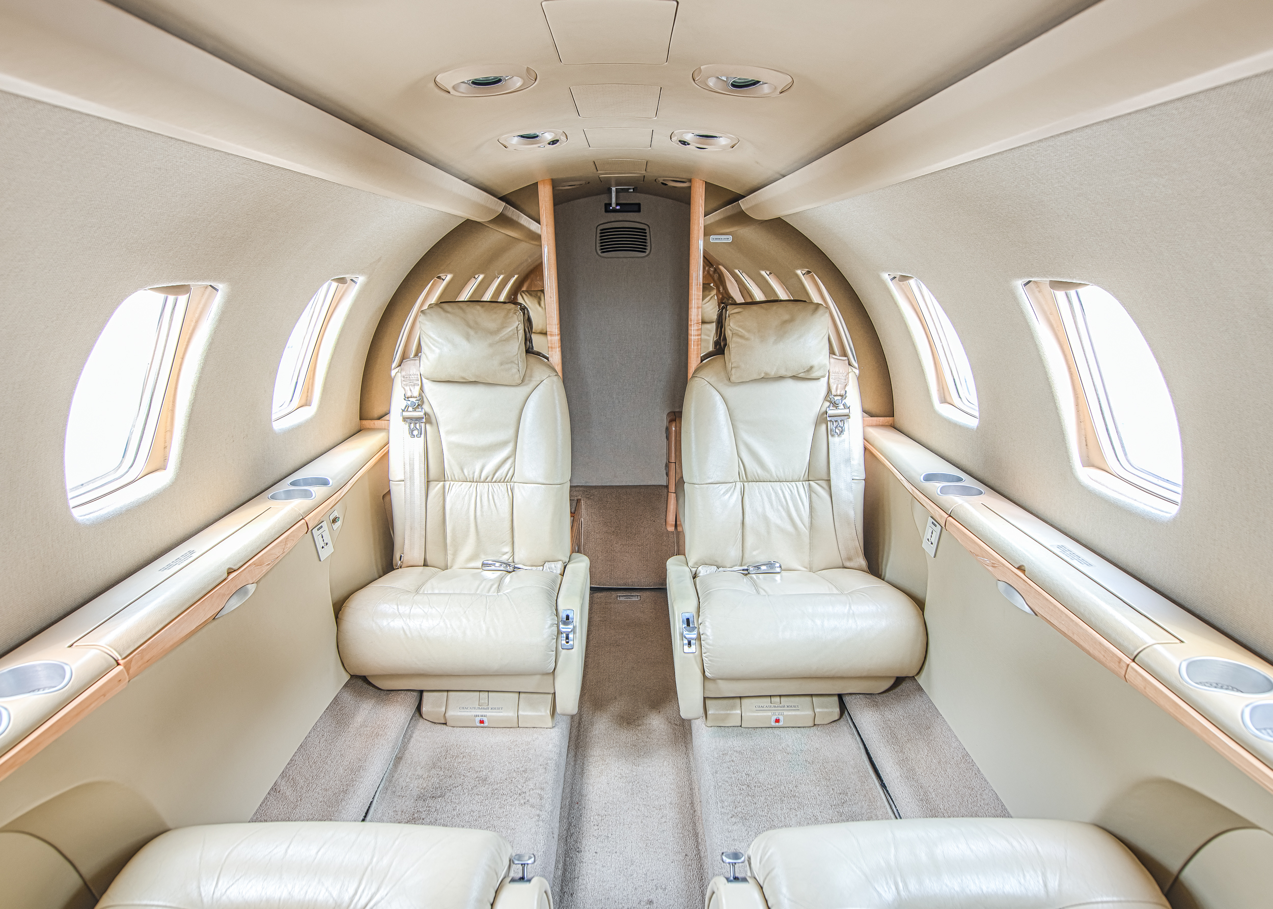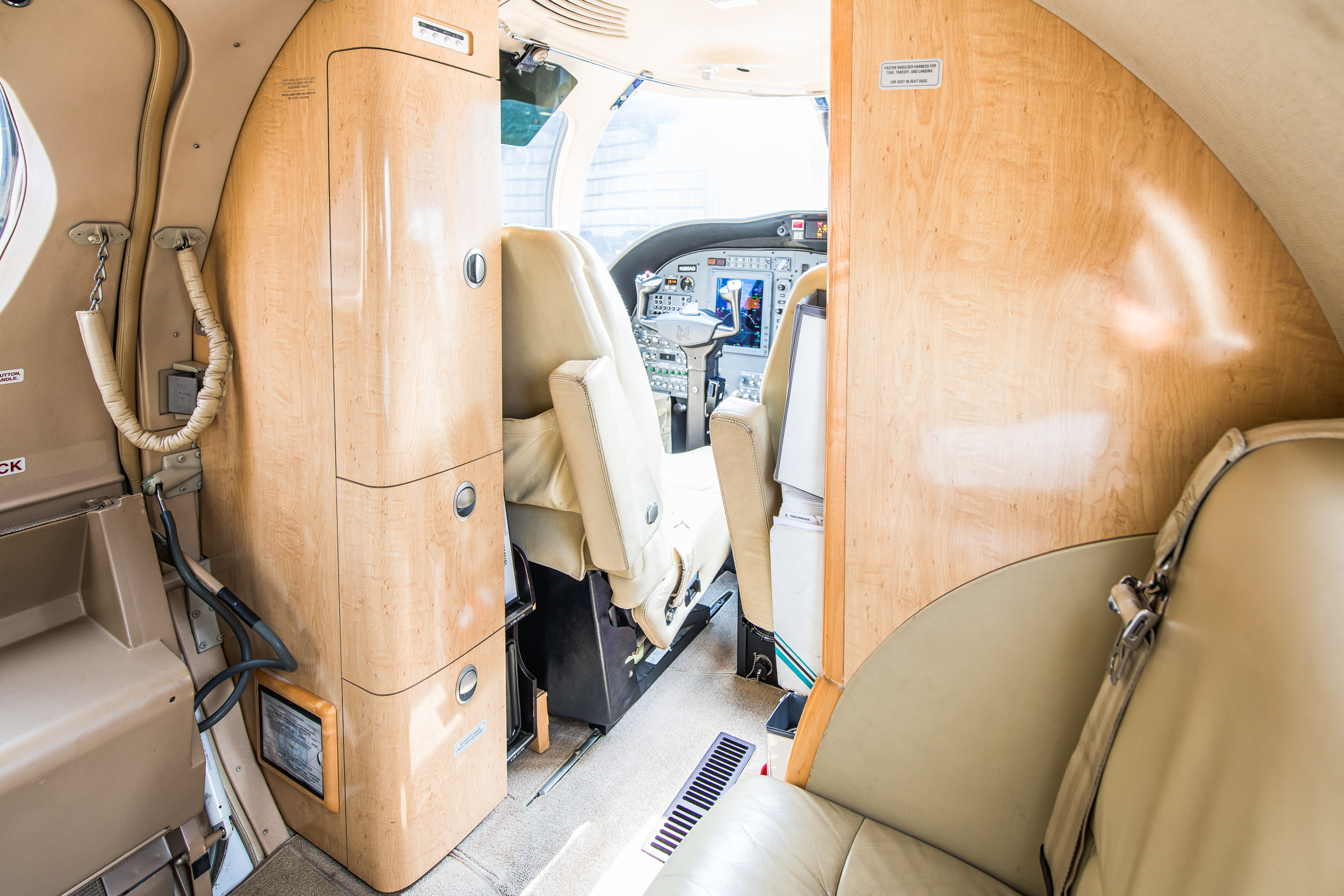 INTERIOR & CABIN: 2007 Factory Original Six passenger cabin seating featuring a RH side facing seat, belted lavatory seat, and center executive club. Light beige leather with champagne colored wood veneer and brushed aluminum hardware. |