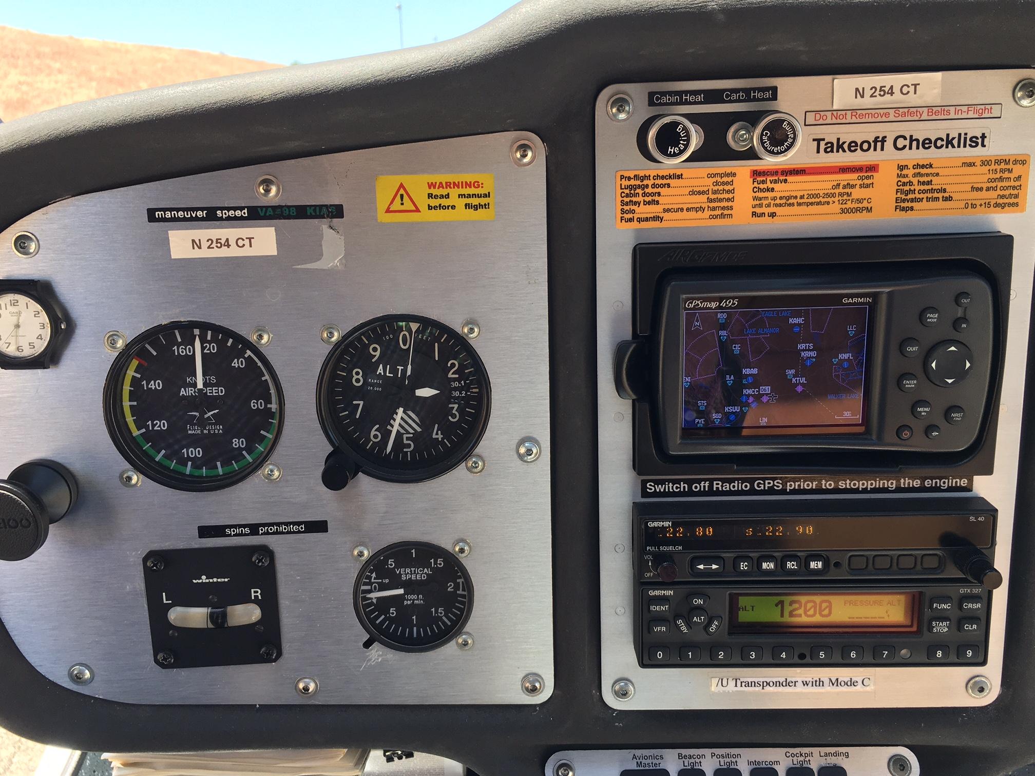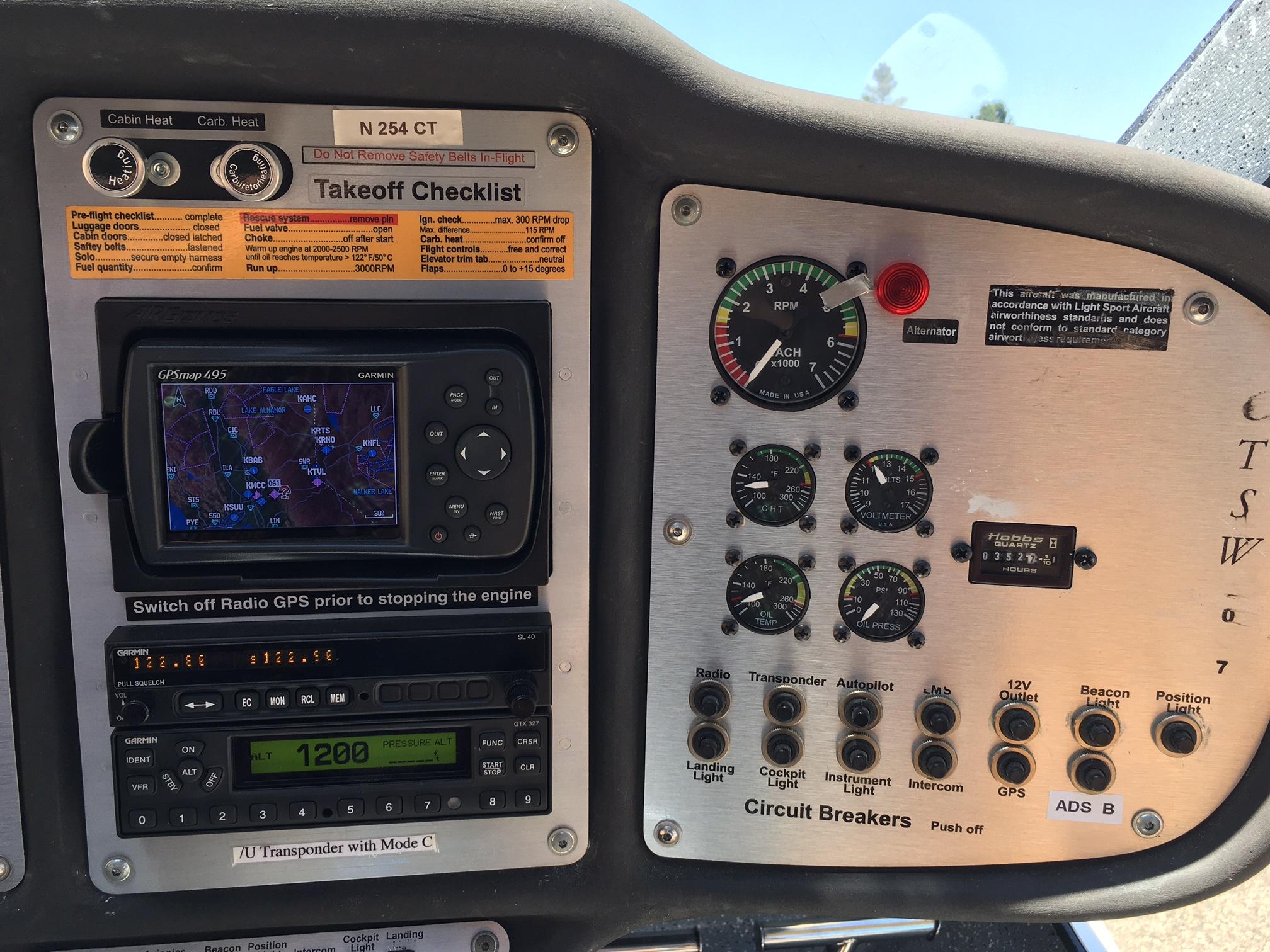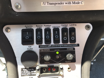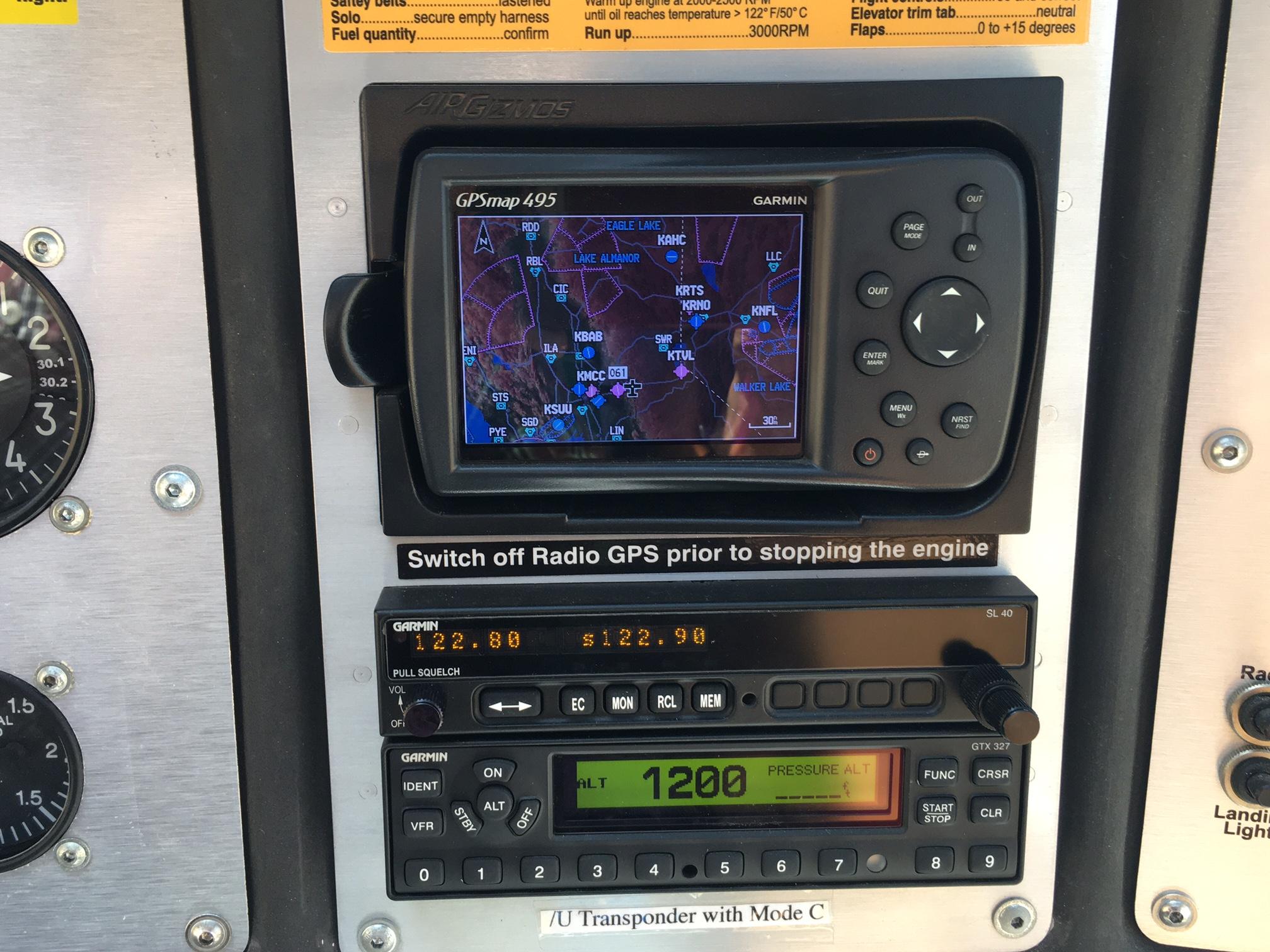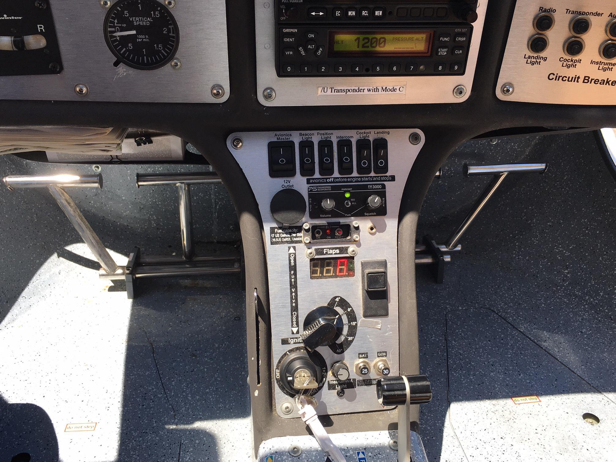 Garmin SL 40 slimline Com Garmin 495 Color moving map GPS Garmin GTX 327 Transponder ADSB Out Remote ELT arming panel Clock Avionics master switch Magnetic phone holder PS Engineering PM3000 two place intercom Tachometer Oil pressure and oil temperature gauges Hobbs meter Dual push-to-talk buttons on control sticks Magnetic compass |