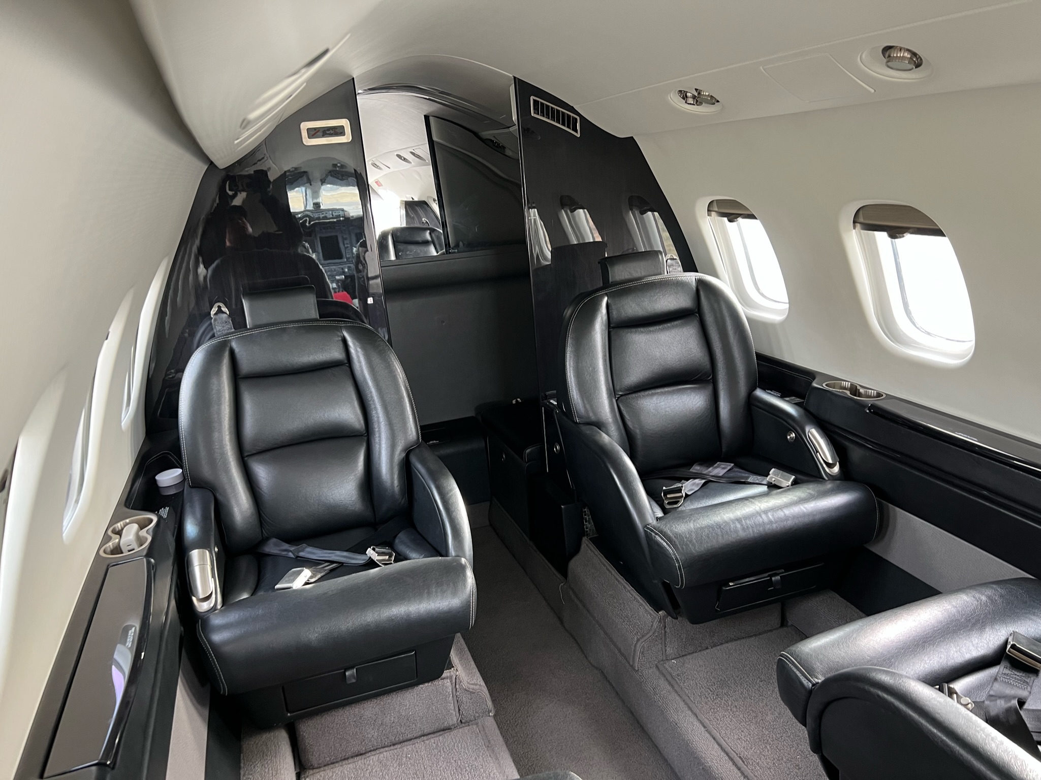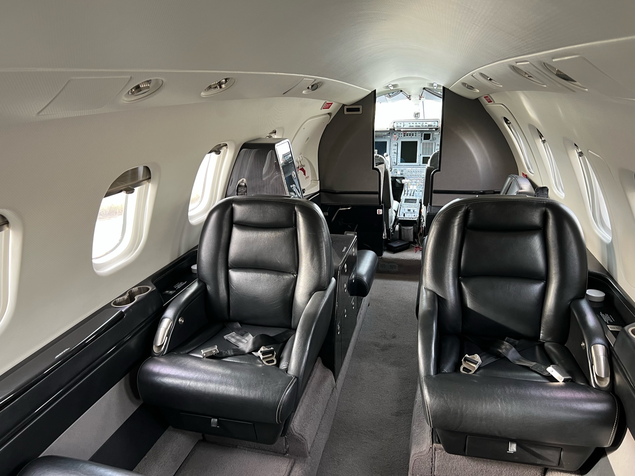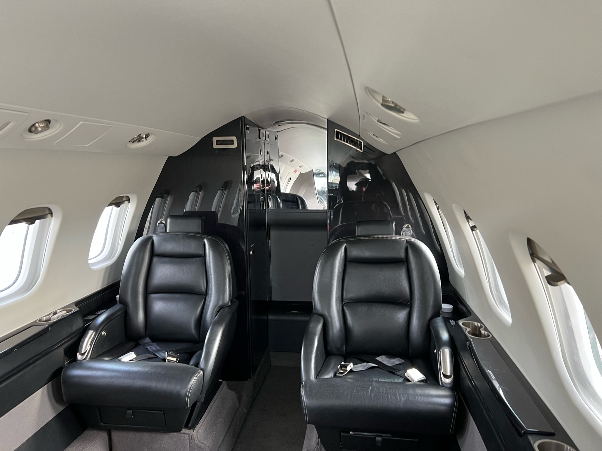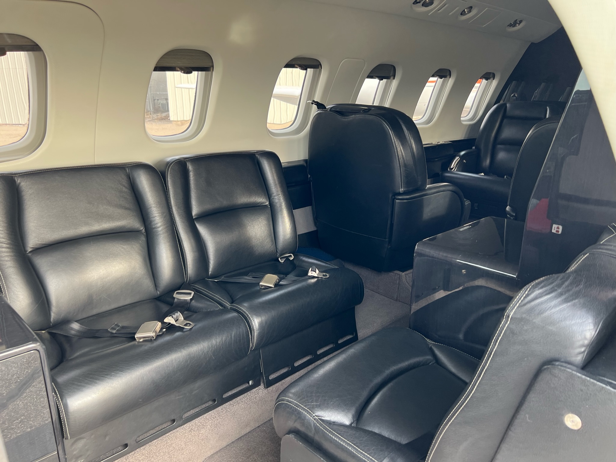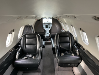 | 2015 - Executive Eight (8) Passenger Configuration Finished in Black Leather with White Outline Stitching, Forward Right Side 2-Place Divan and Forward Left Side Single Seat, Aft Club Seating with Dual Writing Tables and Belted Lav Seat. Sheepskin Covered Pilot Seats. High-Gloss Black Stained Woodwork with Carbon Fiber-Style Weave Fabric Upper Sidewalls and Headliner. Brushed Nickel-Plating Hardware Finishes the Interior Accessories. | |