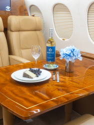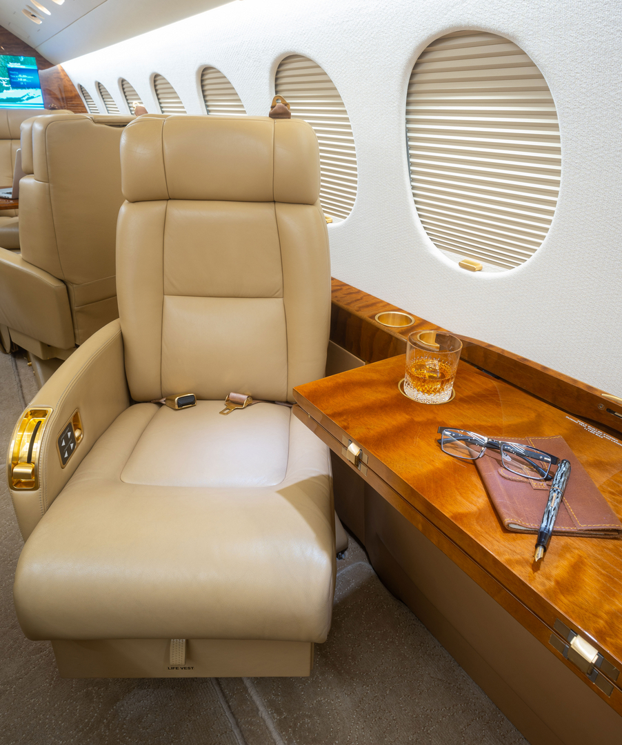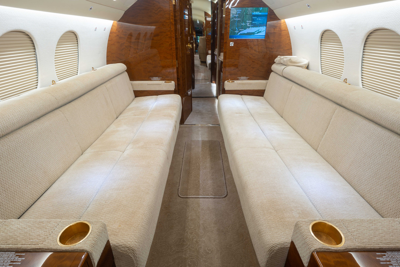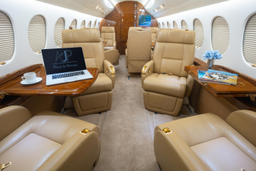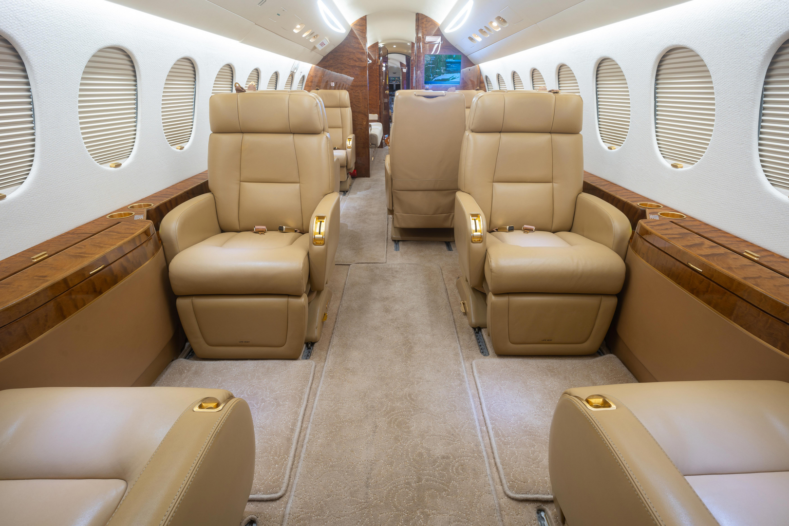 This aircraft is completed with a sixteen (16) passenger executive interior featuring forward and aft lavatories, large galley with left side annex and 3 distinct and elegant cabin zones. The galley is equipped with a refrigerator, warming oven and hot cup. The left auxiliary galley offers storage, microwave as well as the entertainment system. The forward cabin is configured with four (4) place club seating pull out executive tables. The mid cabin features a four (4) place conference group opposite a 2 place club. The aft cabin offers dual three (3) place divans. Additional storage includes a 17” forward right hand cabinet with storage drawers, 40” middle cabinet in the credenza, 35” aft cabinet for china storage. Original Interior by Dassault February 2008. All seating is done in neutral beige leather complimented by coordinating carpeting, high gloss medium colored wood and brushed bronze colored plating. Entertainment features include Honeywell AIS 2000 Satellite TV, Airshow 4000, Dual BluRay Players, Four 20” forward and aft HD monitors. Inflight connectivity is through an Aviator 700D SATCOM and GoGo Biz Avance L5 speed data system with WiFi |