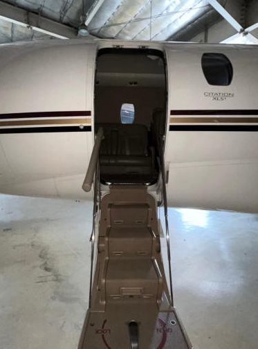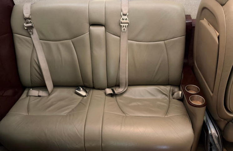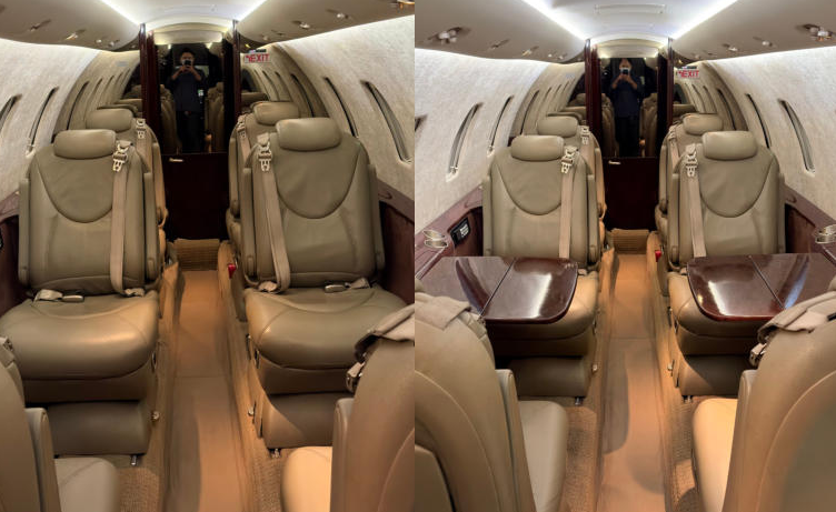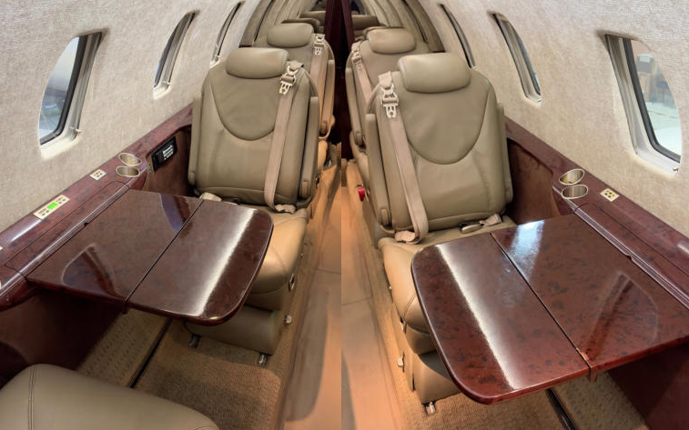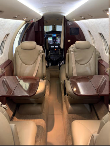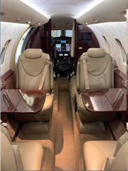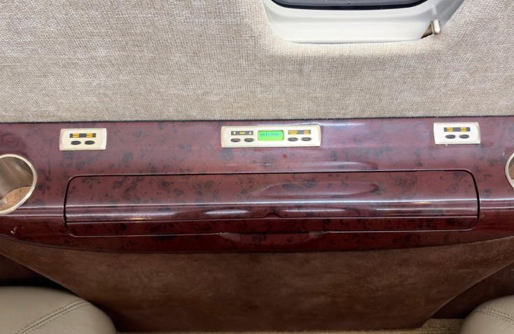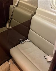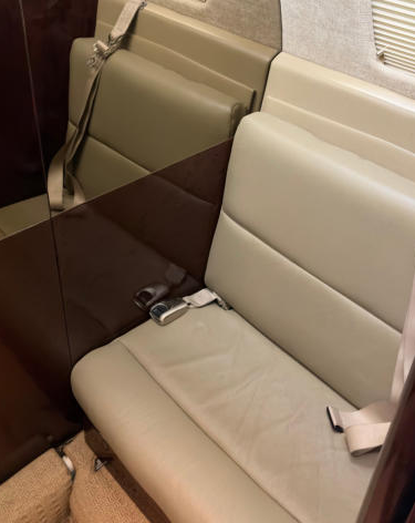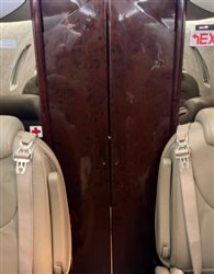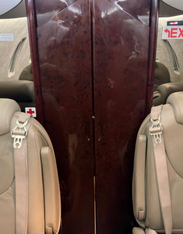 Configuration/PAX: Executive/9 passengers General: Fireblocked Seating: Island sand beige leather seating fwd RS 2-place divan, mid-cabin 4-place club, dual aft fwd-facing seats, removable side-facing belted lav seat, crew seats w/sheepskin covers Headliner: Champagne ultraleather headliner Carpet: Complimentary tan carpeting Refreshment: Fwd LS galley w/pull out work space, draining ice drawer, stemware storage, ample dry goods storage & MAPCO heated container Cabinetry/Wood: High-gloss wood veneer cabinetry, sideledges & executive tables Entertainment: Fwd RS 10.4-inch bulkhead-mounted cabin display w/Rosen FlightView moving map Business: Data outlets, AirCell Axxess II VIP handsets (seats 6 & 7) Accessories: Aft divider w/mirror bron]e upper & high-gloss veneer lower, champagne gold satin hardware, externally-serviceable lav w/coat storage, water faucet, sink, faucet light switch, master switch panel & trash container, VIP sideledge cabin w/remoted temp & light switches, individual sideledge light switches, RS storage cabinet light switches, dual 110-volt AC outlets, aft RS divider maga]ine rack, matching window reveals, PSU indirect lighting Storage: RS fwd main storage w/coat storage, additional storage w/several shelves Lavatory: Aft lav private flushing