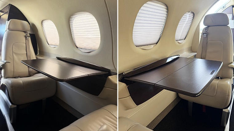 Configuration/PAX: Executive/4 passengers Seating: Single club seating Cabinetry/Wood: Foldable tables Storage: Forward wardrobe |