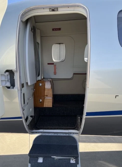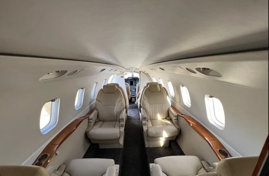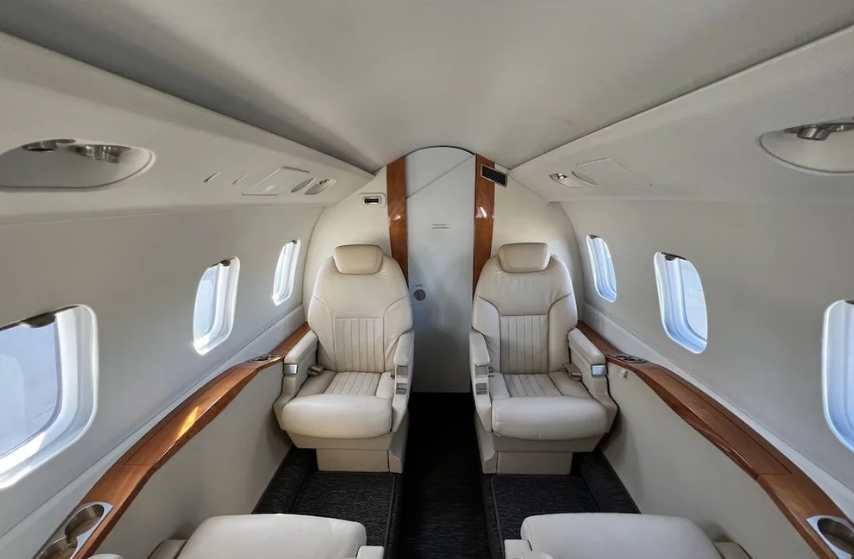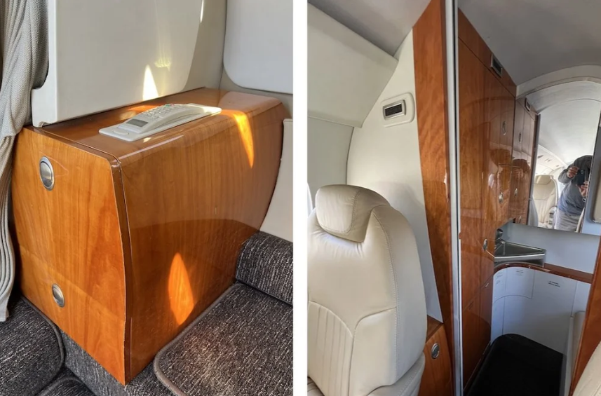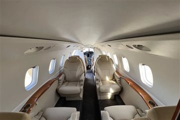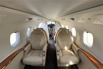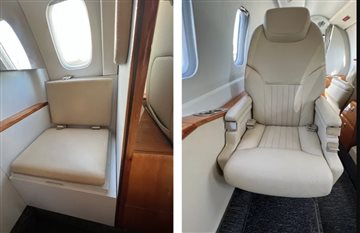 | Seven 7 passenger executive in Athens Sand Drift leather (tan). 4 seats in aft club, two single forward seats. Aft belted toilet seat opposite optional sink. 2 sheepskin crew seats. Midship pyramid cabinets, Aft pyramid cabinets, and Aft storage closet. 2 executive tables. Dark brown carpeting replaced Nov 2021. Lou Martin window shades. Interior Last Refurbished: 2018. | |