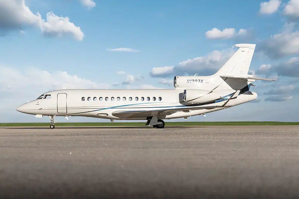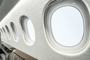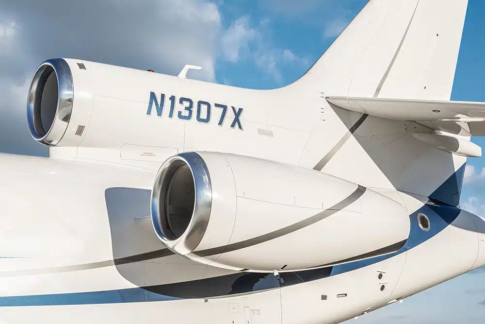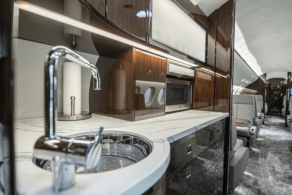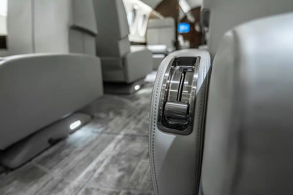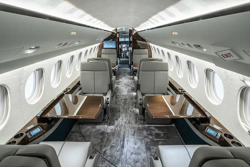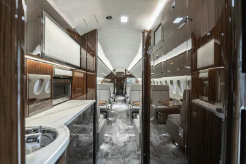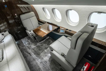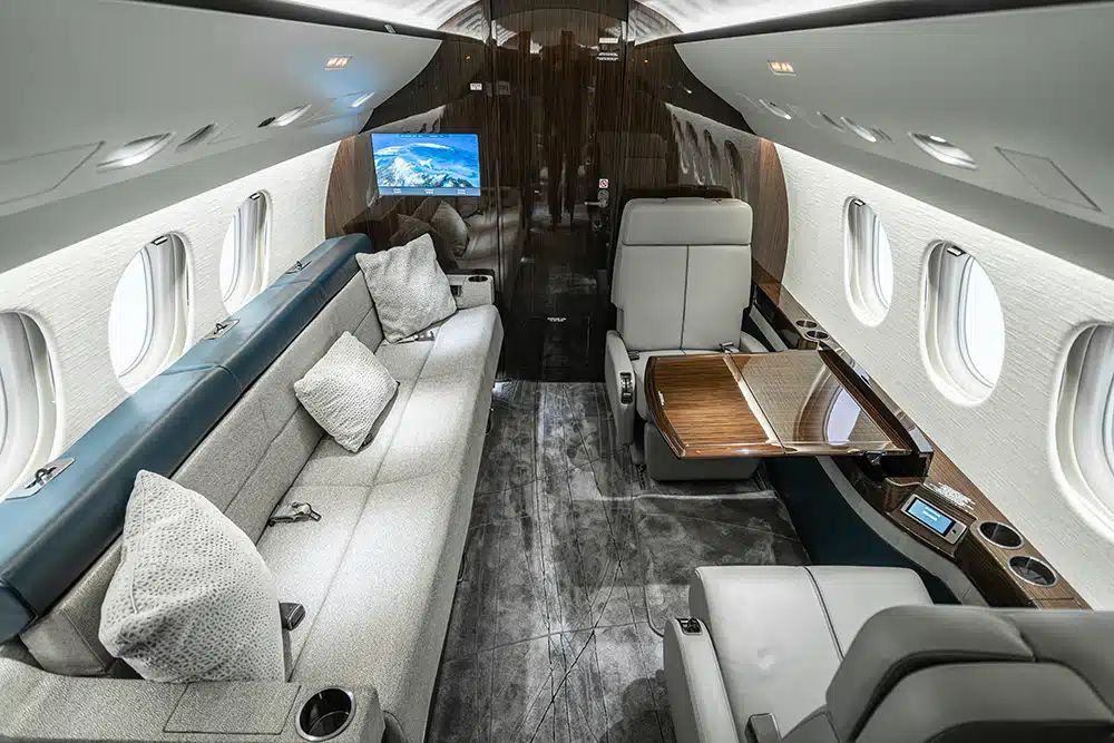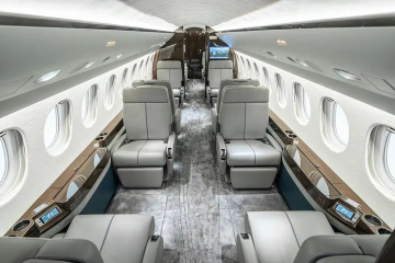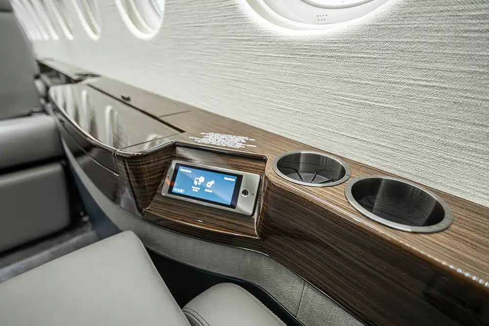 Nine passengers, double club configuration with aft belted lav. Forward galley and storage. Light gray leather seating and carpet, lowgloss dark-tone wood veneer. New in April 2023 by Duncan Aviation. |