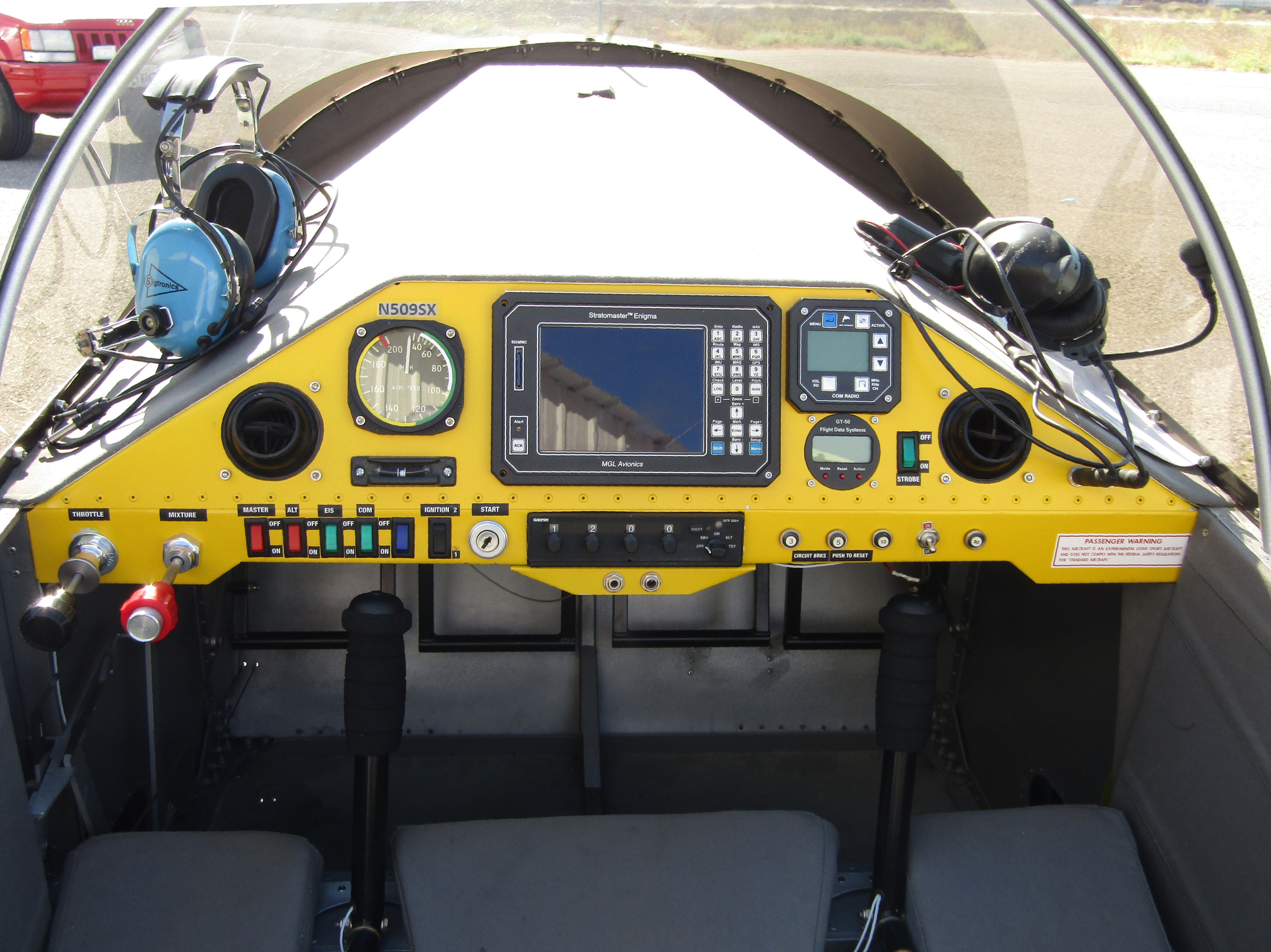 MGL Avionics EFIS with CHT (6) EGT (2) oil temperature and pressure fuel level outside temperature speed rate of climb altitude terrain warning Flight Data Systems GT-50 includes Clock, Timer, G-Meter, & Voltmeter MGL Avionics Com Garmin GTX 320A Transponder |