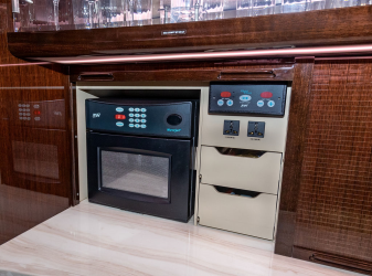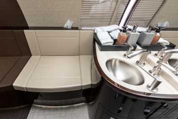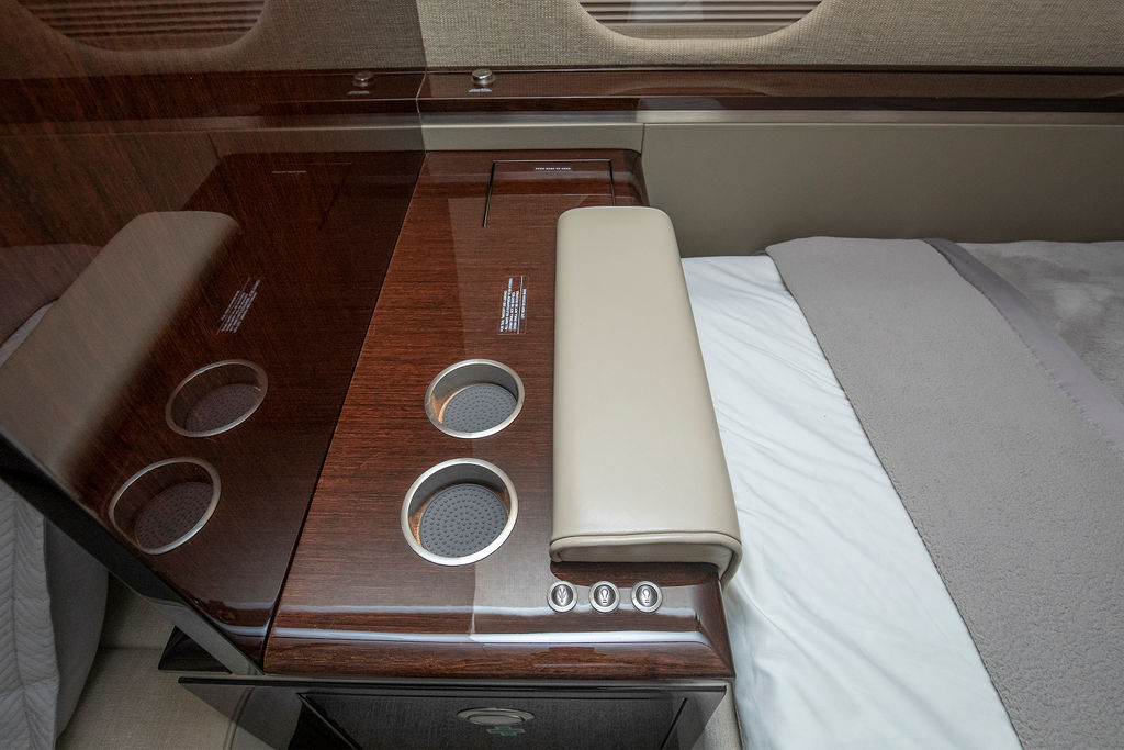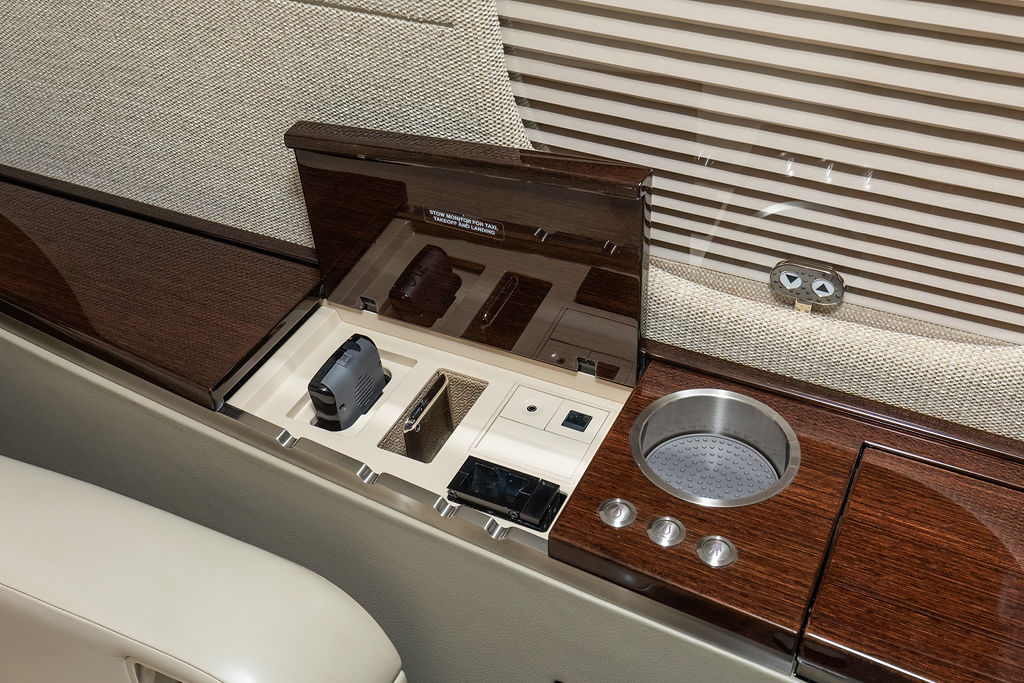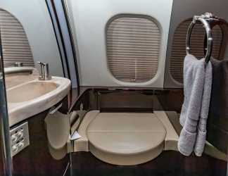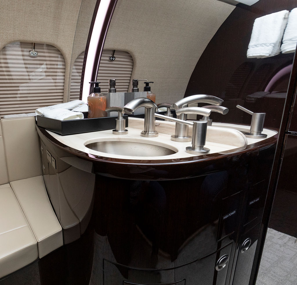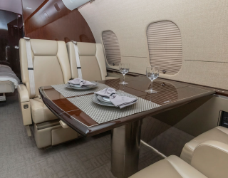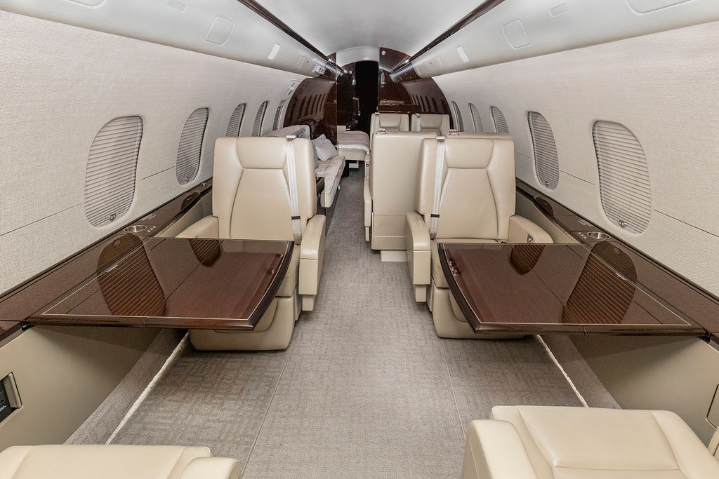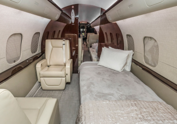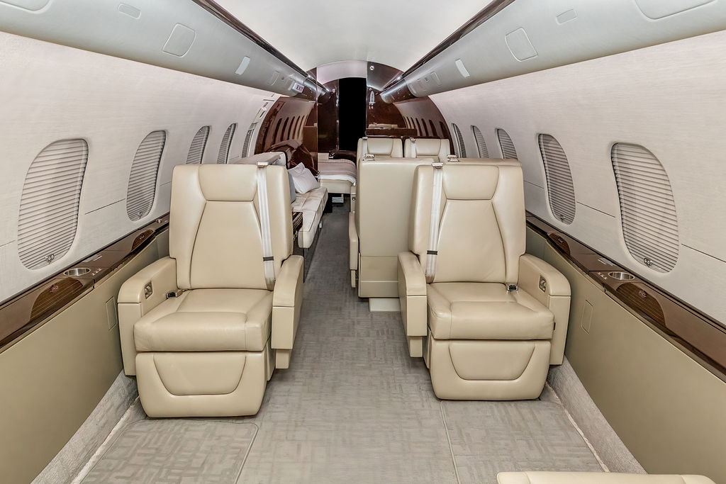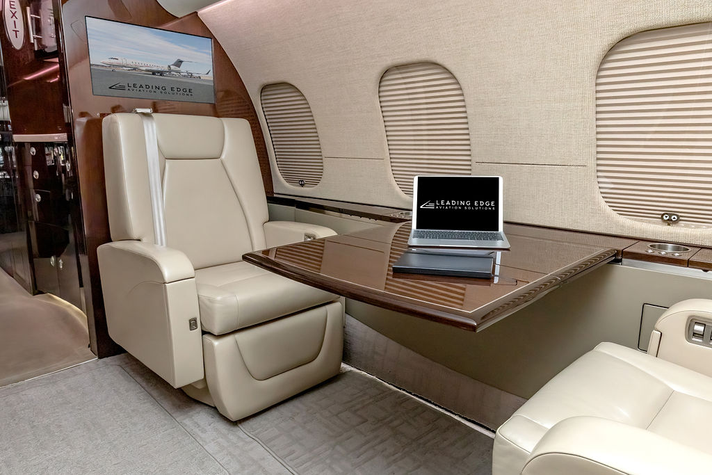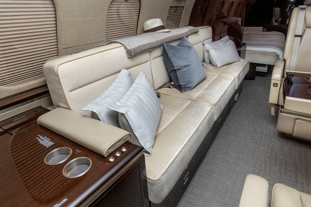 Twelve (12) Passenger Interior features a forward galley, forward crew lav and aft main lavatory area. The main cabin has a four single club chairs with two fold out tables. Mid-Cabin features a four place conference group with table opposite a 2-place divan (divan has seating for 3 but is legal for 2 passengers for take off and landing) The private aft cabin is separated by a pocket door and includes two-single club chairs opposite a 9G divan that folds into a wide bed. There is a full service aft lavatory with a toilet, sink and mirror. All club chairs are covered in a light beige leather and divan in a matching light beige fabric. There is a medium-tone grey pattern carpet throughout. Carpet replaced in 2015. There are two 24 inch HD monitors in the cabin and two ipod cradles. Equipped with Interactive Airshow ASXI. |