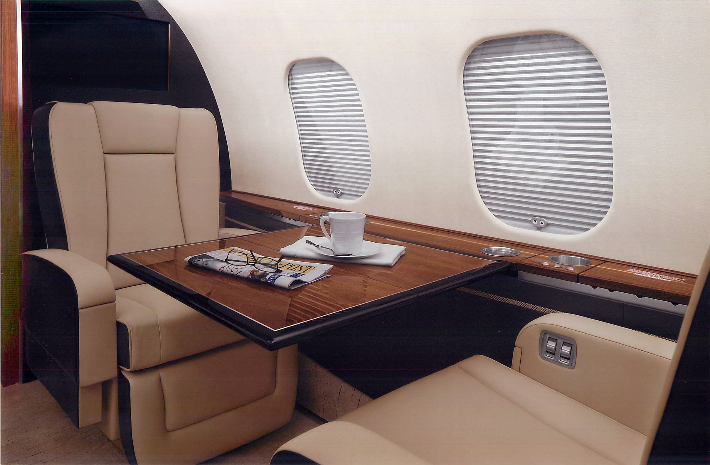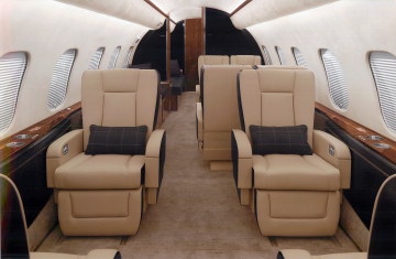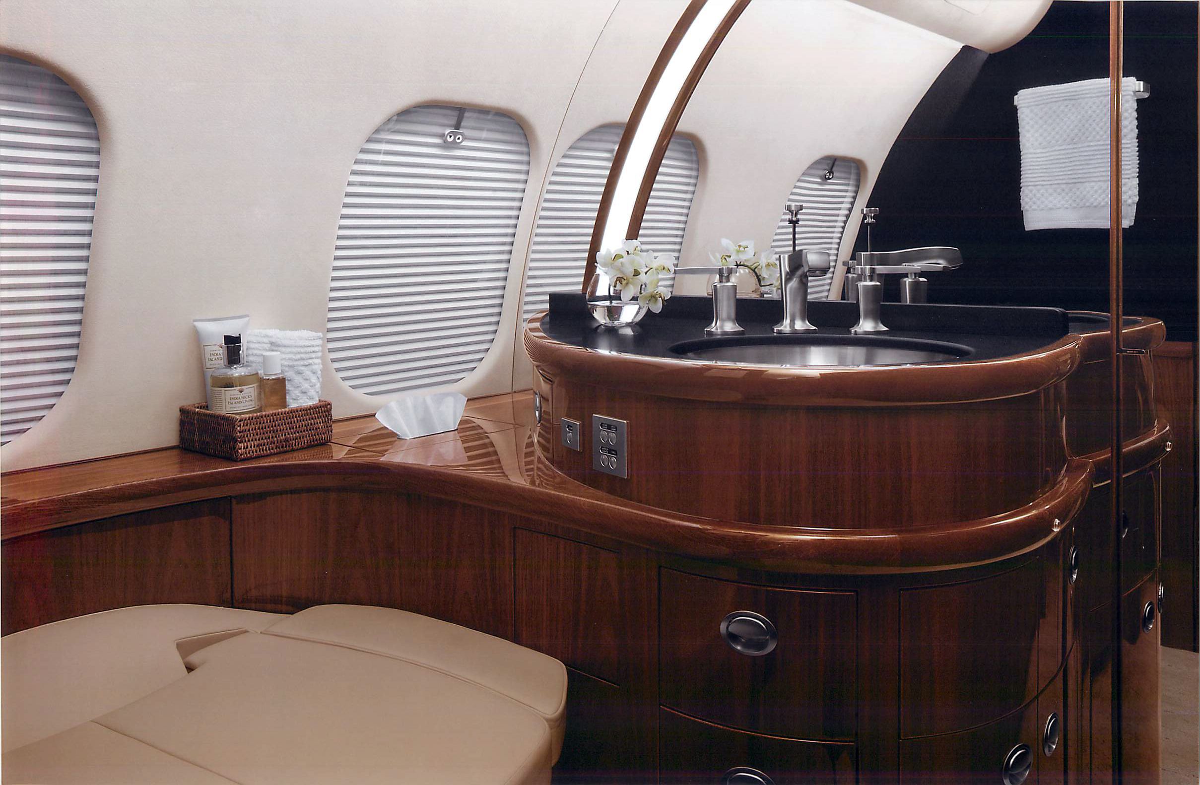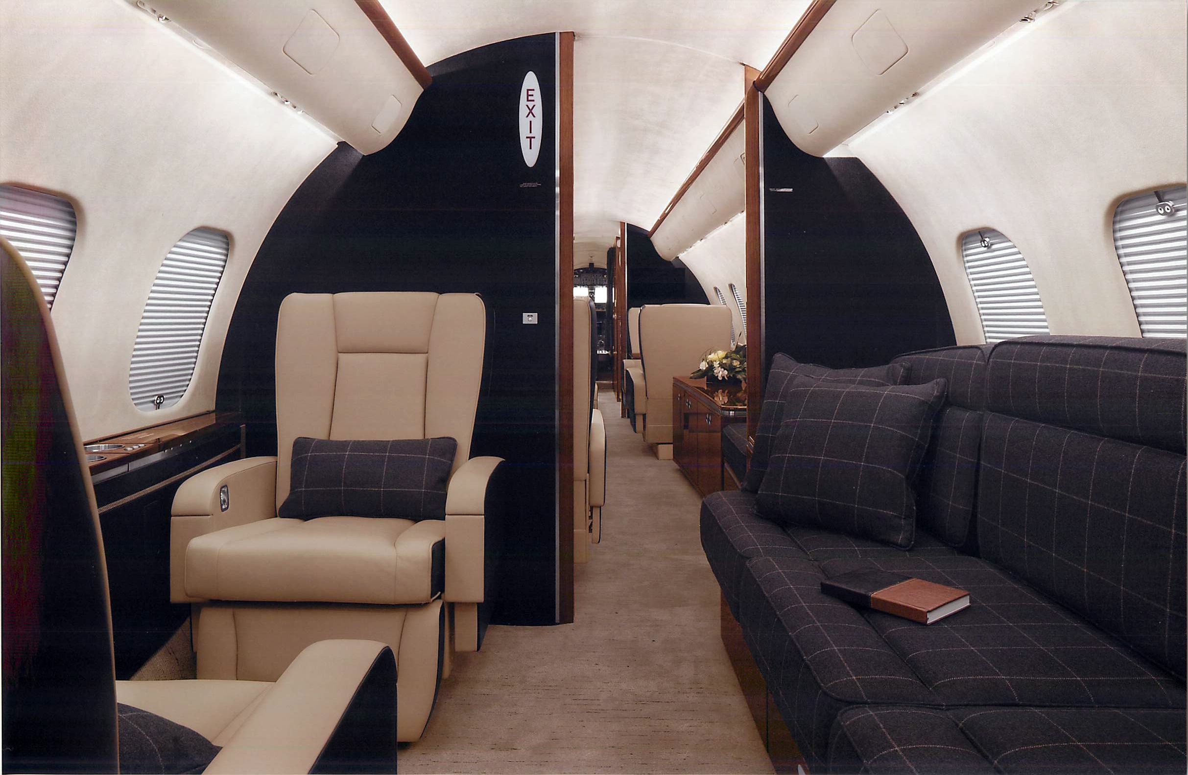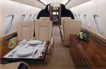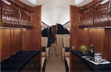 Exquisite Thirteen (13) Passenger & Three (3) Crew Floorplan w/Enhanced Soundproofing. With a focus on both luxury and functionality, every detail was carefully considered to ensure comfort and convenience for passengers. From the oversized galley and galley annex to the thoughtful features like the rain deflector and canopy at the main entrance, it’s evident that this aircraft prioritizes both style and practicality. The extended galley provides ample space for food preparation, while the different cabin zones offer a variety of seating arrangements to accommodate various needs and preferences. Whether passengers prefer a cozy club setting, a more formal conference setup, or a comfortable divan for relaxation, there’s something for everyone. The inclusion of a large LCD monitor and a Hi-Lo conference table in zone two provides a well-equipped setting for business meetings or entertainment during flights. The enlarged aft passenger lavatory adds an extra touch of comfort and convenience. Zone 1: Four (4) Place Club Zone 2: Custom Credenza w/24” LCD Monitor Opposite a Four (4) Place Conference Group Zone 3: Three (3) Place 16G Berthable Divan Opposite a Two (2) Place Club Cabinetry ..............Sapele Gloss Plating....................Satin Chrome Colored Countertops ........Night Sky Corian Headliner ..............Toast Colored Tapis Suede Seating...................Townsend Leather |