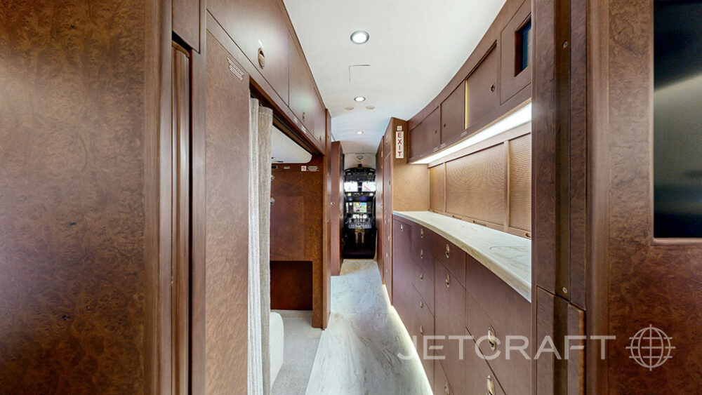 Number of Passengers - Thirteen (13) Galley Location - Forward Forward Cabin Configuration - Four (4) Place Executive Club Mid Cabin Configuration - Four (4) Conference Group Opposite Single Seat Work Station Aft Cabin Configuration - Two (2) Place Club Opposite Three (3) Place Divan (When removeable mid/aft cabin bulkhead is removed) Lavatory Locations - Forward Crew and Aft Executive Crew Rest - Forward Jump Seat - Yes Last Refurbished Date - 2024 (Soft goods, Carpet, Entry Flooring, Galley Flooring, Lavatory Flooring, Galley and Lavatory Countertops) |