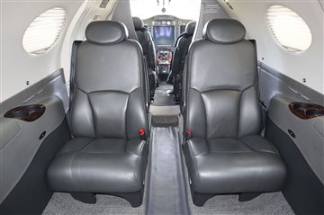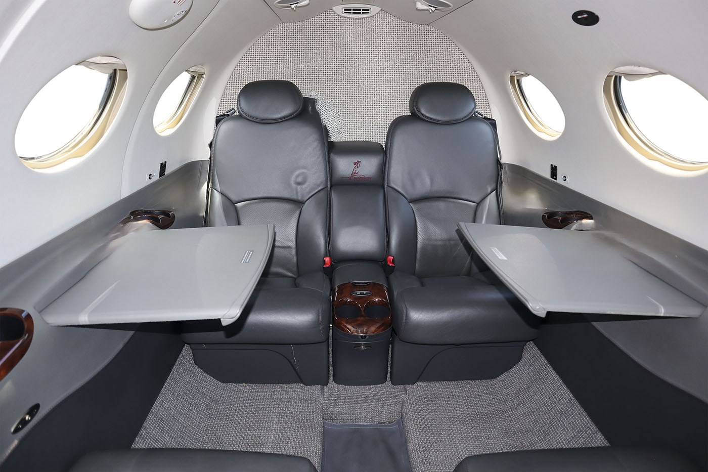 Custom Smoky Quartz Interior Color Scheme with leather topped tables and leather sidewalls. (New 10/31/2019). Cabin Cabin seating for 4 passengers Left-hand and right-hand forward storage cabinets Dual executive tables Aft center console Forward side-facing non-belted toilet |