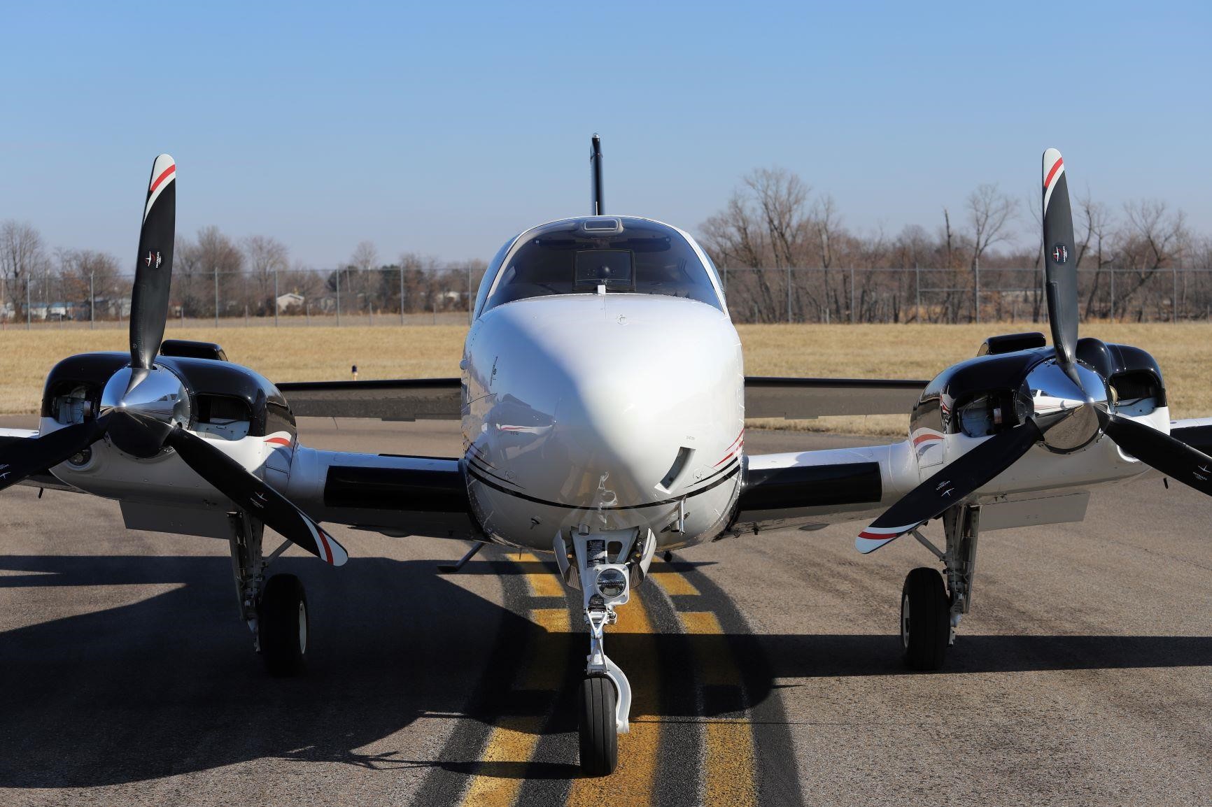 Damage Notes: Minor damage history July 2016 @ 261 hours total time. Aircraft landed long resulting in both propellers striking runway threshold lights and kicking up debris onto right nose gear door and right nose skin. Both skins replaced with factory new parts. Engines sent to G&N Aircraft, Inc. for tear down inspection and repair. Both propellers overhauled by Aircraft Specialists. |