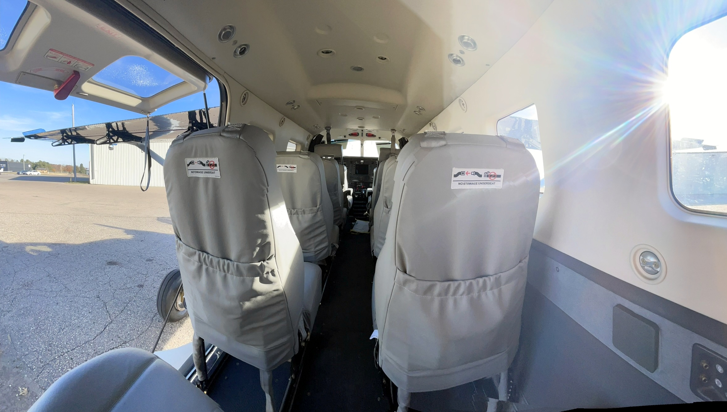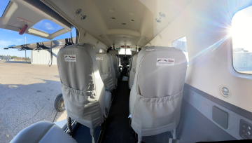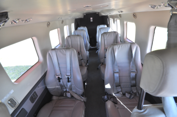 The aircraft is equipped with the Timberline seating package in grey leather, with space for 9 passengers.  Cup holders, headset plugins, and USB charging ports at each place.   |
