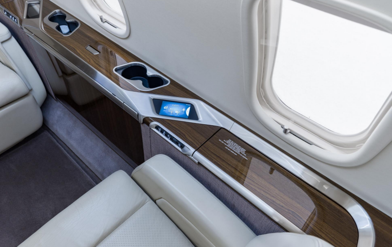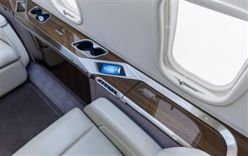 The cabin is arranged in a forward double-club configuration, followed by an aft double-club and a fully belted aft lavatory seat. Light beige leather seating, high-gloss walnut wood accents, and a gray patterned carpet elevate the interior, while clean lines and optimized lighting create a quiet, inviting environment throughout the flight.