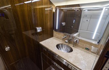 At the rear, the aircraft features a private aft lavatory with a belted seat.