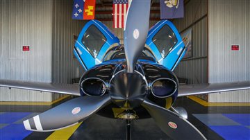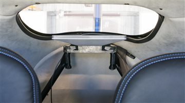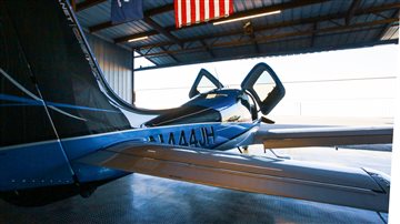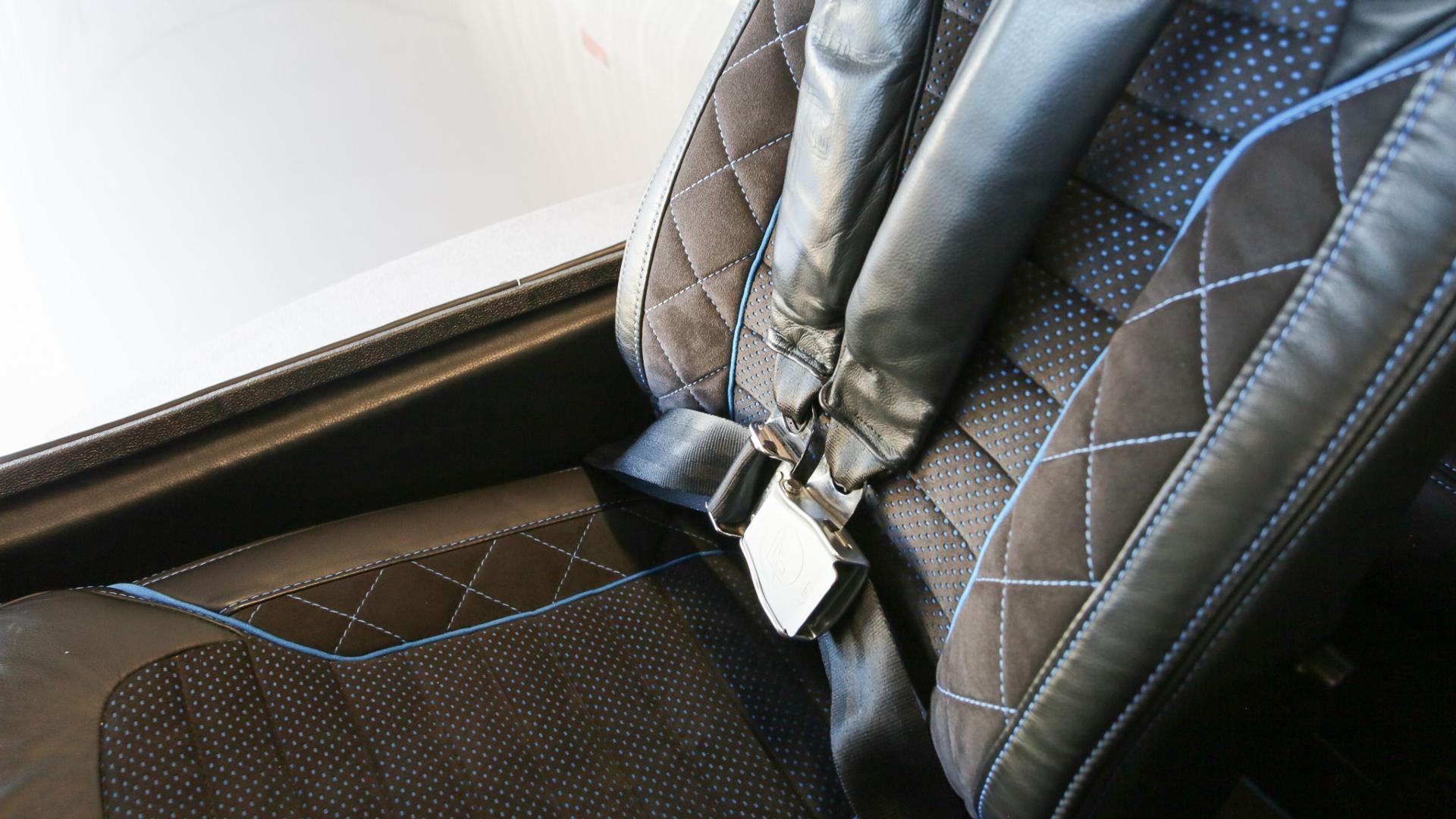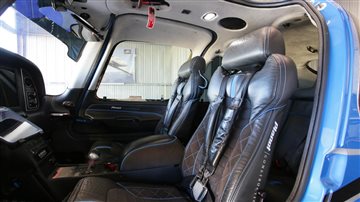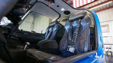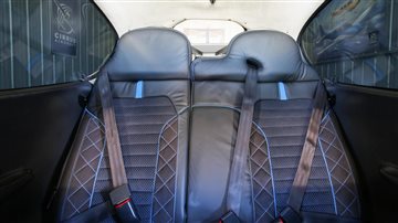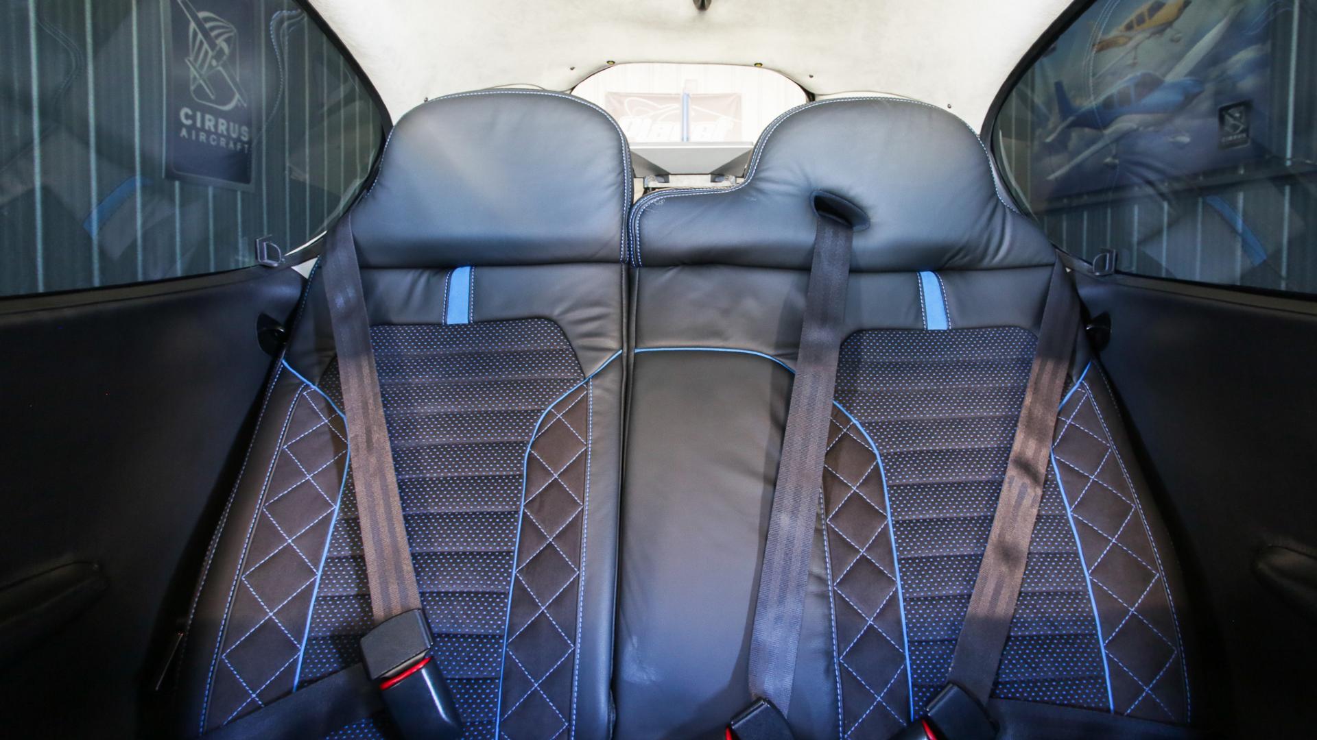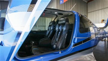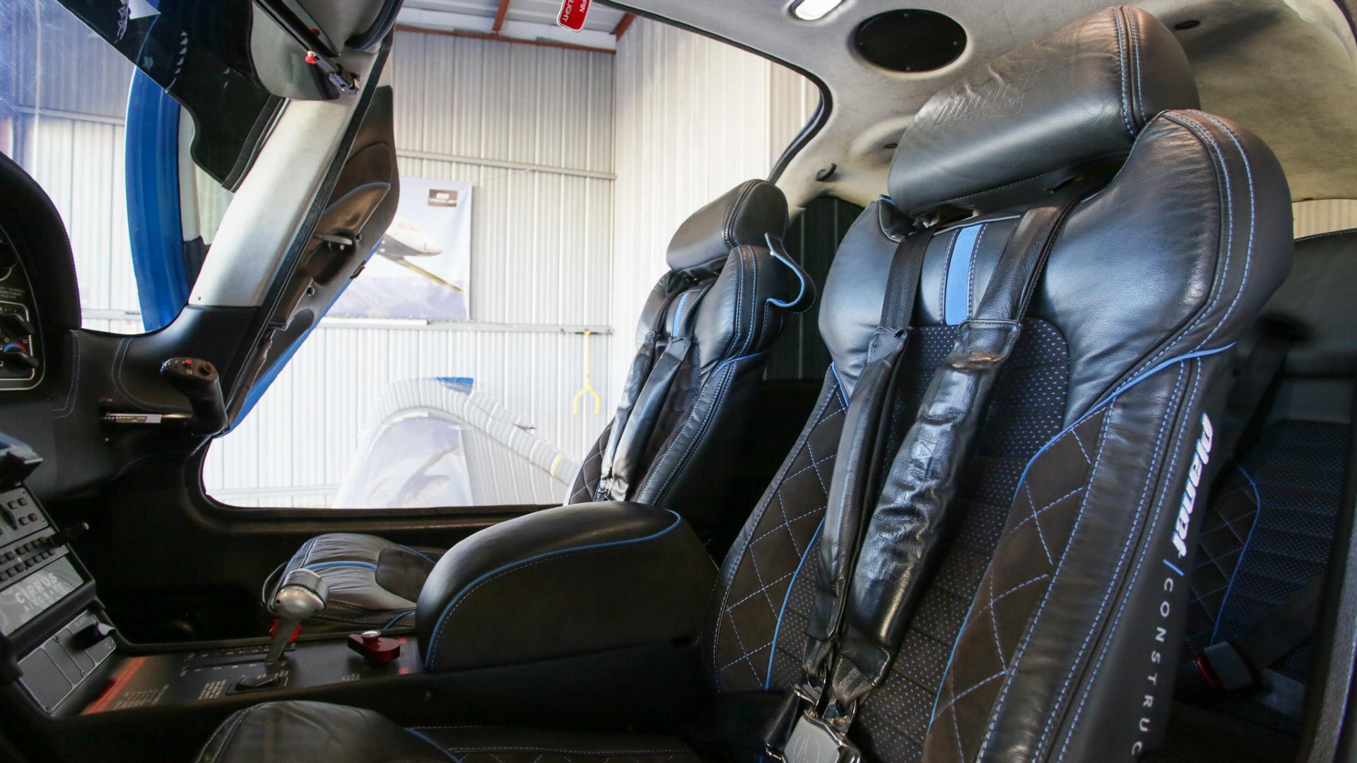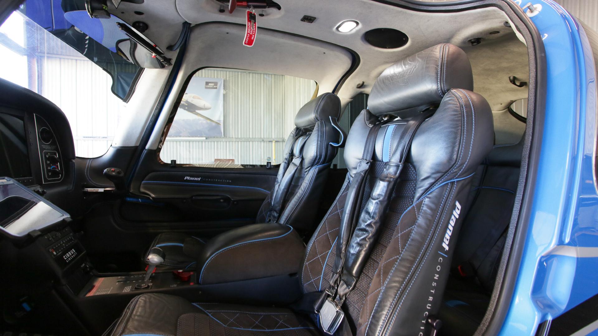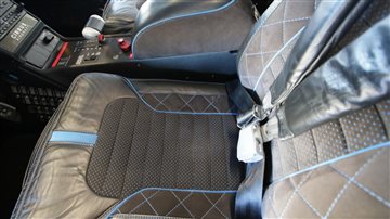 | The black leather seating immediately conveys sophistication, with blue accent stitching and trim that perfectly tie into the aircraft’s striking exterior paint scheme. The result is a cockpit that feels cohesive, sporty, and purpose-built for modern aviators. The seats are meticulously contoured for comfort, featuring premium leather surfaces that feel supple yet durable—ideal for long cross-country flights. The blue accents add just the right amount of flair, running tastefully along the seat bolsters, armrests, and door panels, giving the cabin a contemporary, custom look without being overstated. | |