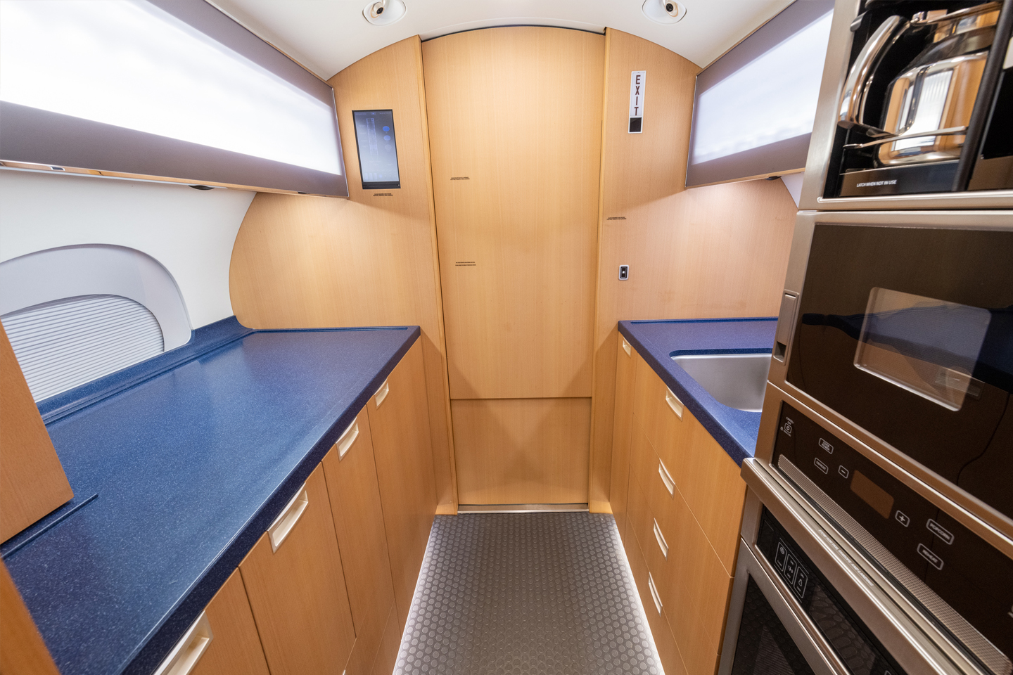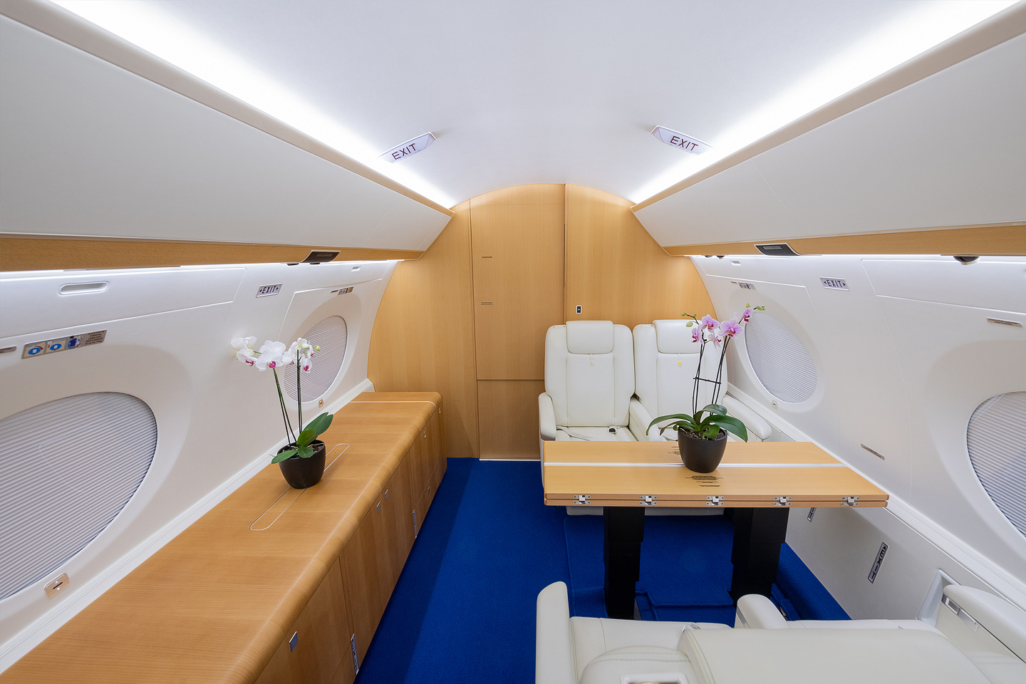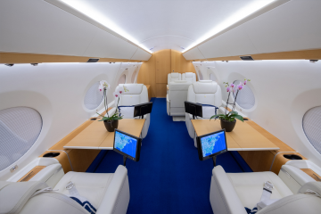 Cabin Layout: Fourteen-Passenger ConïŹguration, Forward Crew Rest Forward Cabin: Four-Single Club Seats Mid Cabin: Four-Place Conference Group opposite a Credenza Aft Cabin: Two Three-Place Divans Galley: Forward Galley includes Convection Oven, Microwave, and Two Coffee Makers Lavatory: Forward Crew Vacuum Lavatory and Aft Vacuum Lavatory |